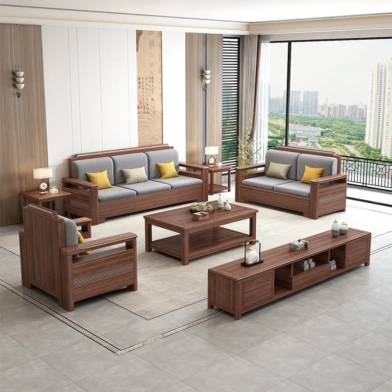 Yamakaja Walnut Solid Wood Sofa Set - New Chinese Style Living Room Combination for Small Spaces, Versatile Winter & Summer Use, with Storage and Fabric Upholstery