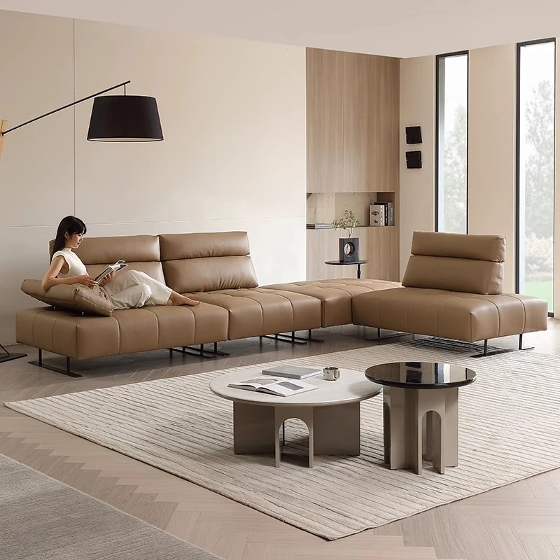 Yunxin Luxury Leather Corner Sofa - Genuine Top-Grain Cowhide, Adjustable Backrest, Movable Design, Perfect for Spacious Villas and Large Living Rooms, Elegant Chaise Lounge Style.