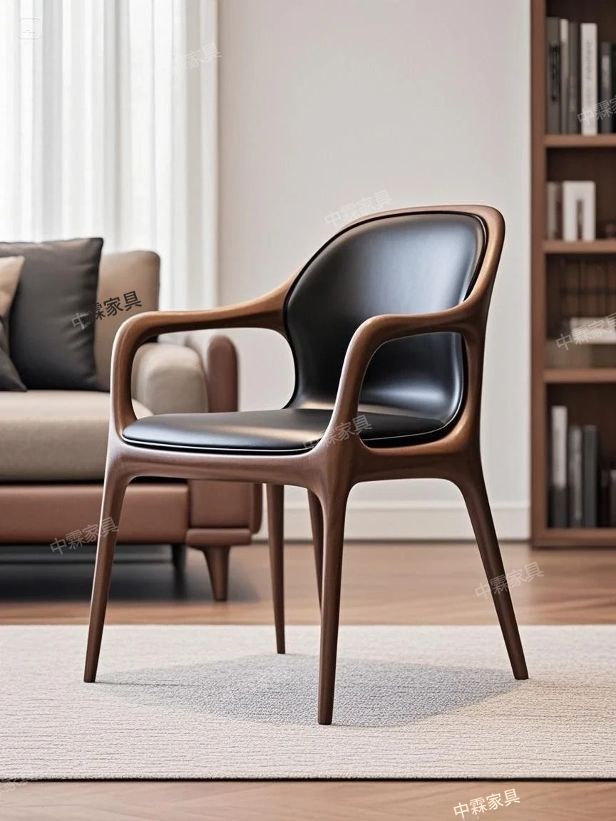 北米産ブラックウォールナット無垢材使用!本革仕上げのモダンな軽奢書椅子・ティーチェア。別荘や家庭でのリラックスに最適なデザイン。快適さとスタイルを兼ね備えた一品です!