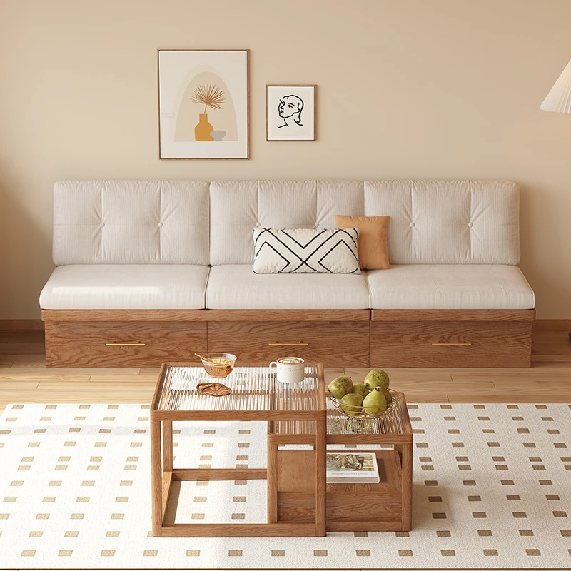 Japanese Style Solid Wood Sofa - Versatile for All Seasons, Perfect for Small Living Rooms, Drawer Storage, Armless Design, Straight Platform Sofa