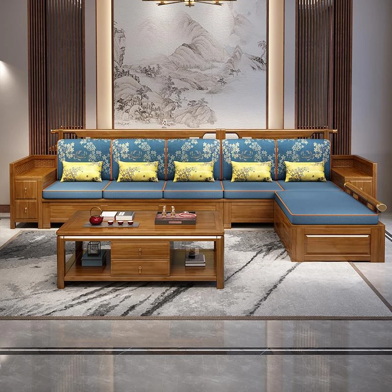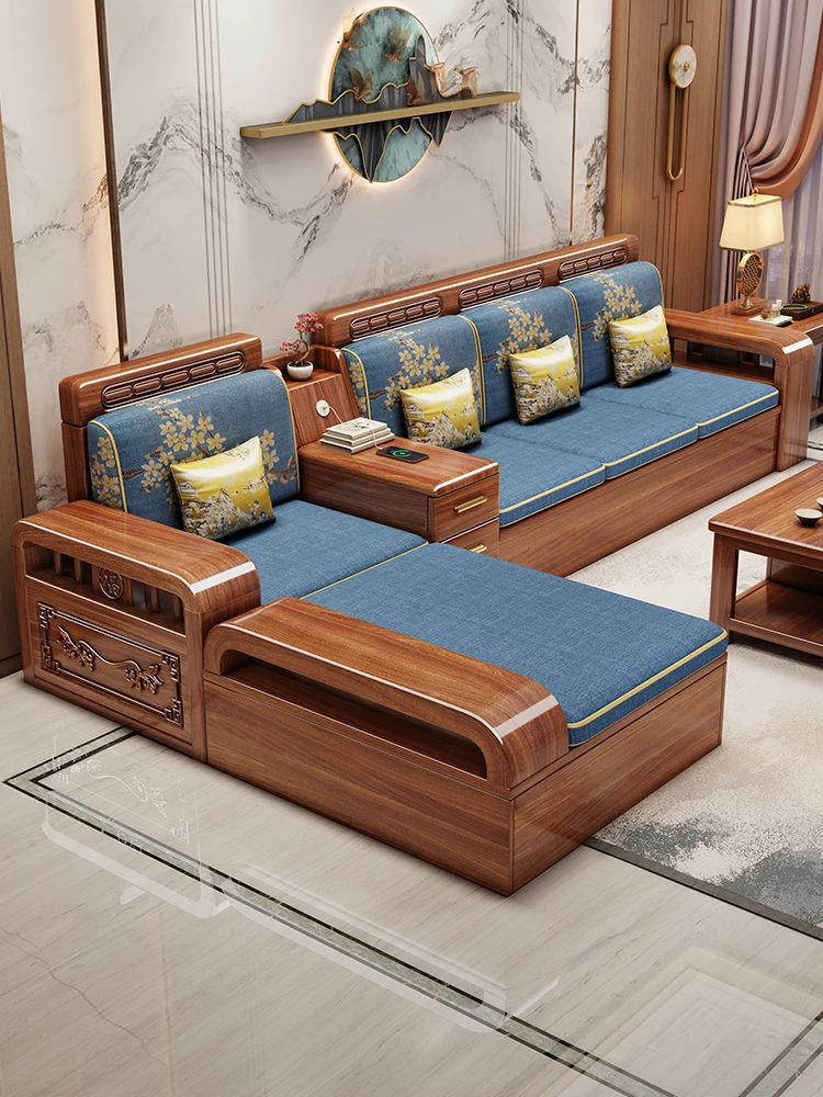Walnut Solid Wood Sofa Set for Living Room - Modern Chinese Style, Space-Saving Design for Small Apartments, Dual-Season Comfort, with Storage Options
