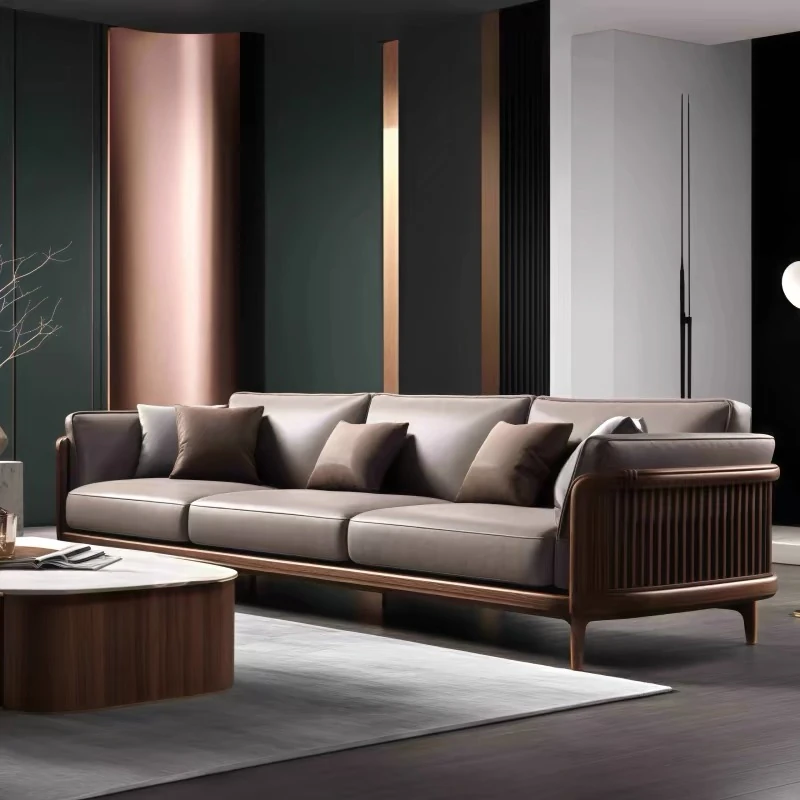 Modern Chinese Solid Wood and Leather Sofa Set - Song Aesthetics for a Contemporary, Minimalist Living Room with Luxurious Italian Design in Genuine Leather.