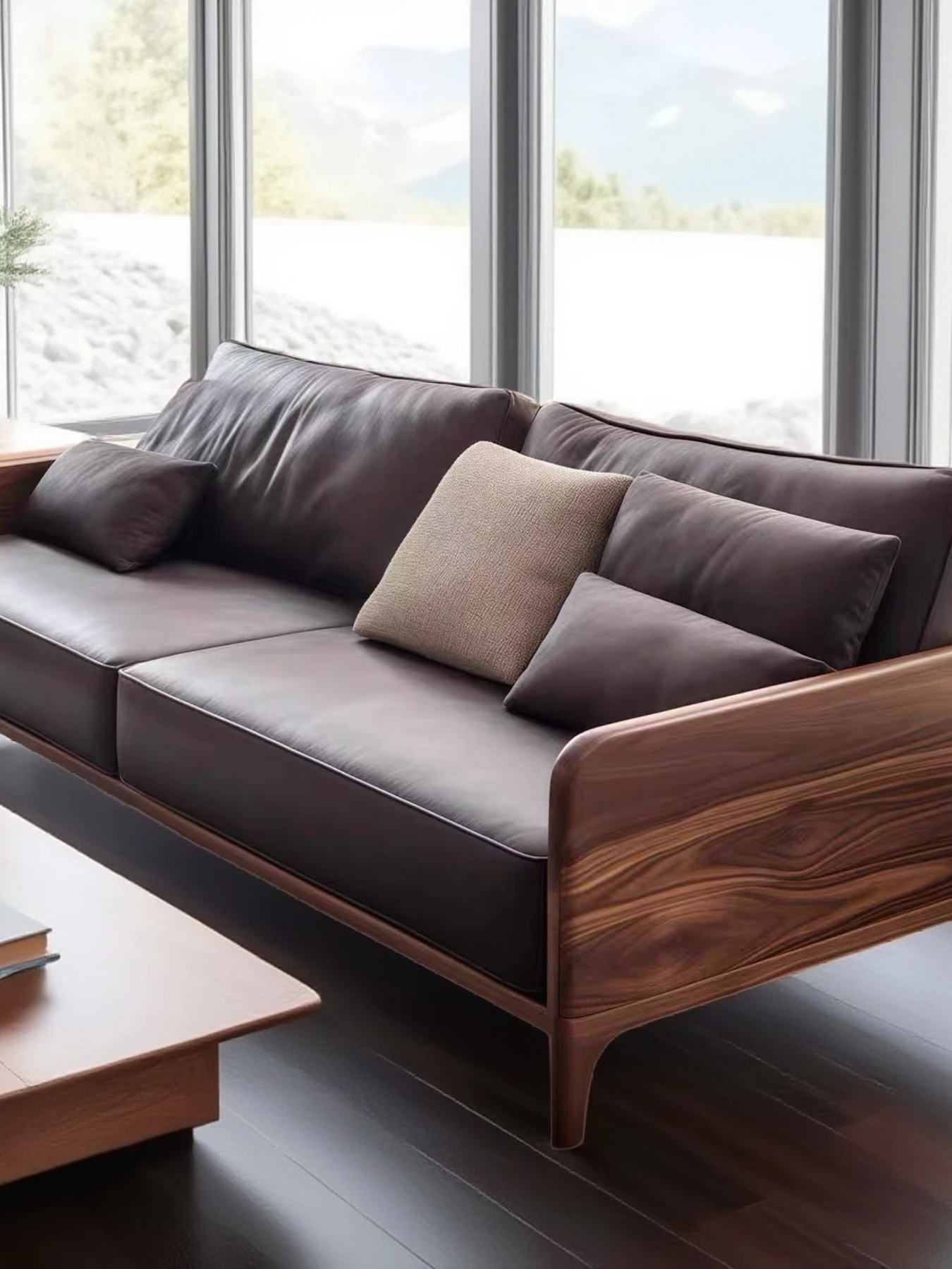 Elegant Minimalist Solid Wood and Genuine Leather Sofa - Modern Chinese-Style High-End Zen Aesthetic Design for a Luxurious Living Space