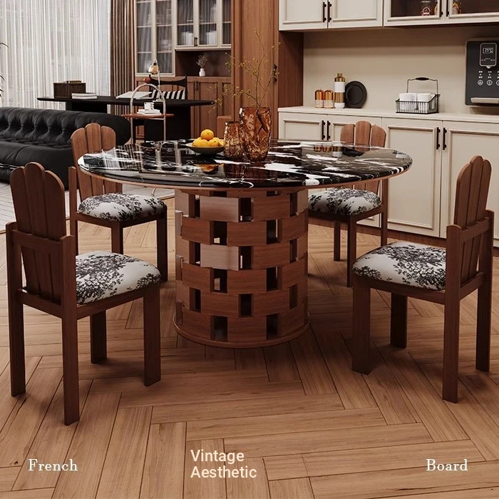 Lush Tree French Vintage Black Marble Round Dining Table - Luxurious Solid Wood Retro Style Round Table with Chairs for Home Use