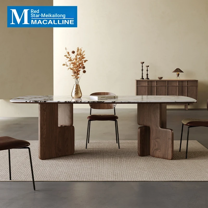 European-Style Solid Wood Dining Table with Master Design - Luxurious Rectangular and Oval Clover-Shaped Marble Top, Perfect for Elegant Dining Experiences