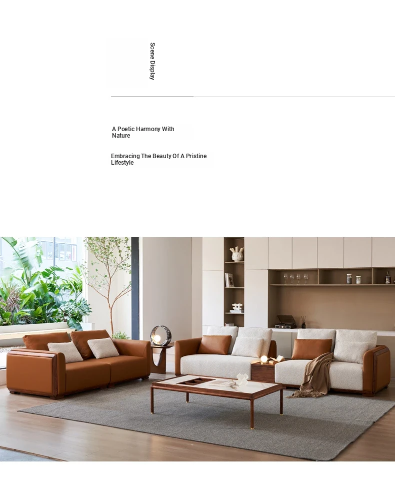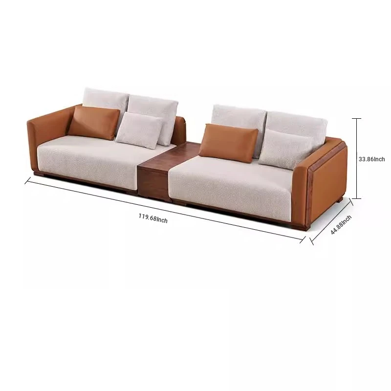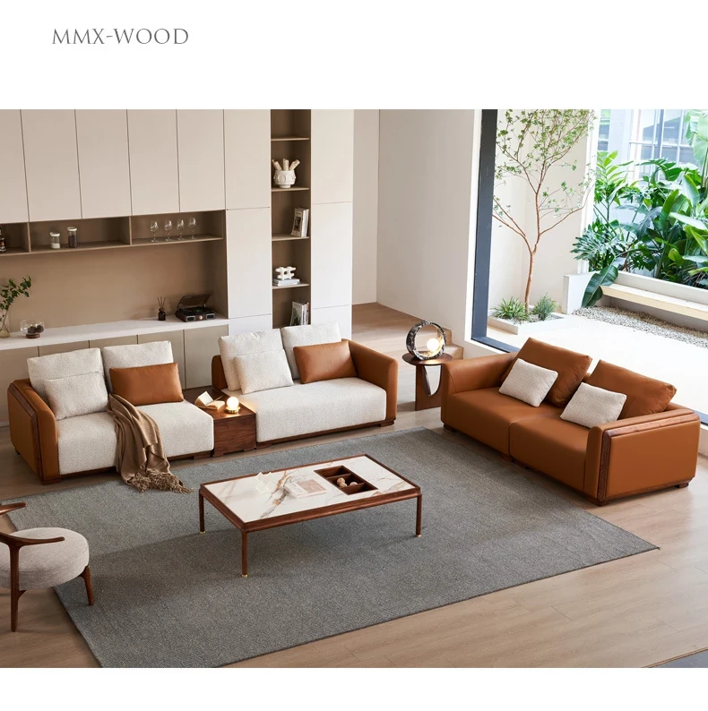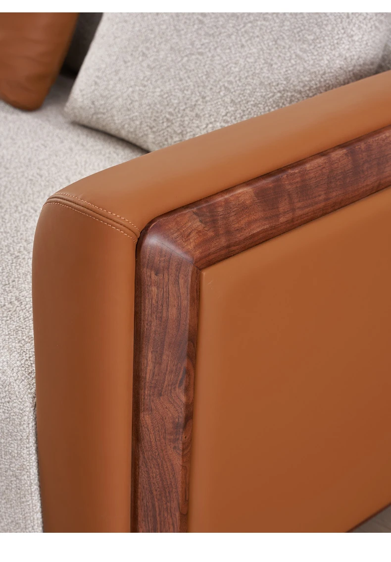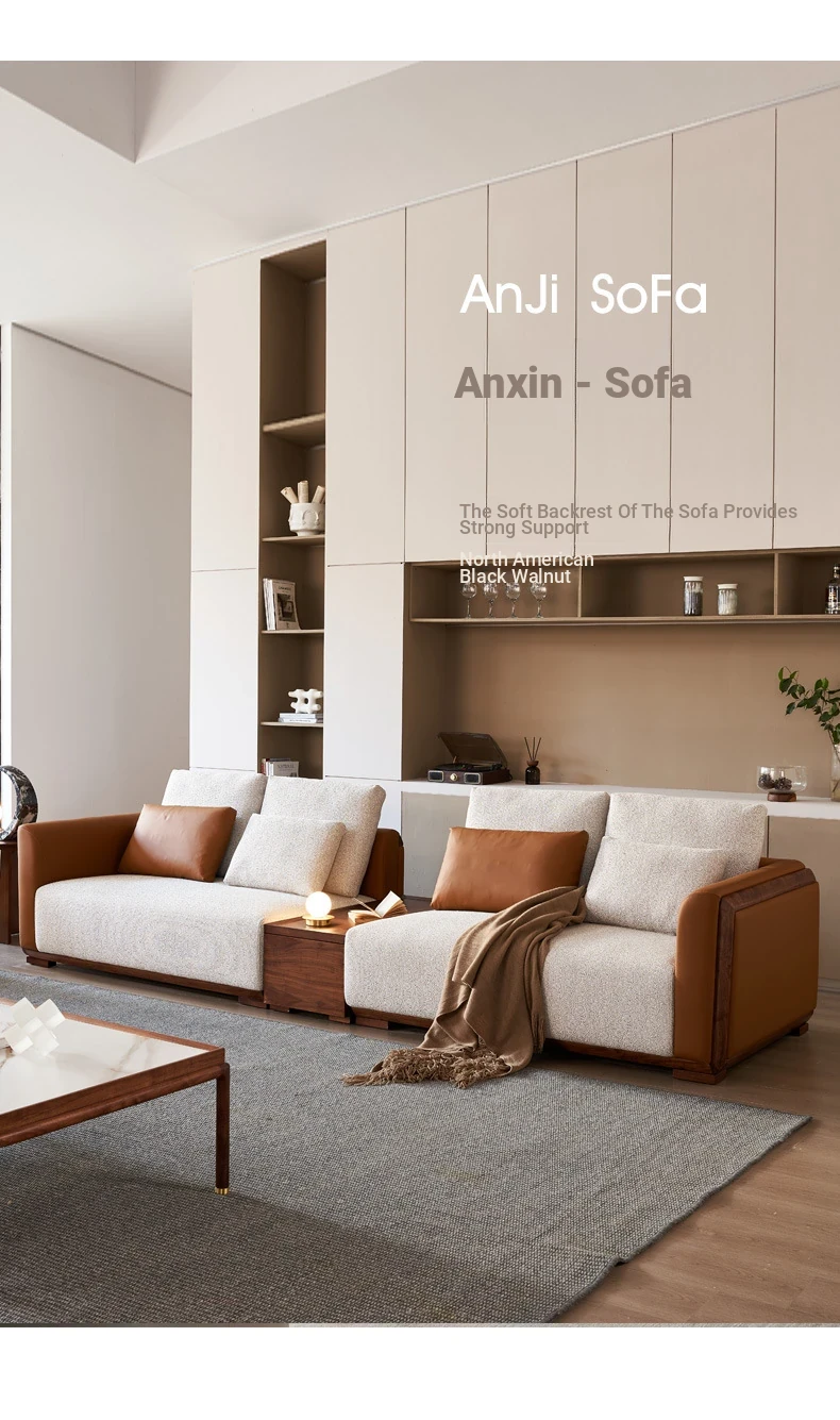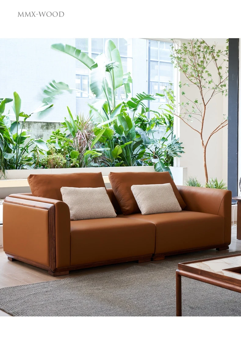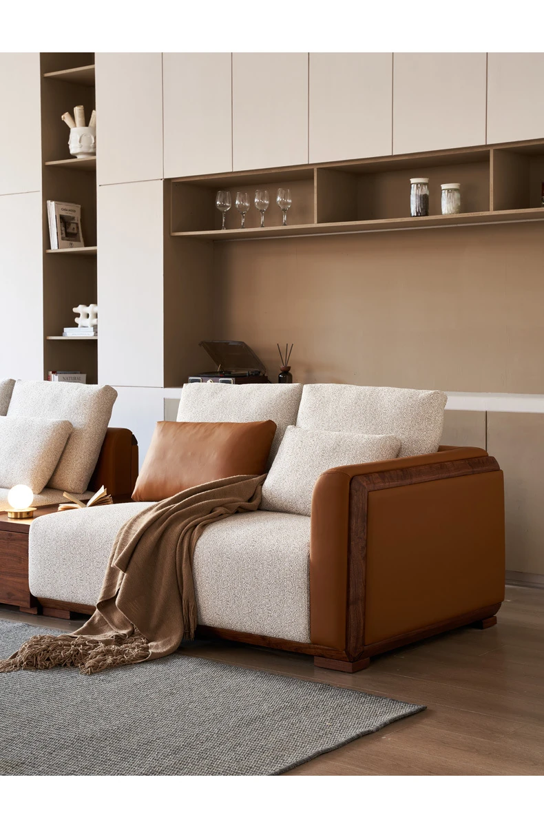 Elegant Minimalist Black Walnut Solid Wood Sofa with Genuine Leather and Fabric - Perfect for Spacious Villas and Modern Living Rooms