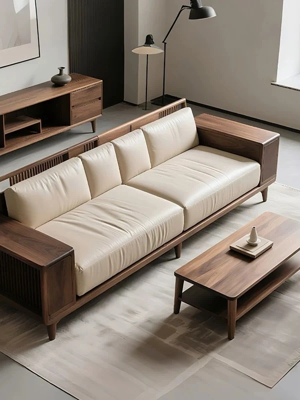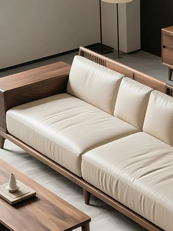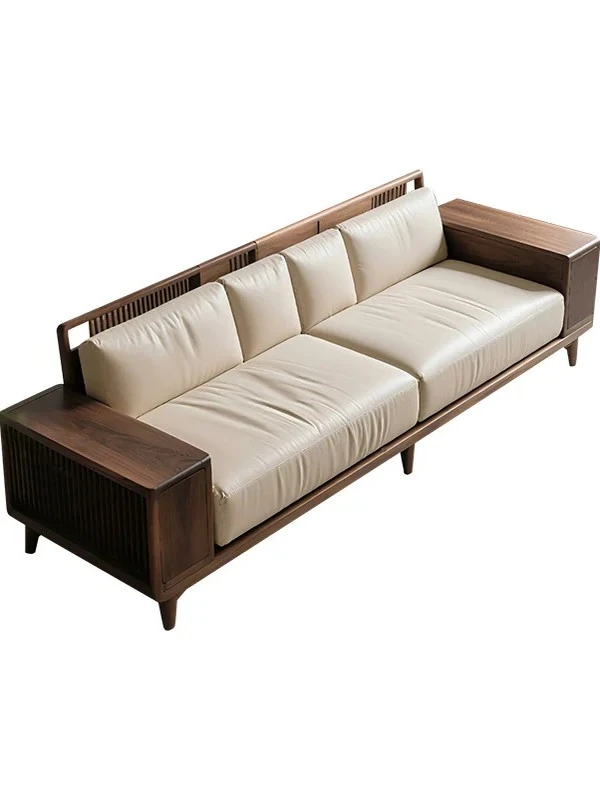 Elegant New Chinese Style Solid Wood Genuine Leather Sofa - Minimalist Modern Design for Luxury Living Rooms, Hotels, and Villas - Embrace Song Dynasty Aesthetics with High-End Comfort
