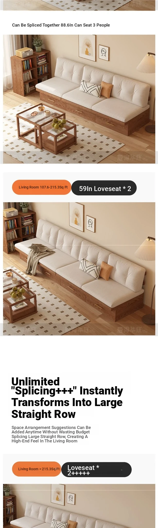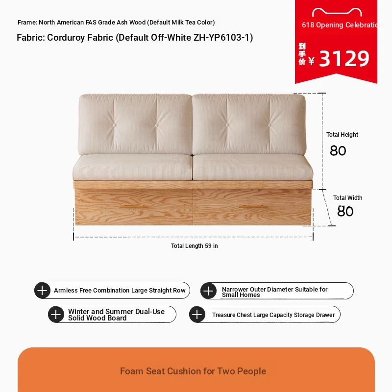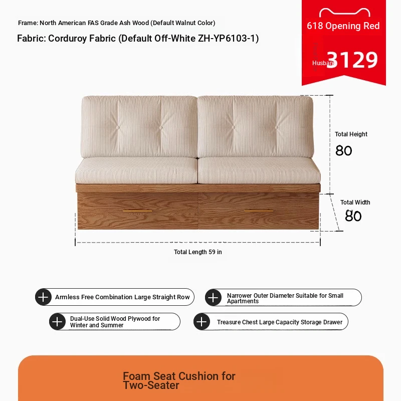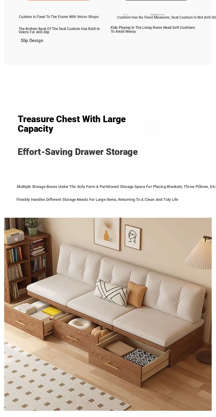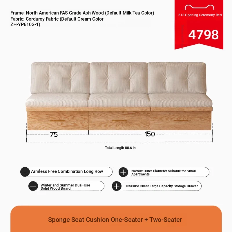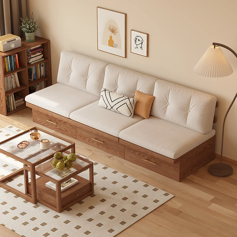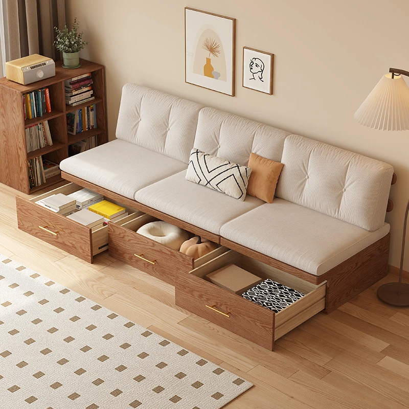 Japanese Style Solid Wood Sofa - Versatile for All Seasons, Perfect for Small Living Rooms, Drawer Storage, Armless Design, Straight Platform Sofa