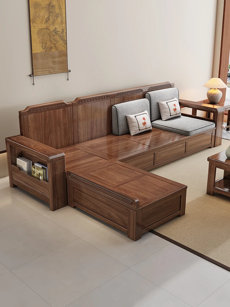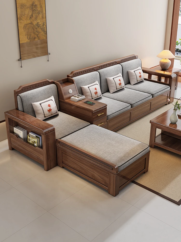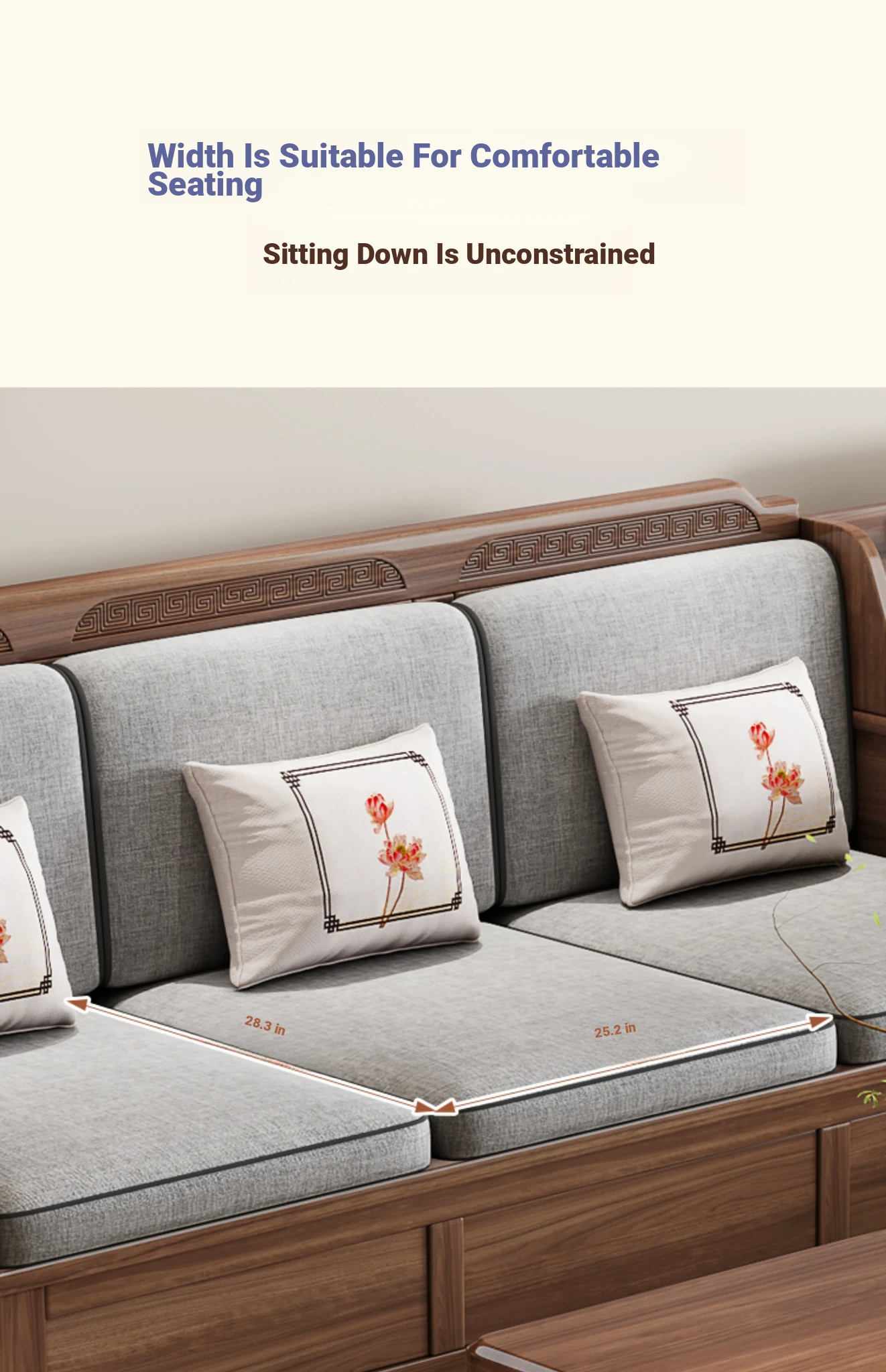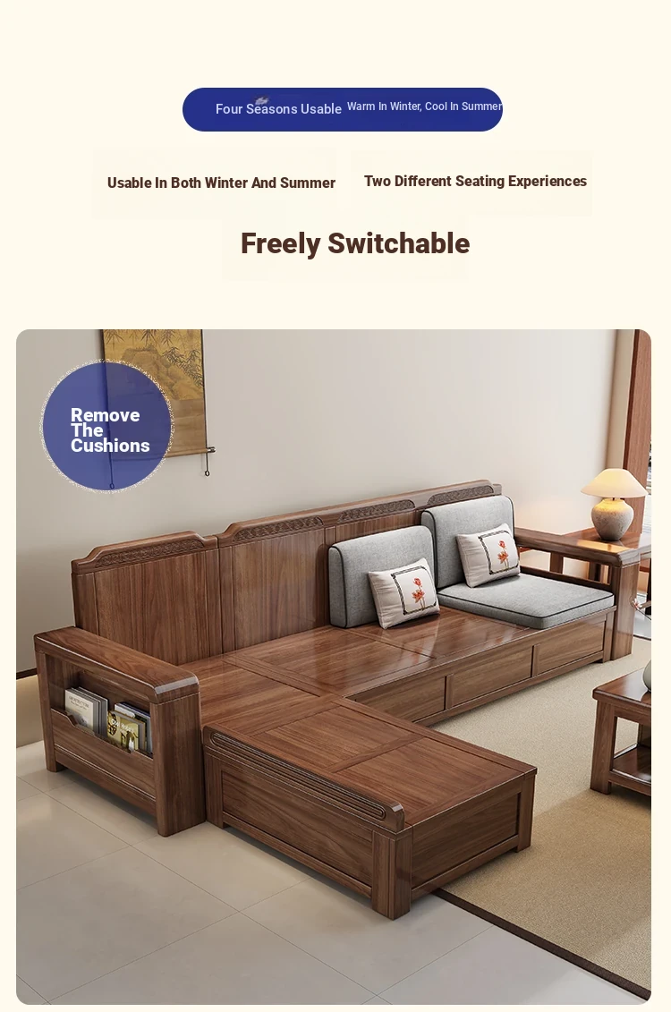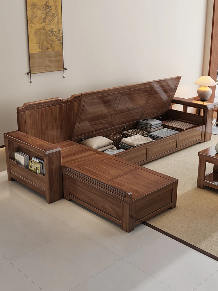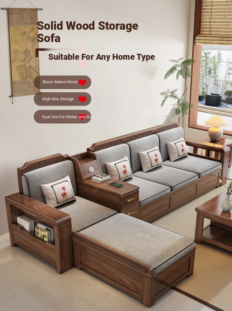 New Chinese Style Solid Black Walnut Wood Sofa - Versatile for Winter & Summer, Space-Saving Design with Storage, Direct Factory Sale for Your Living Room