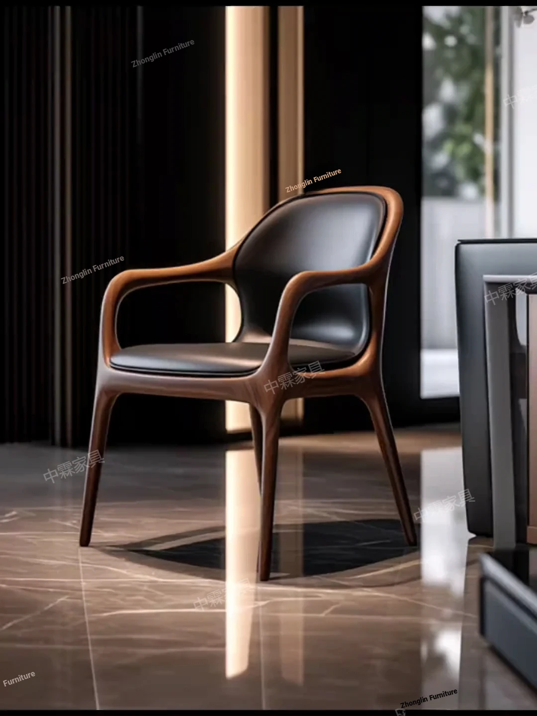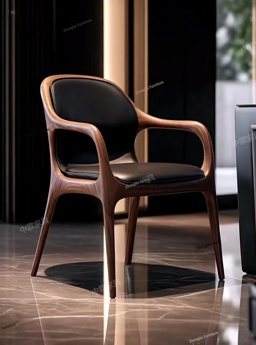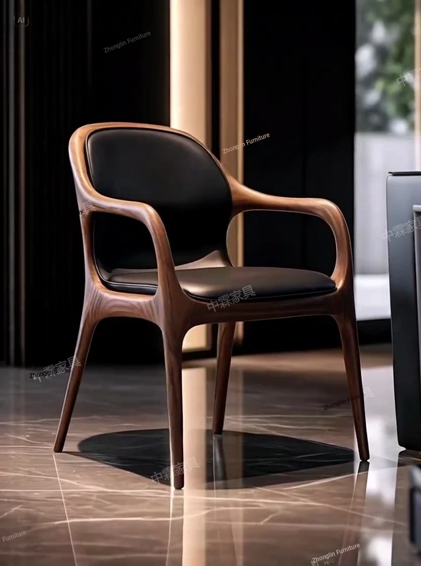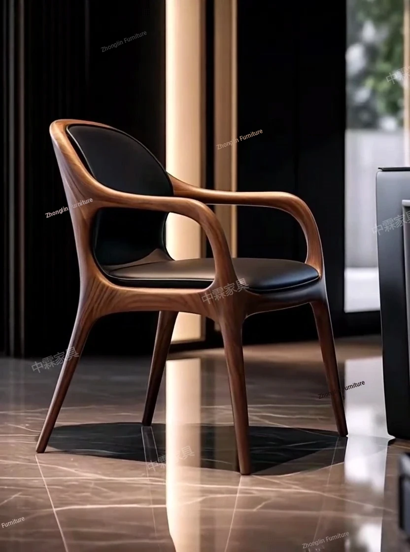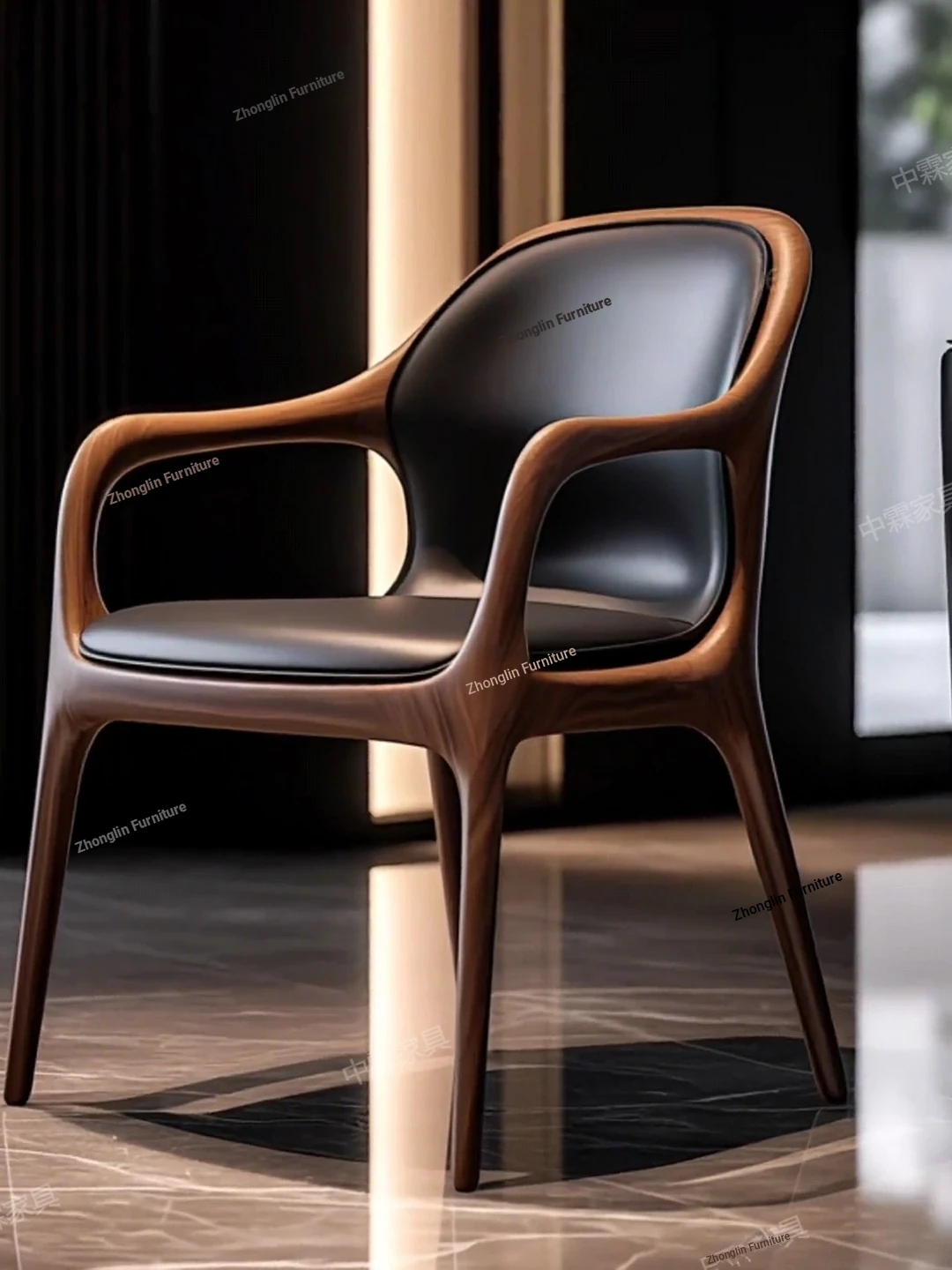 North American Black Walnut Solid Wood Tea Chair with Backrest - Designer Leather Dining Chair - Modern Light Luxury Leisure Sofa Chair