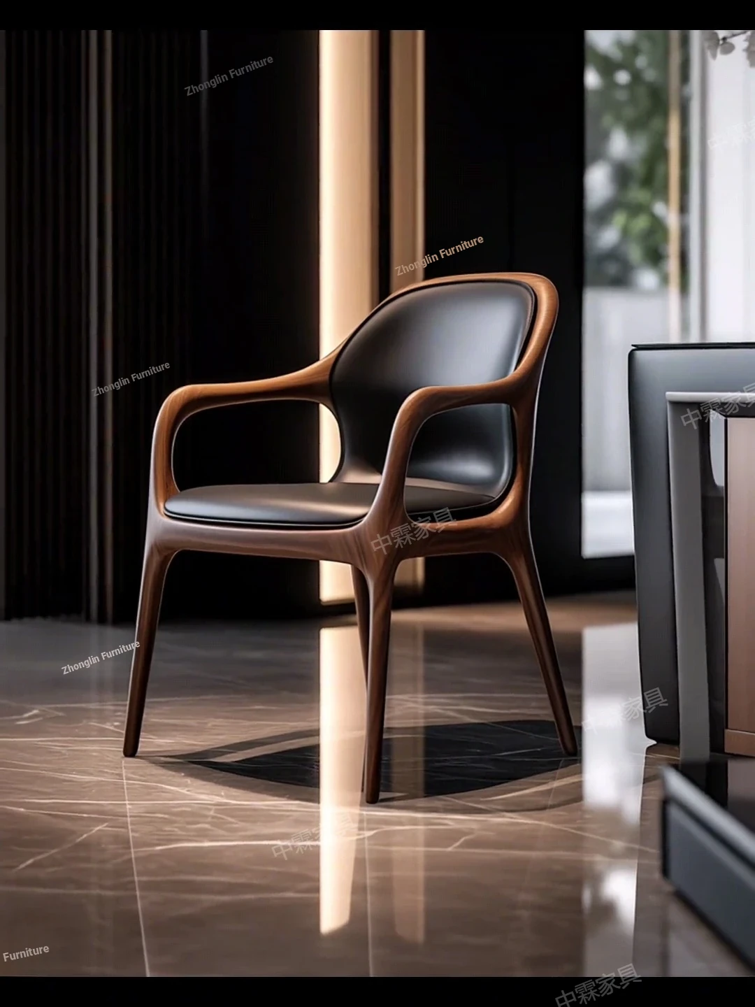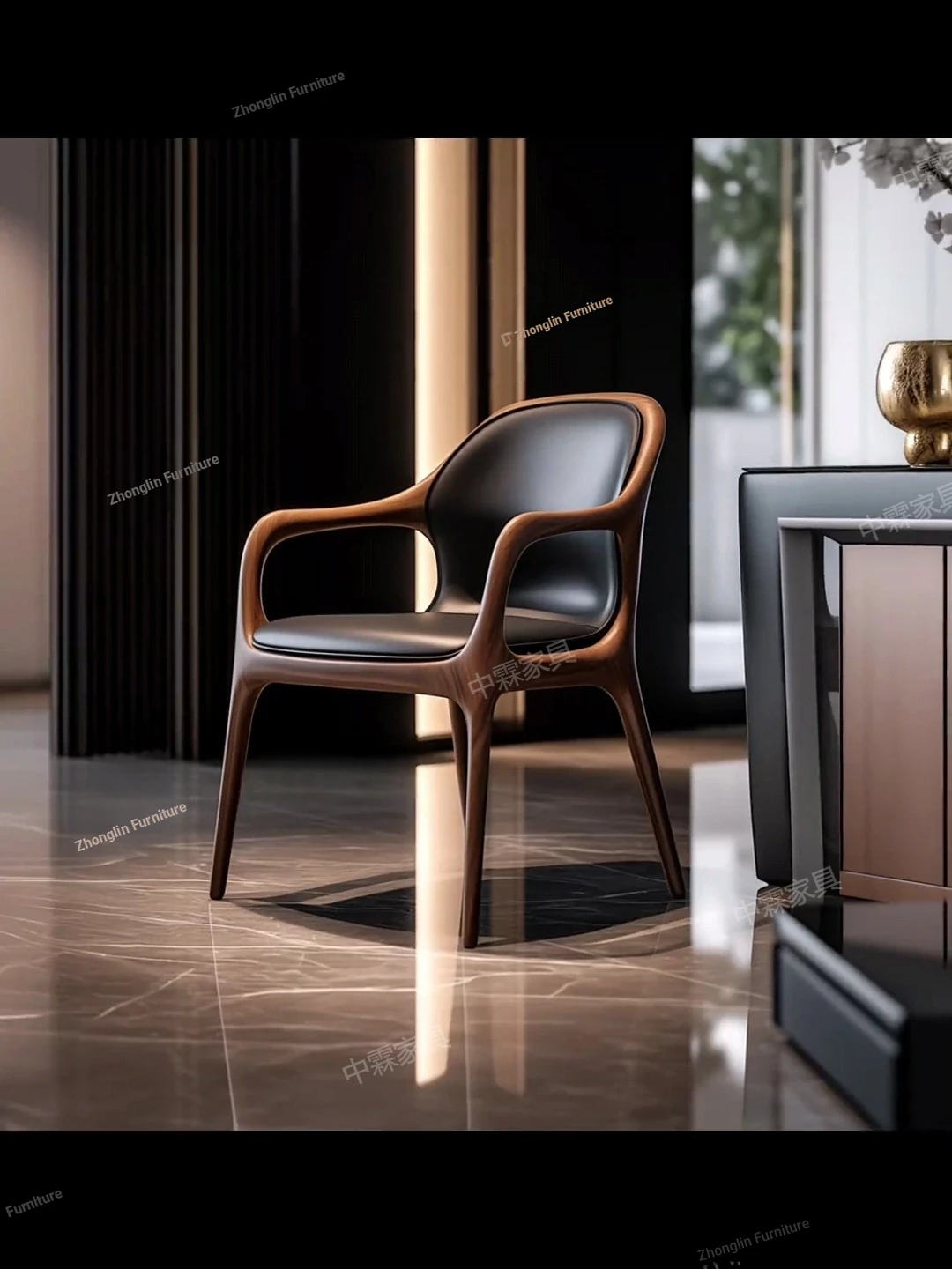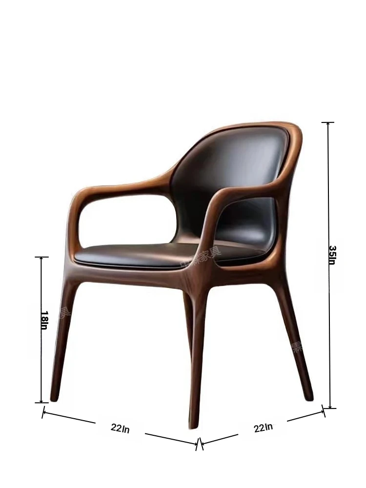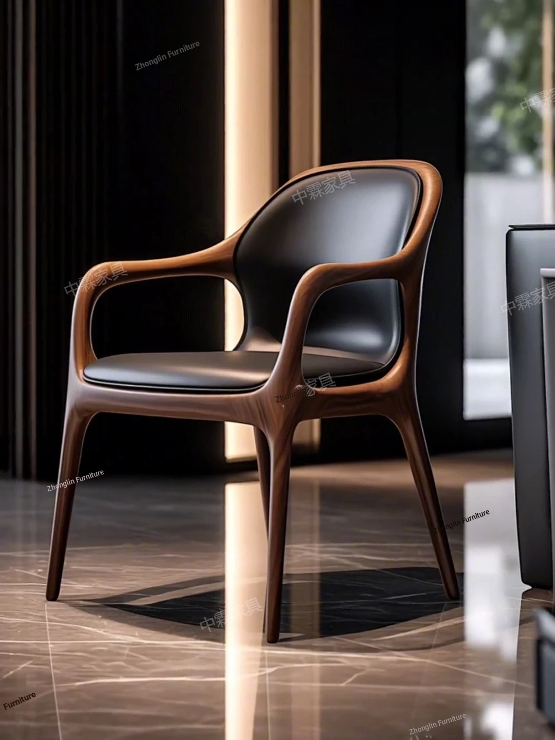 North American Black Walnut Solid Wood Tea Chair with Backrest - Designer Leather Dining Chair - Modern Light Luxury Leisure Sofa Chair