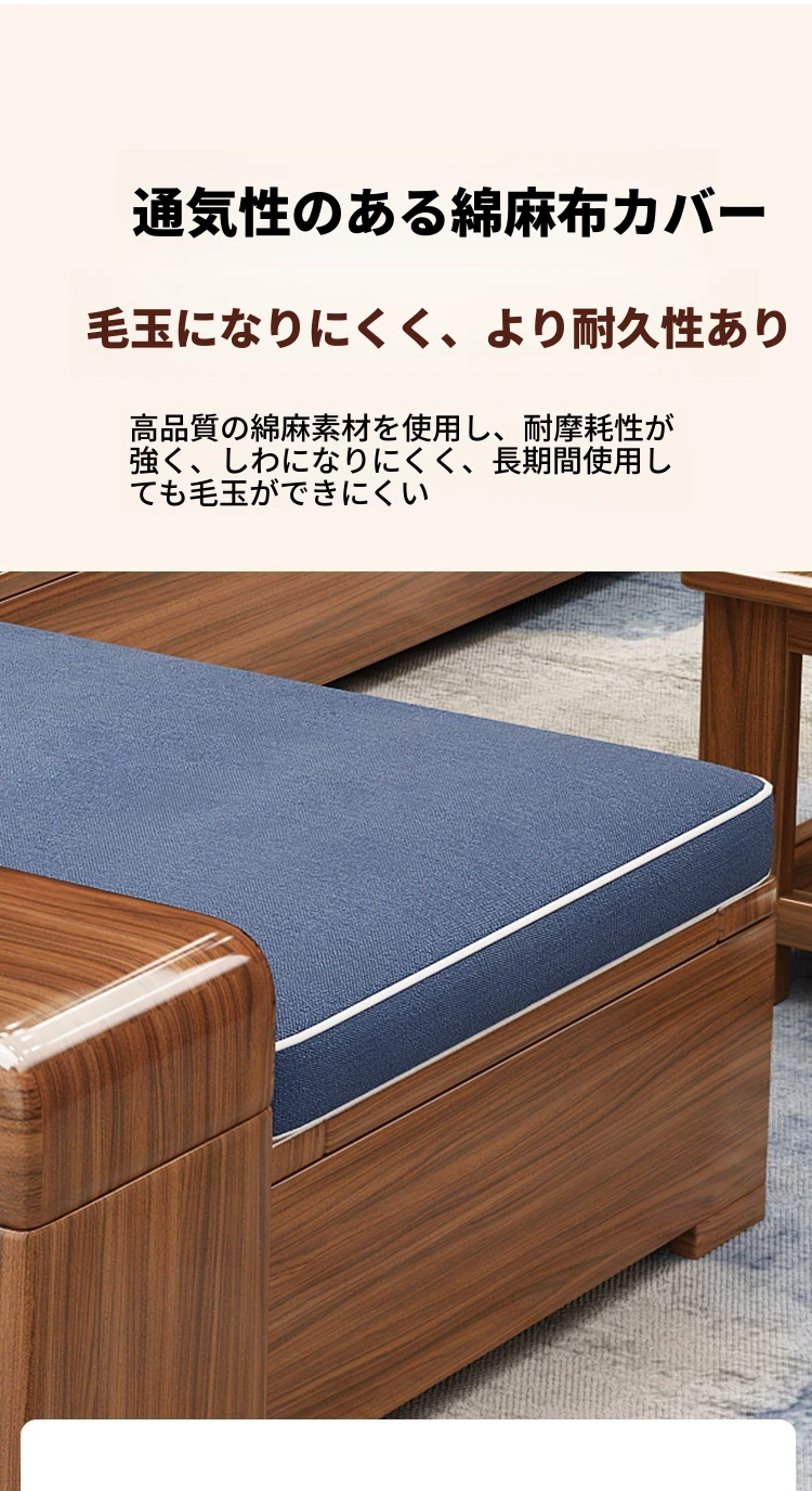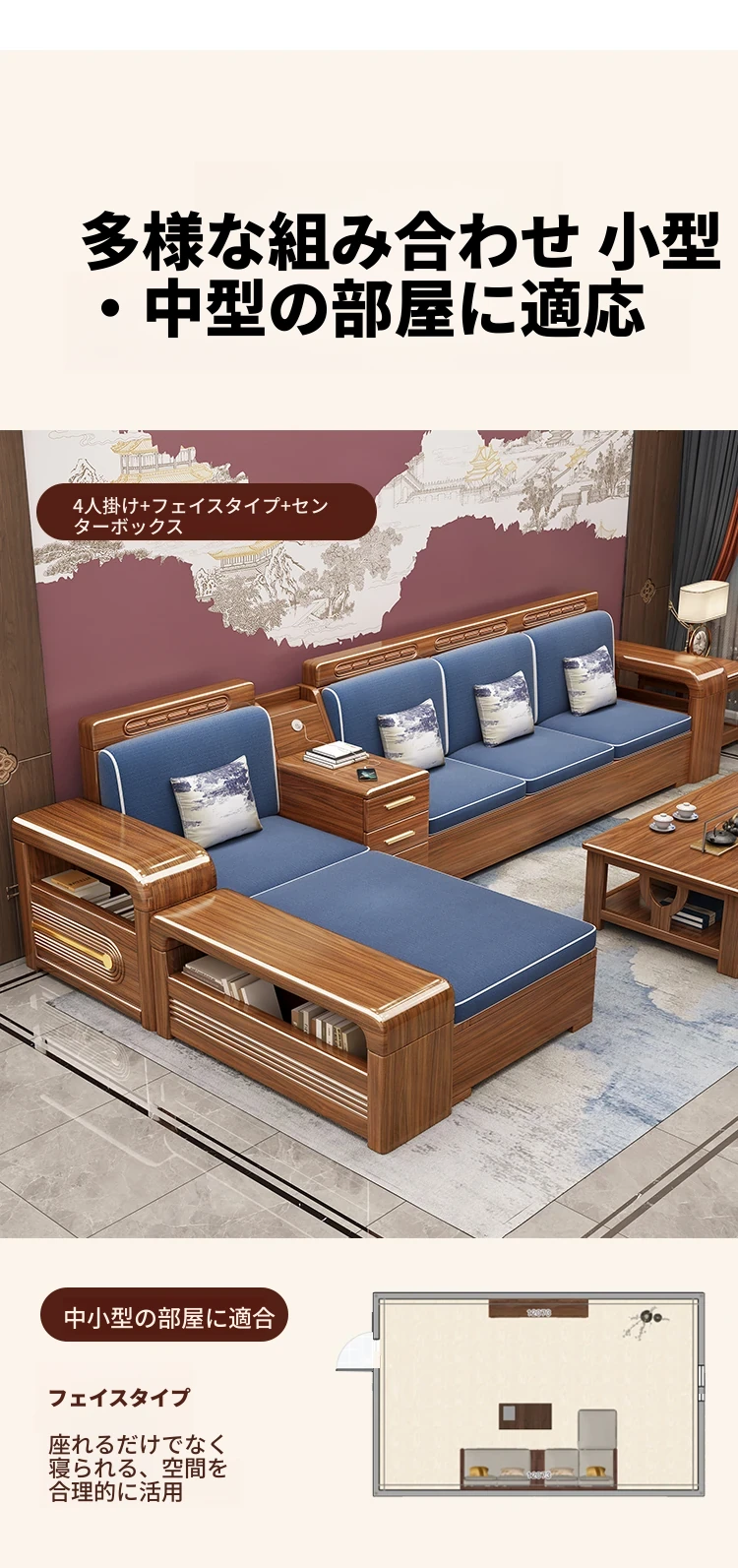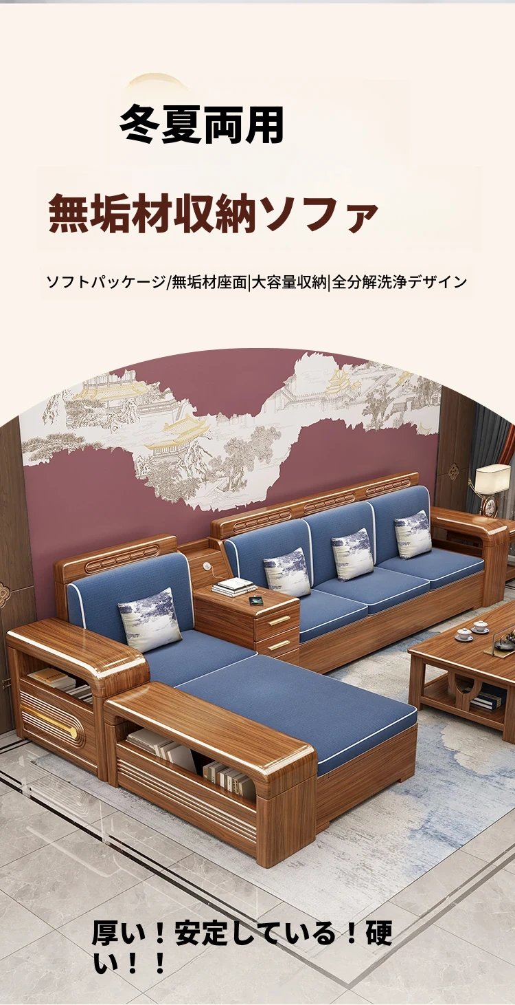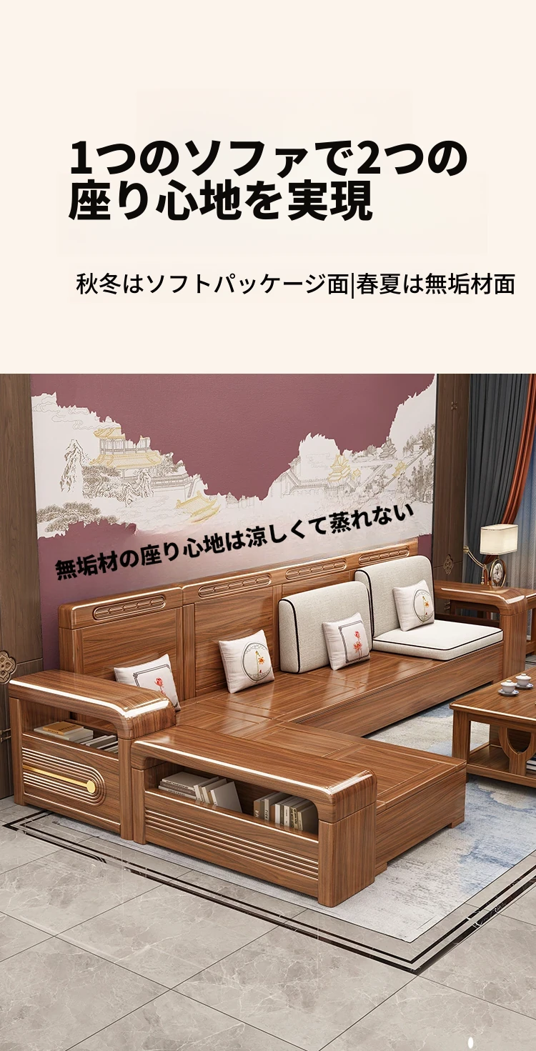2025年新作!胡桃木中式実木ソファ、冬夏兼用の収納付き小型リビング家具セット。小さなお部屋でもスタイリッシュに!