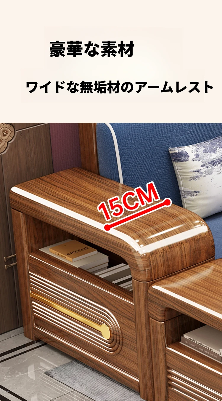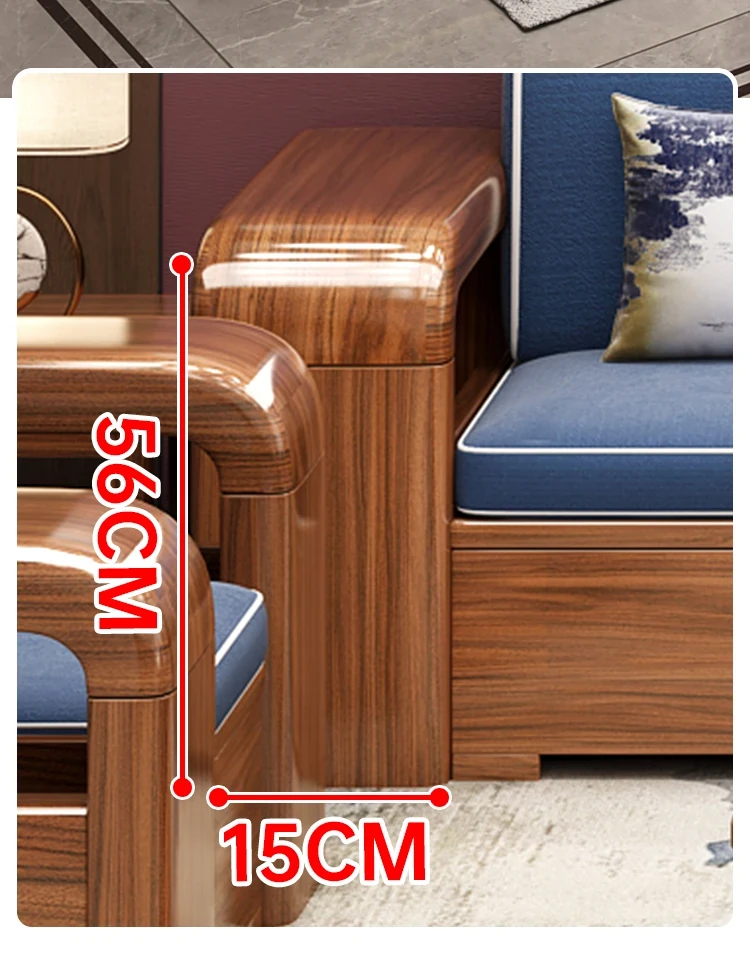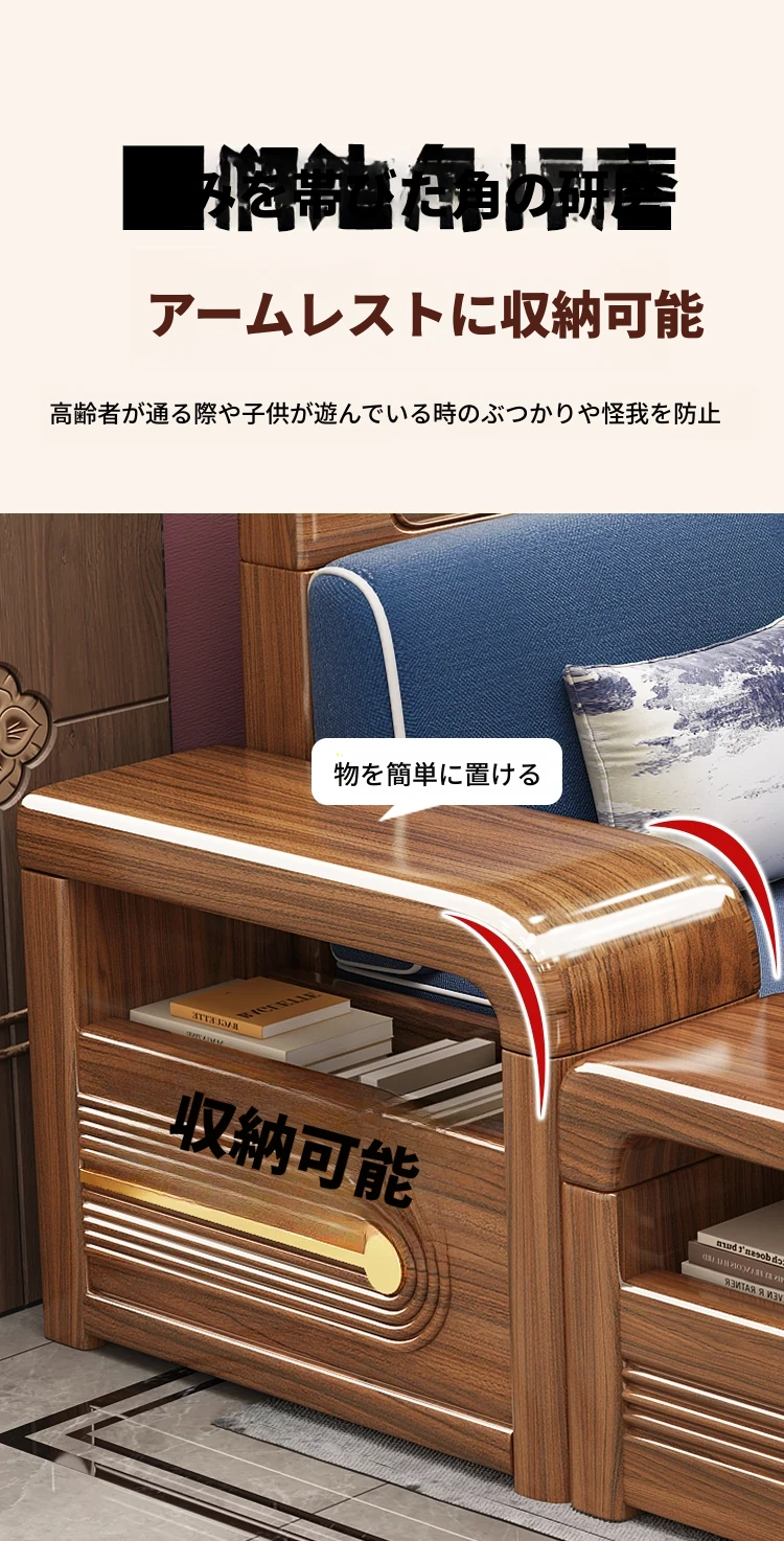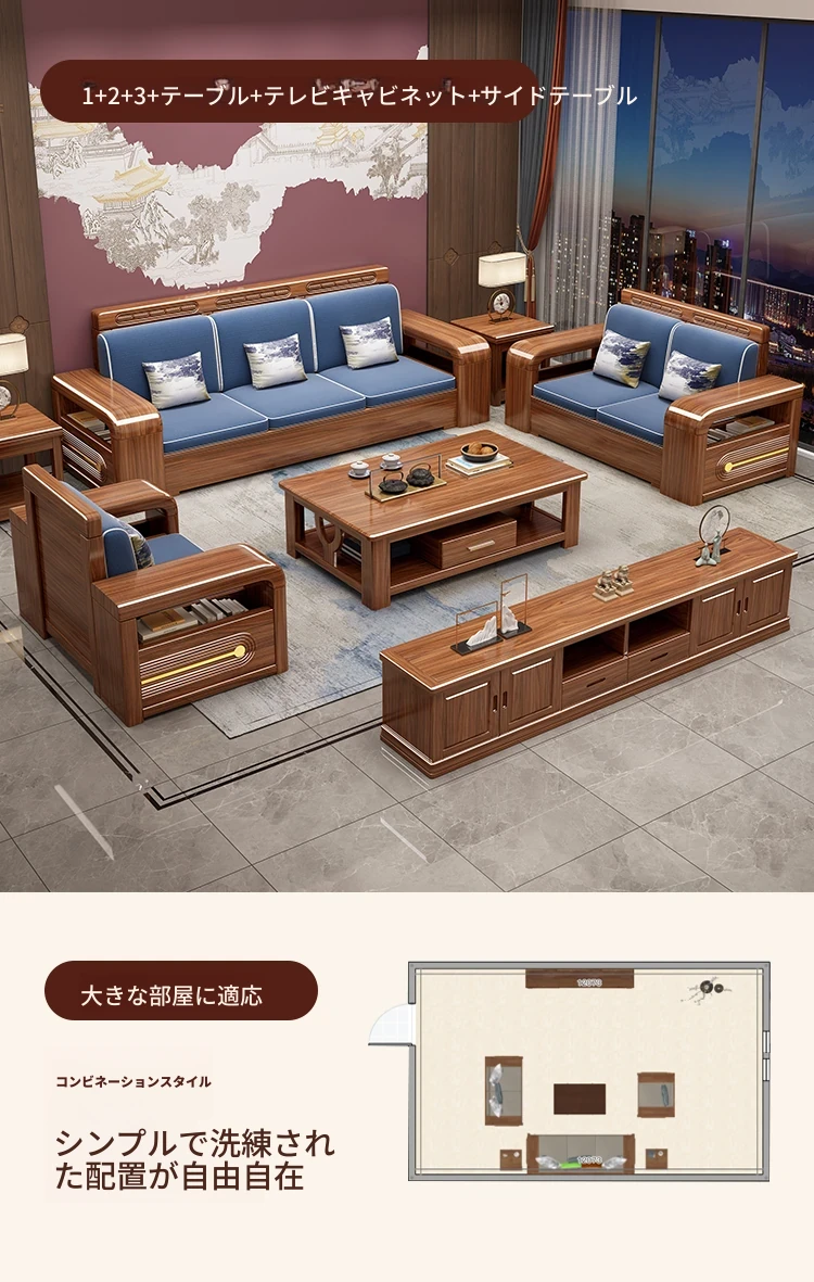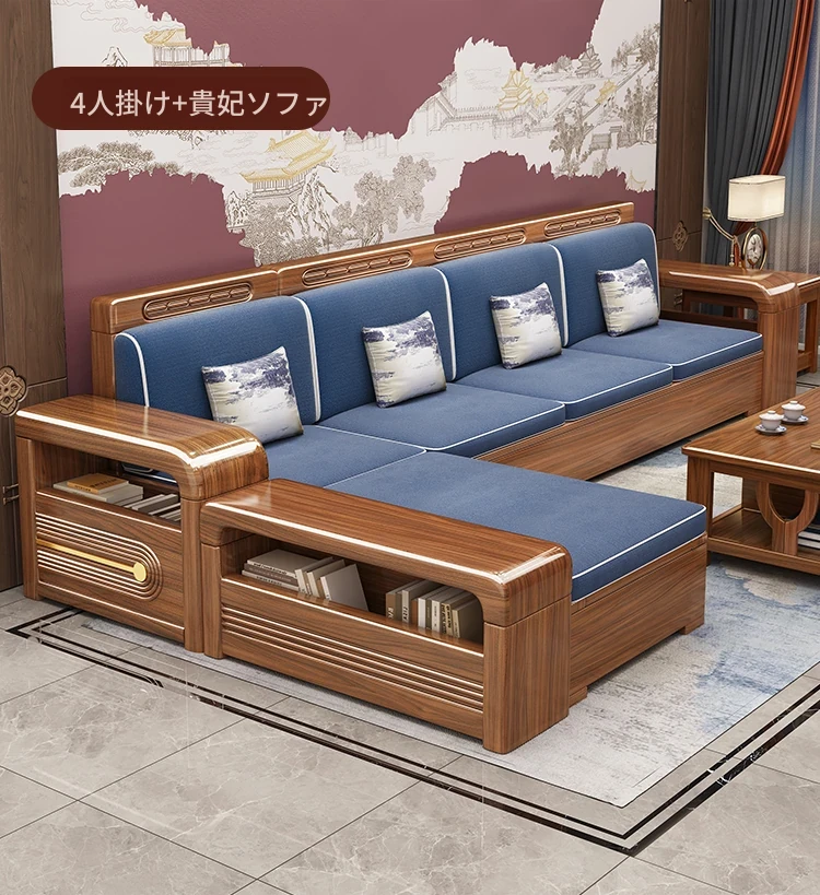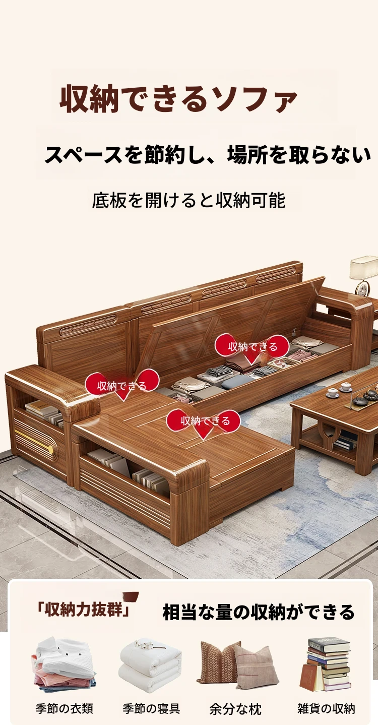 2025年新作!胡桃木中式実木ソファ、冬夏兼用の収納付き小型リビング家具セット。小さなお部屋でもスタイリッシュに!