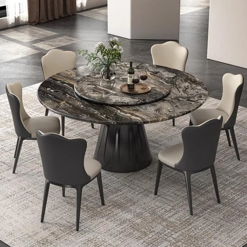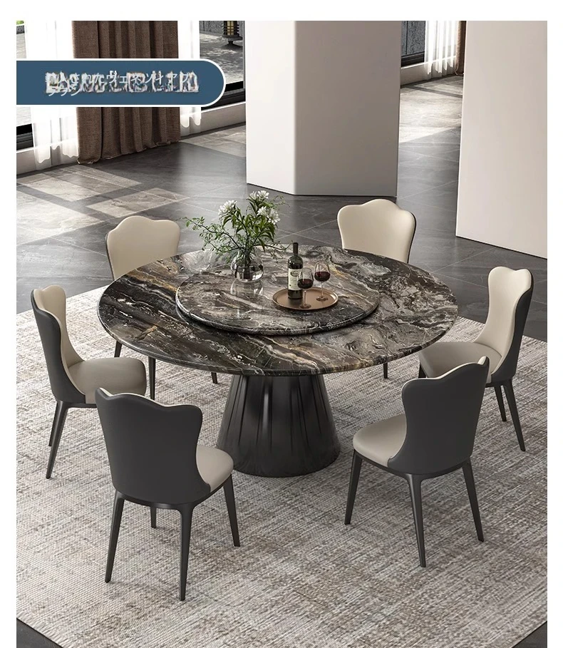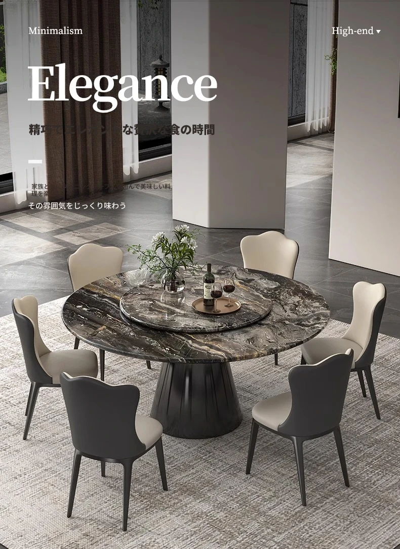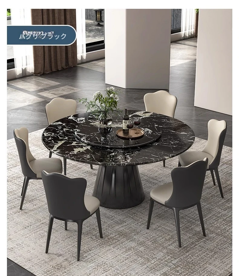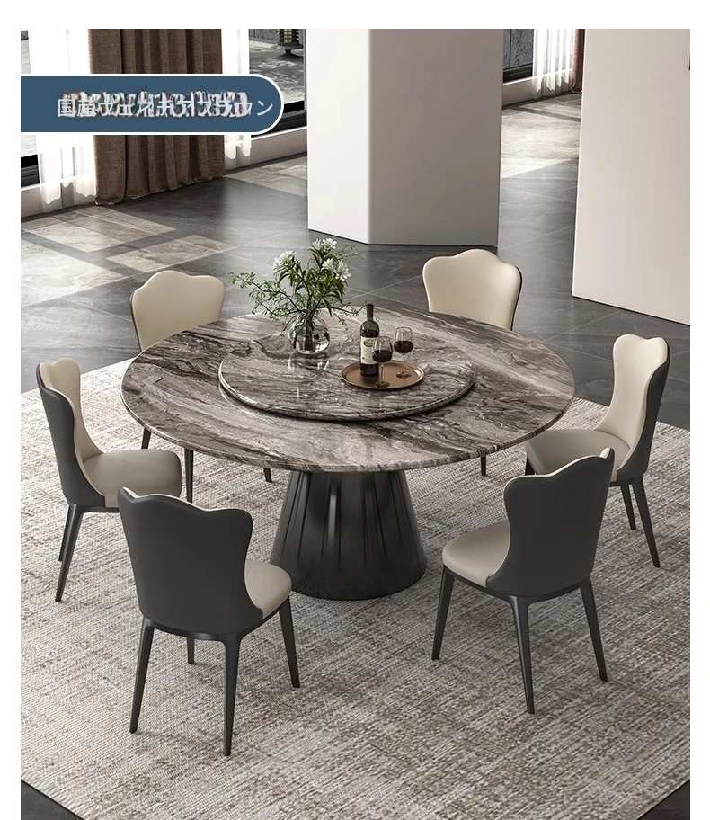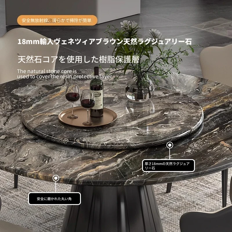 【輸入】ヴェネツィアブラウンラグジュアリー石製ダイニングテーブル+回転盤+本革ダイニングチェア*6