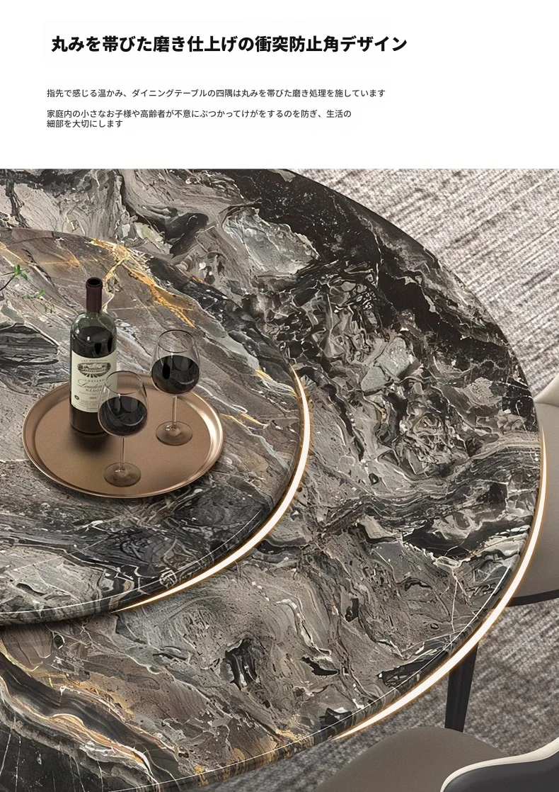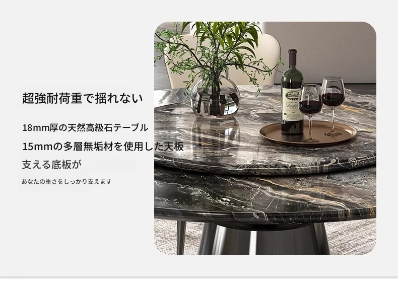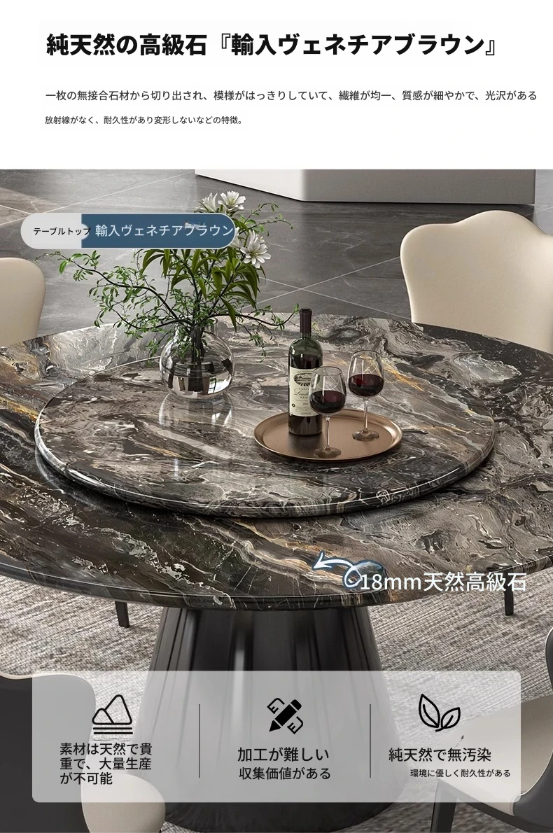 【国産】ヴェネツィアブラウンラグジュアリー石製ダイニングテーブル+回転盤+本革ダイニングチェア*6