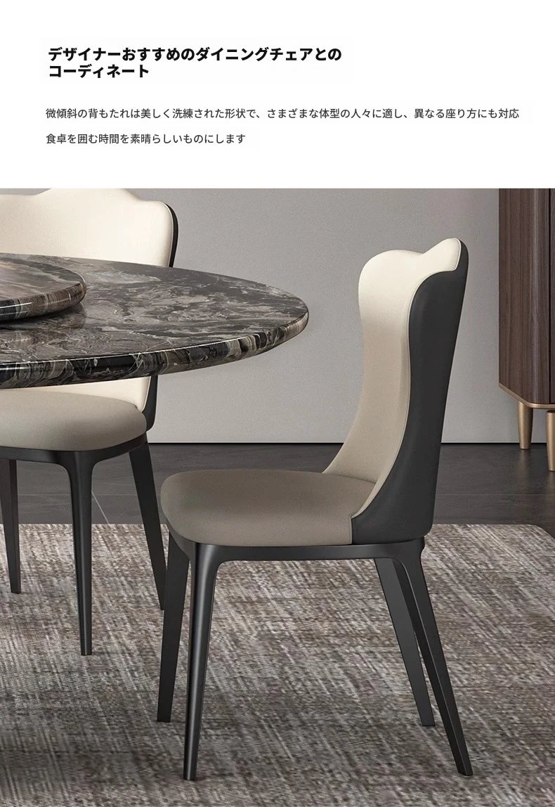 【国産】ヴェネツィアブラウンラグジュアリー石製ダイニングテーブル+回転盤+本革ダイニングチェア*4
