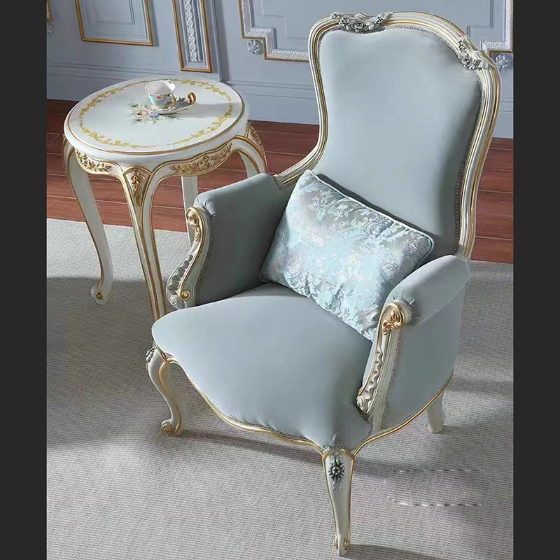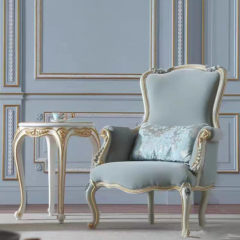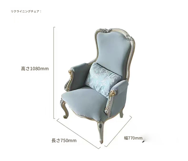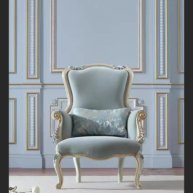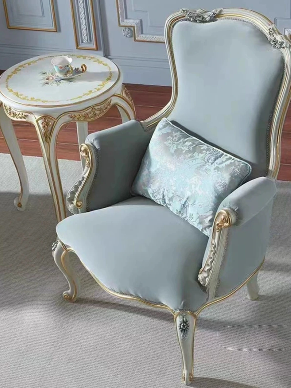 アメリカンスタイルのライトラグジュアリー天然木製ソファチェア、別荘リビング家具。フレンチレトロ彫刻の一人掛けソファ、バルコニーにぴったりなトラチェア。優雅さと快適さを兼ね備えた特別な一脚!