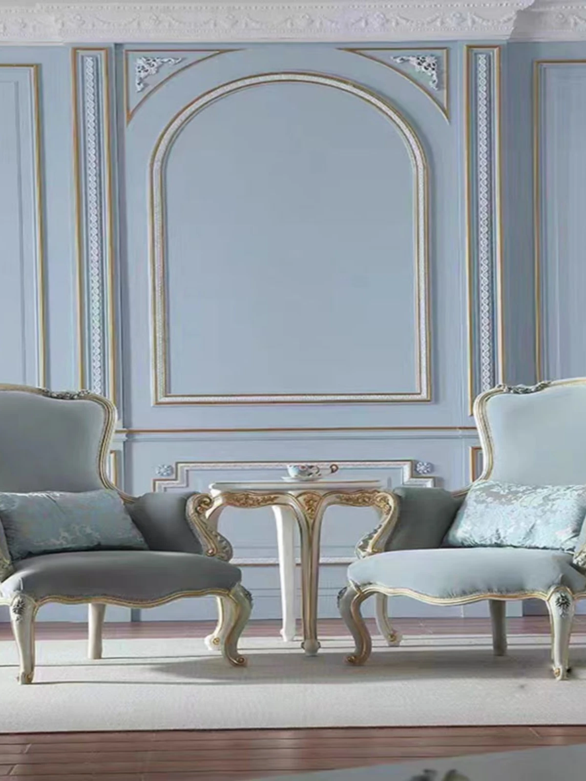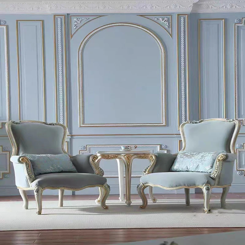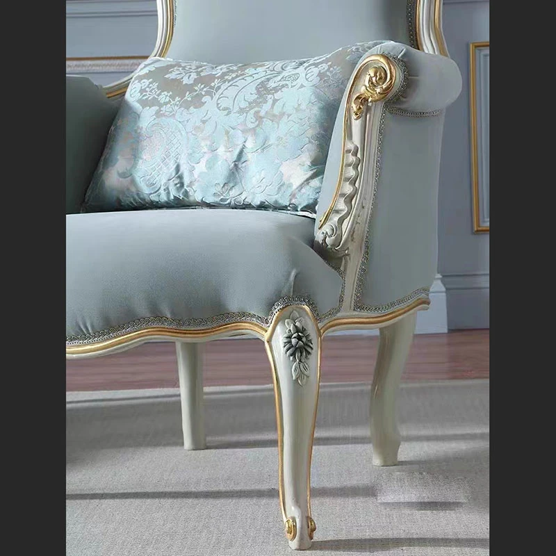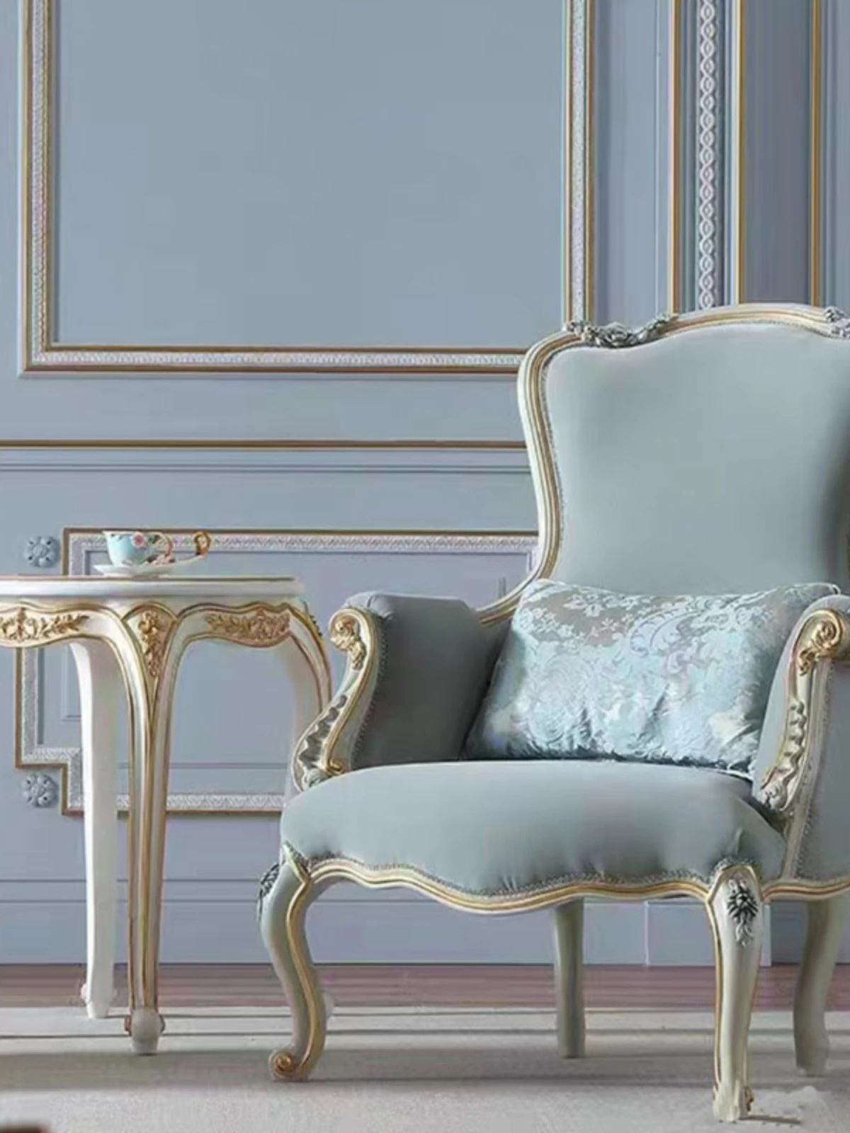 アメリカンスタイルのライトラグジュアリー天然木製ソファチェア、別荘リビング家具。フレンチレトロ彫刻の一人掛けソファ、バルコニーにぴったりなトラチェア。優雅さと快適さを兼ね備えた特別な一脚!