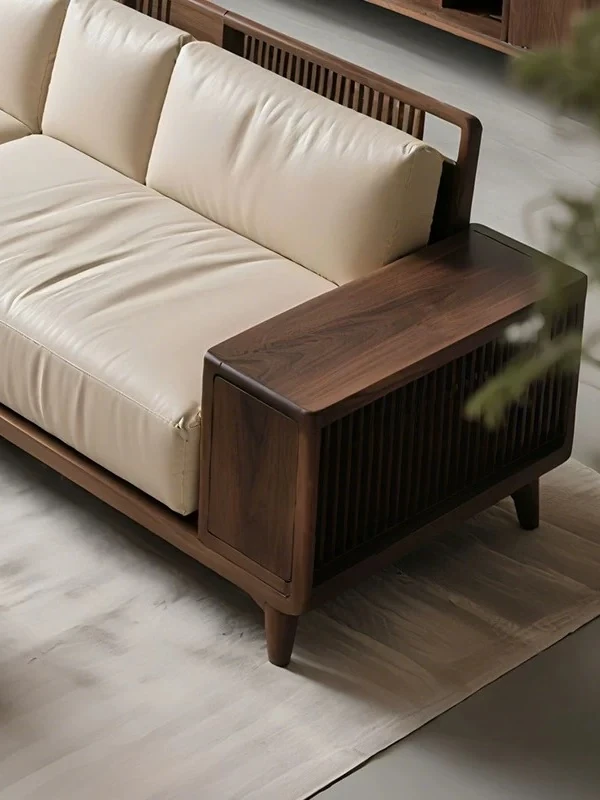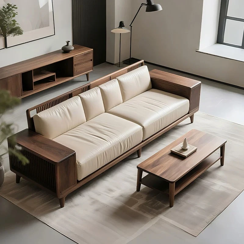 新中式高級実木レザーソファ - シンプルで現代的なデザインの客間用家具。宋氏美学を取り入れた、ホテルや別荘にぴったりのラグジュアリーなアイテム。