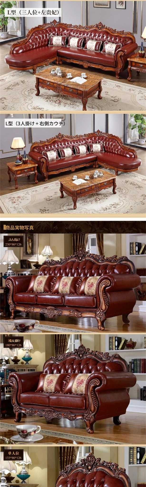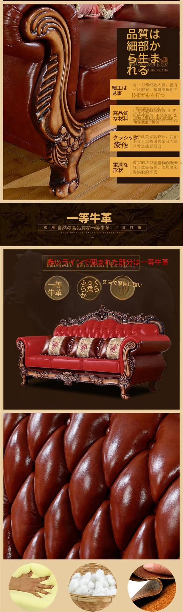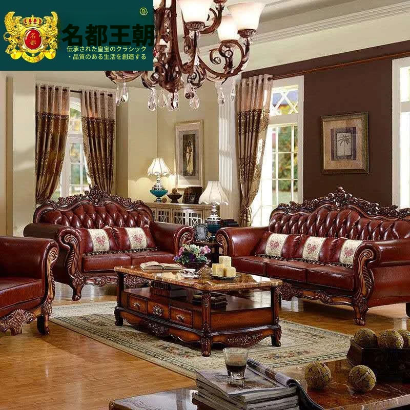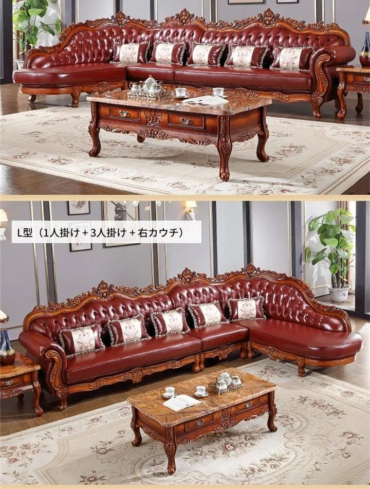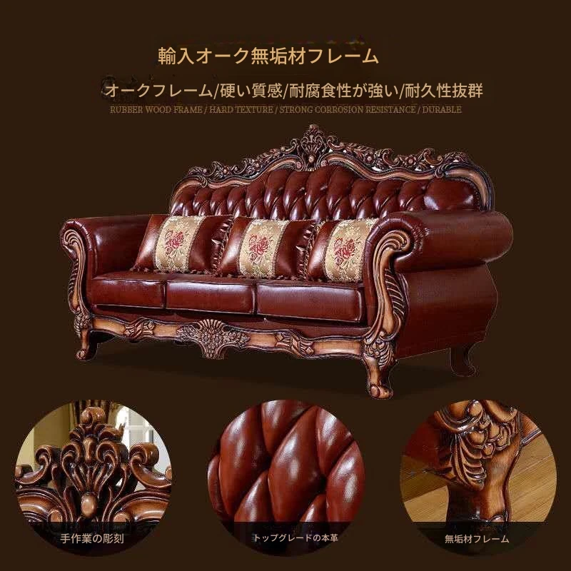 欧風本革ソファー 高級本牛革使用 123型リビングセット 豪華なヴィラスタイル アンティークアメリカンデザインの無垢材家具