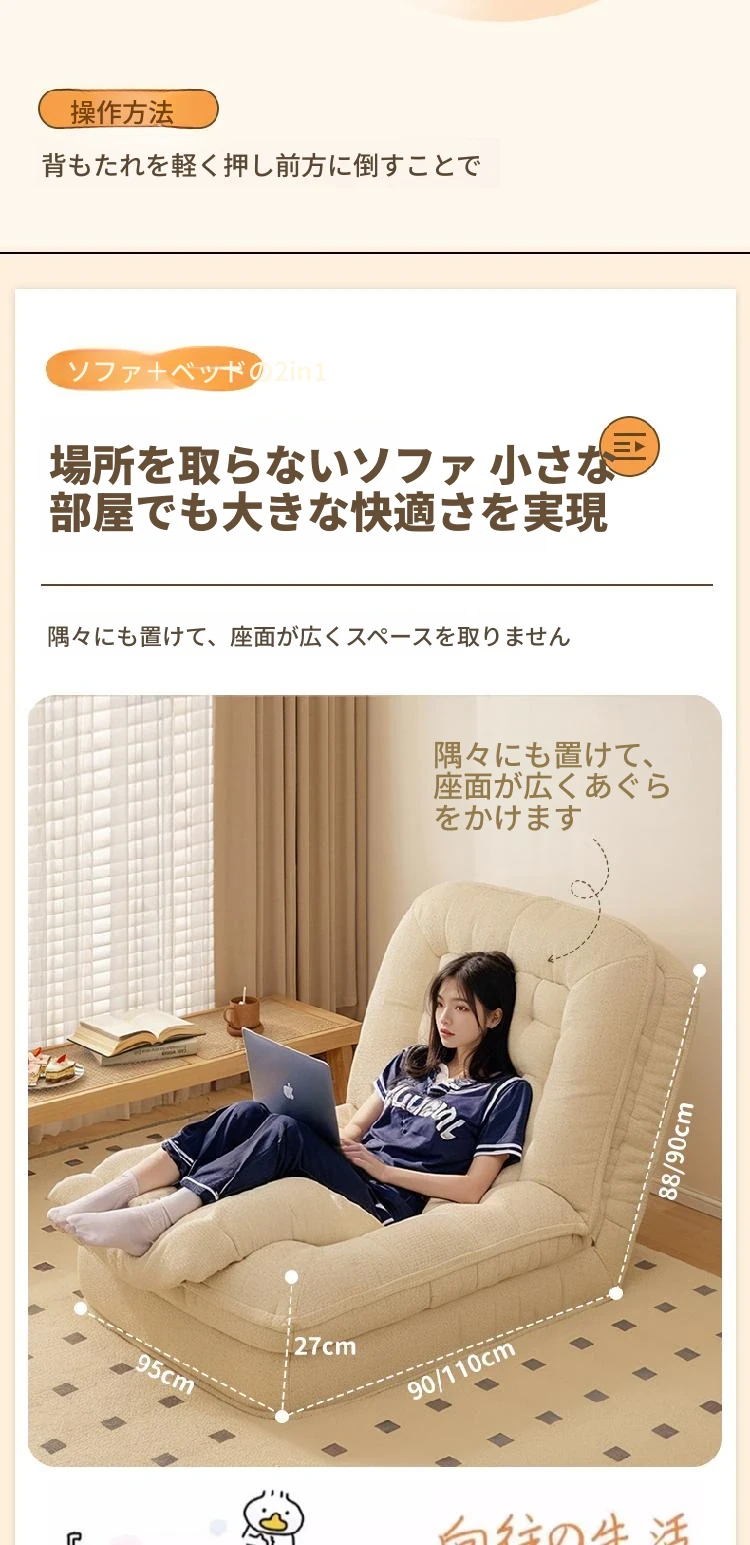 【展開200CM*95CM】肌触りの良いスエード生地-アイボリー【クッション+背もたれ付き】