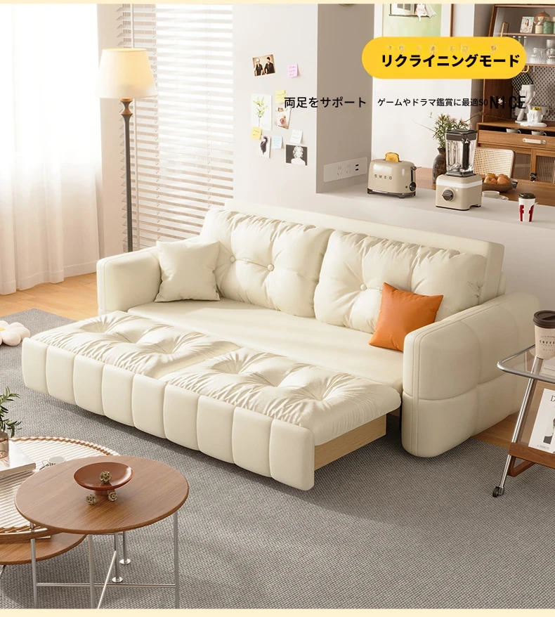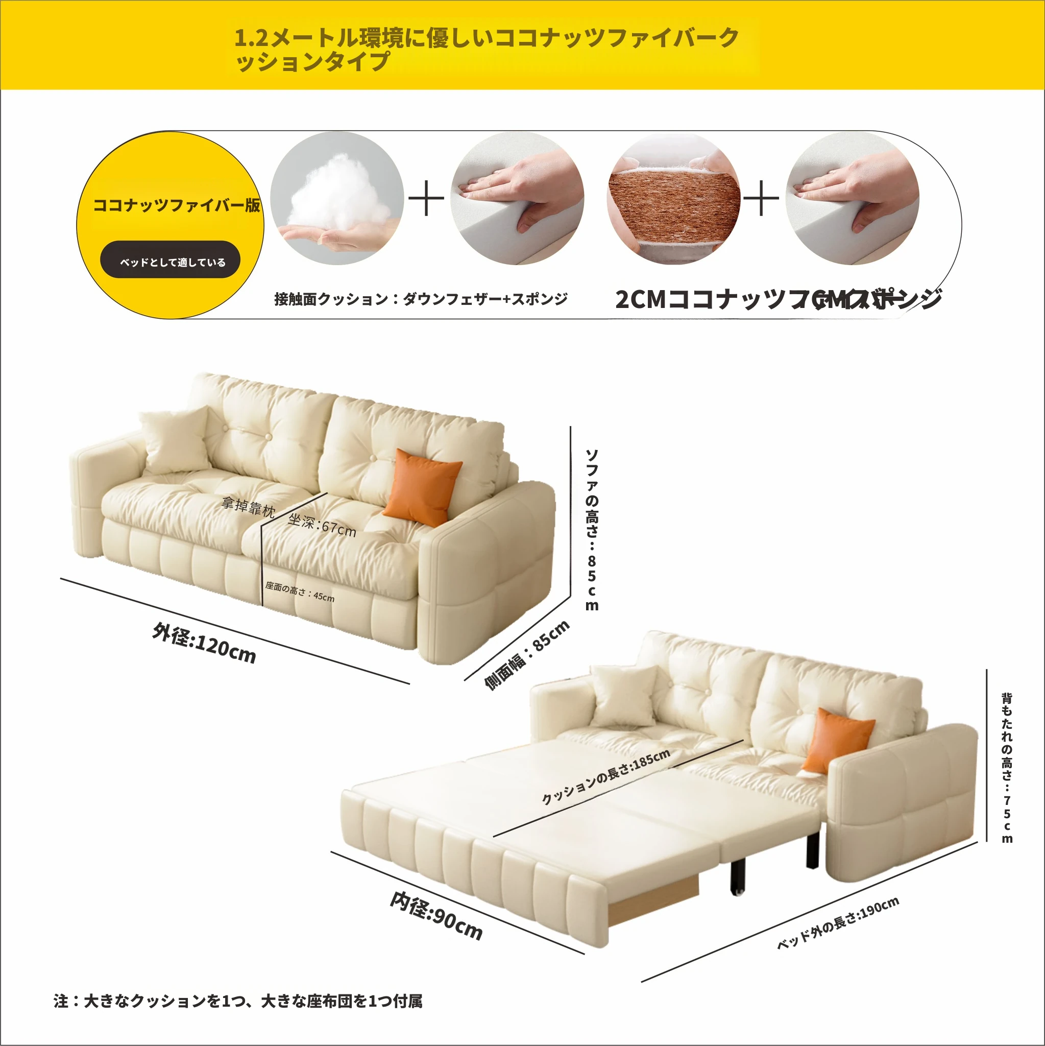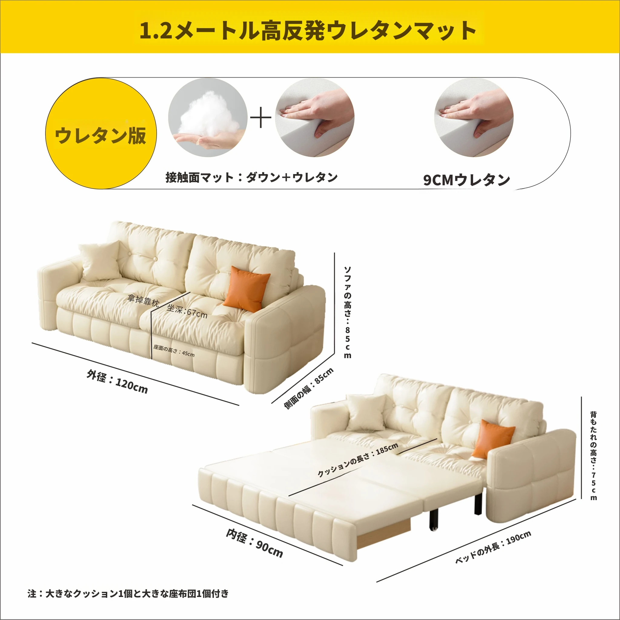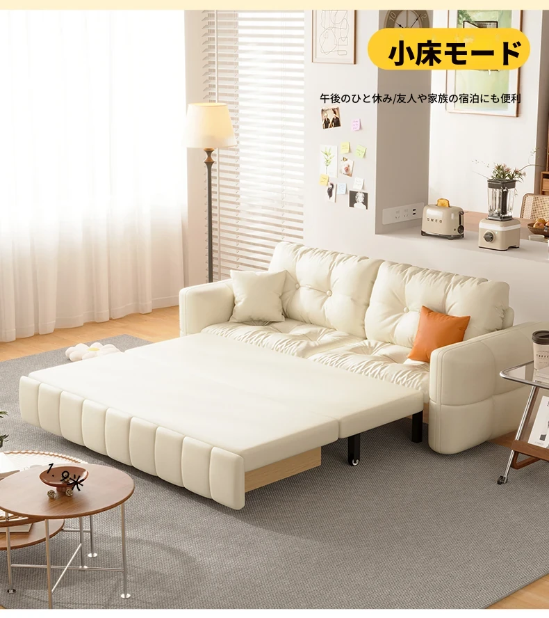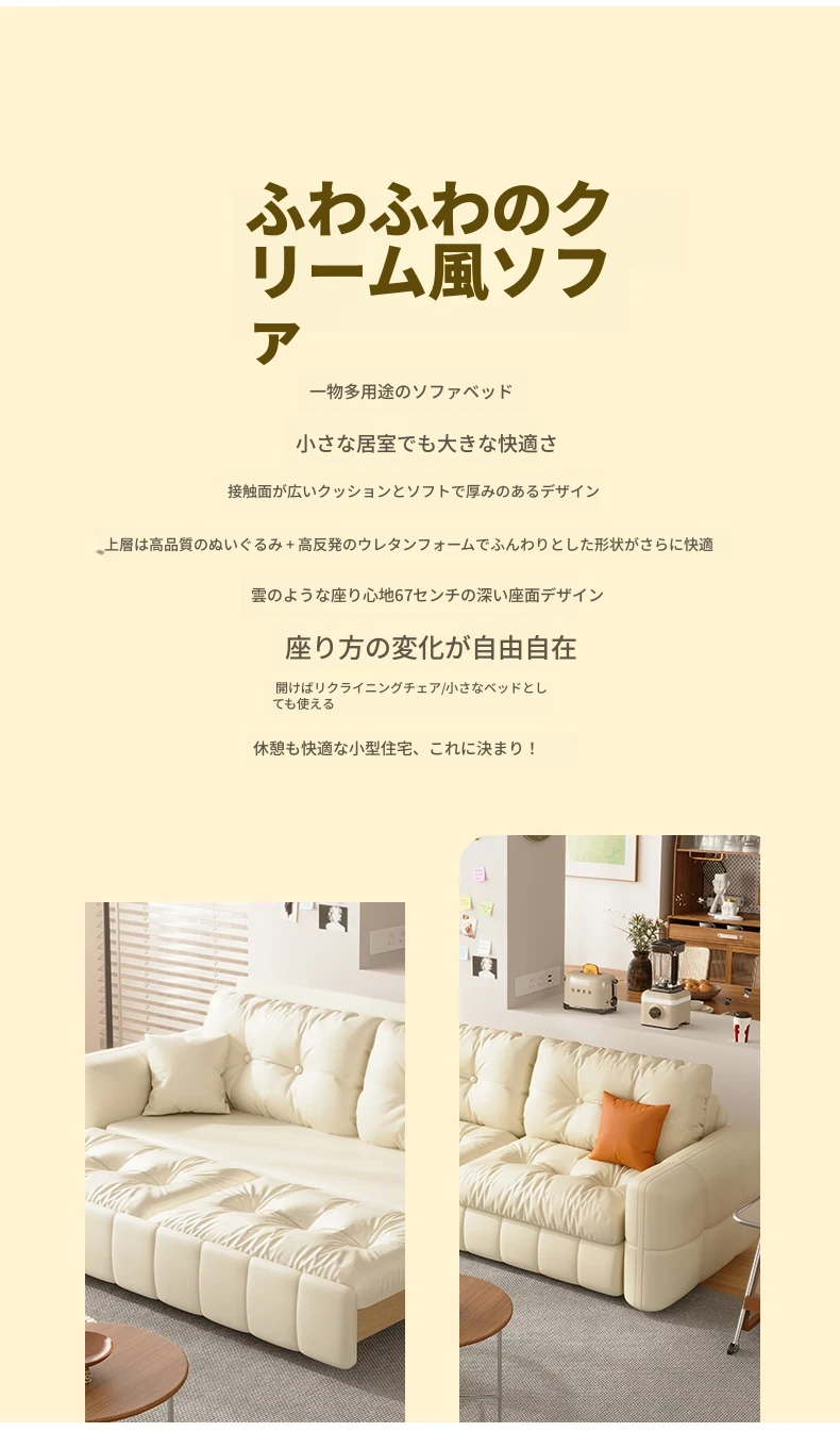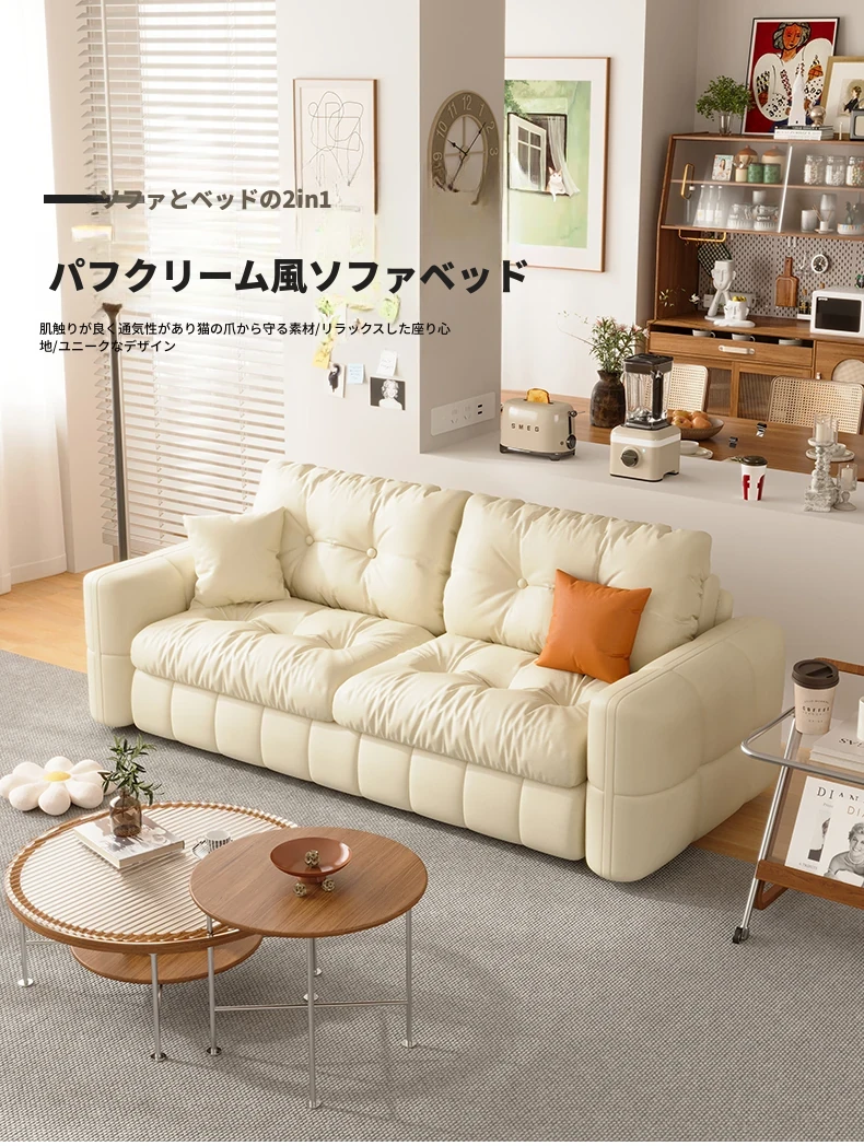 フランス風クリームカラーの猫抓皮折りたたみソファベッド - 多機能・コンパクトデザインで小型住居に最適!プッシュ&プル一体型で新登場!快適なくつろぎ空間をお楽しみください。
