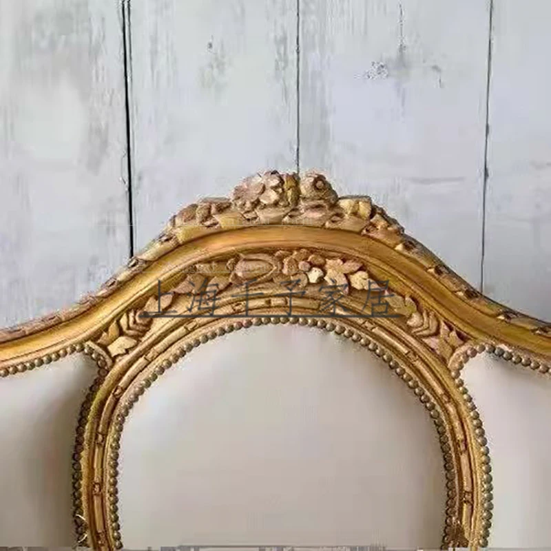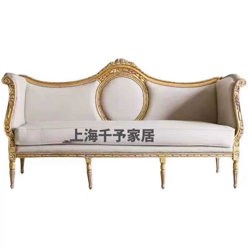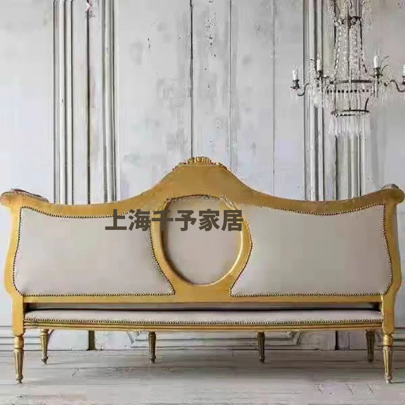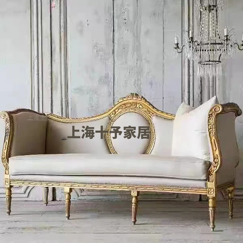 フレンチビンテージ無垢材ソファ|アメリカン彫刻布製3人掛けソファ|ゴールドアンティーク仕上げのヨーロピアン接客ソファ|洗練されたデザインで優雅な空間を演出!