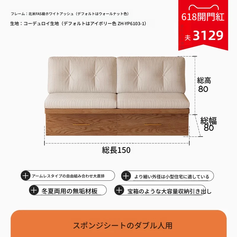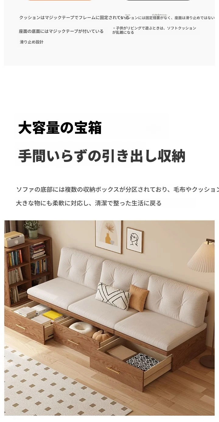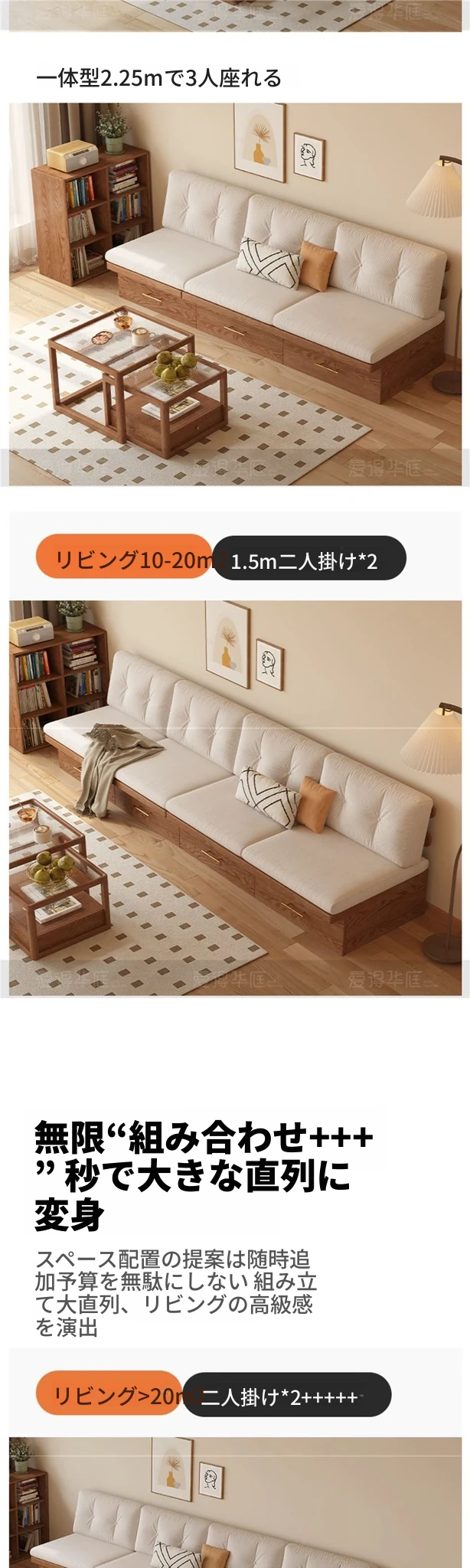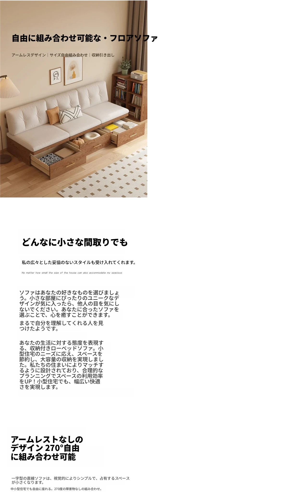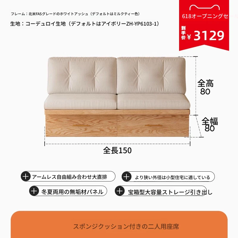 和風実木製ソファ|冬夏兼用|小スペース向け|引き出し収納付き|アームレスデザイン|フラットタイプ|スタイリッシュなリビング空間を演出!