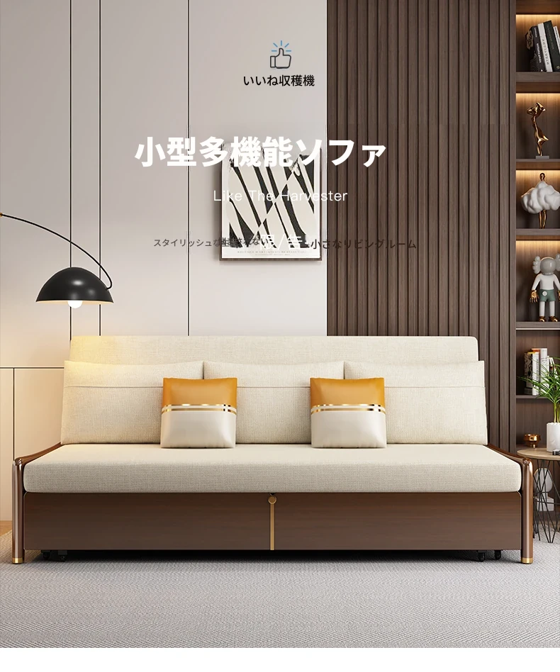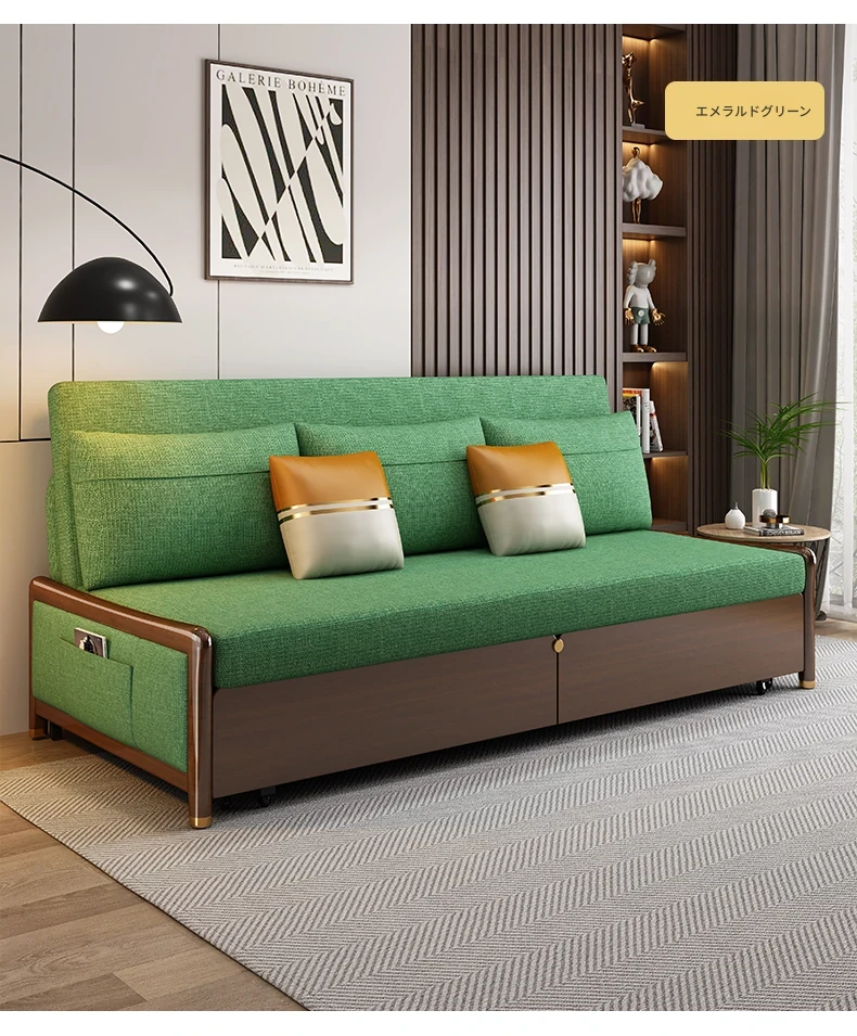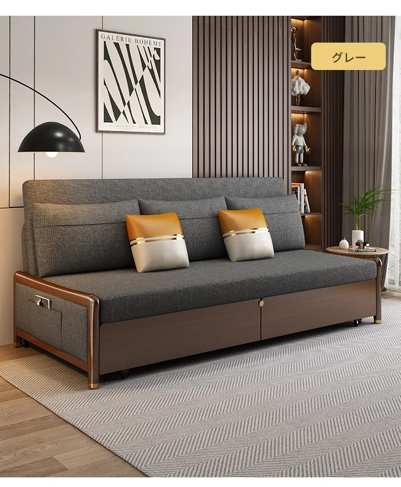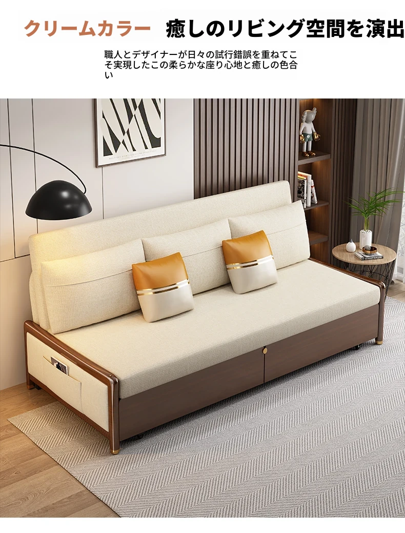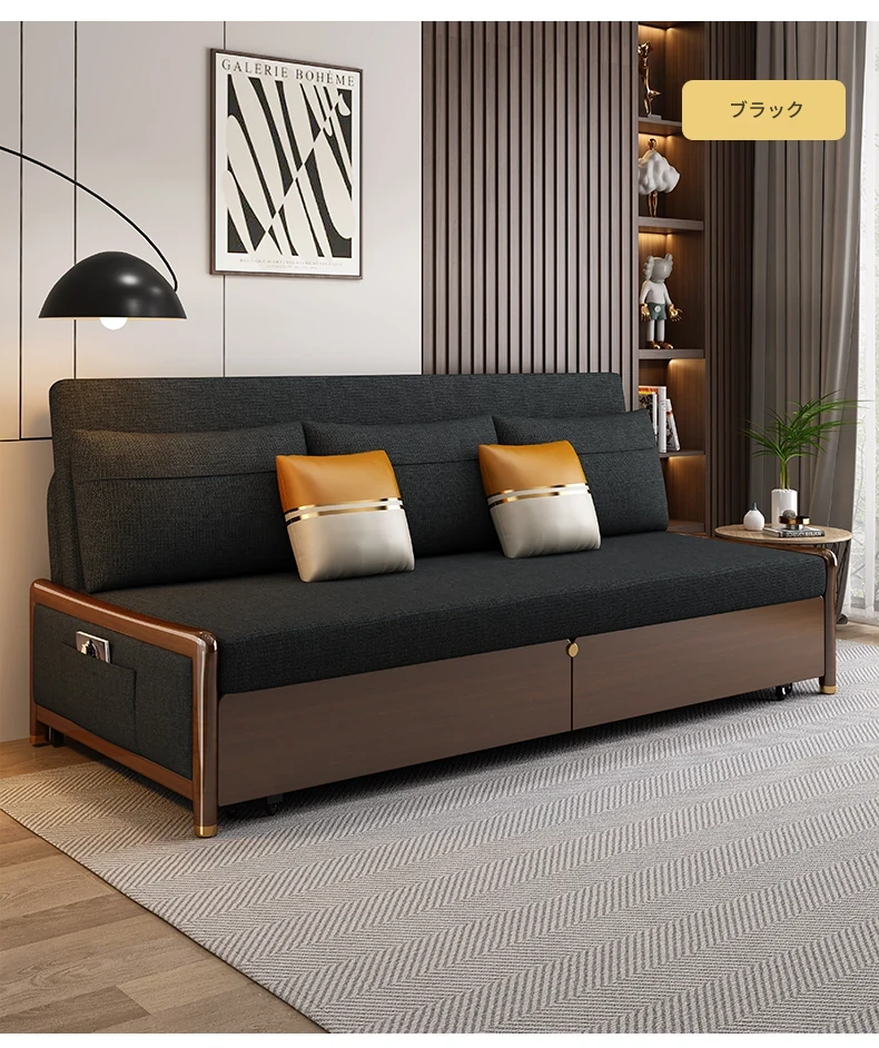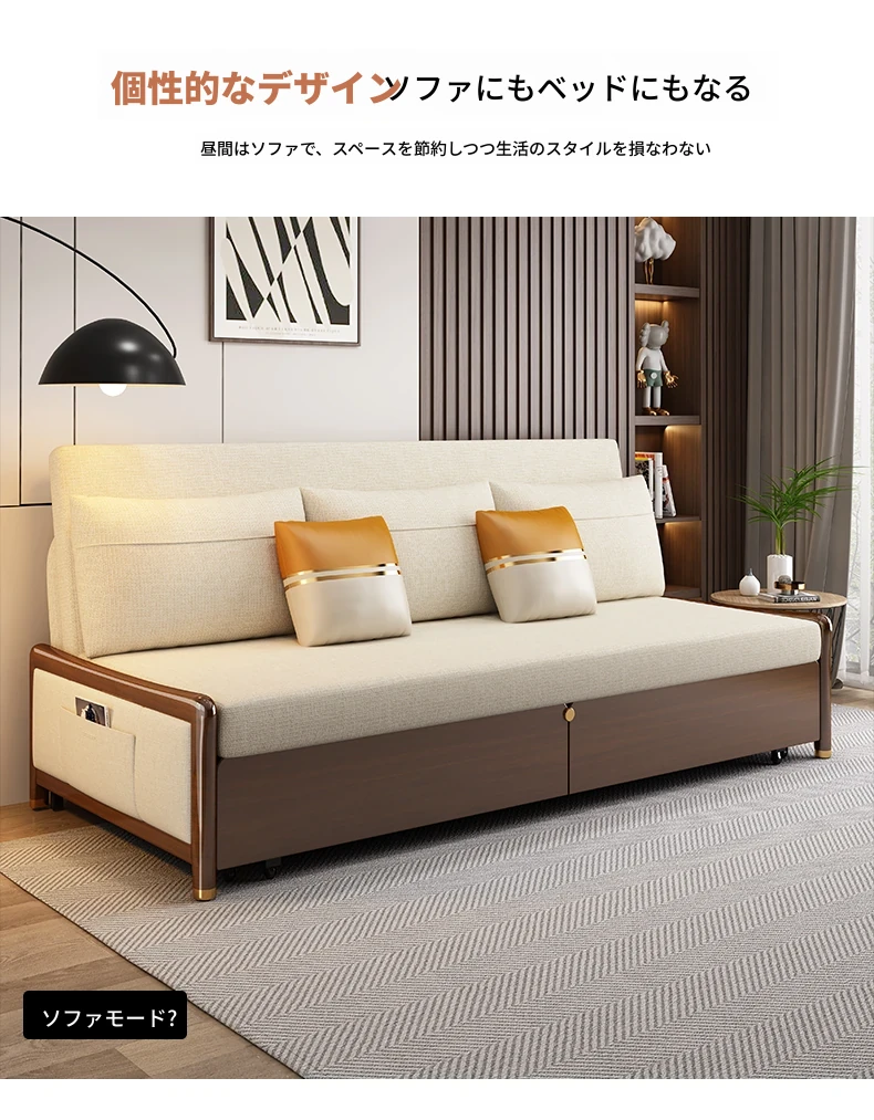 カリヤ 天然木製ソファベッド 折りたたみ式・多機能・引き出し付き 人気の小型リビング用ソファベッド スペースを効率的に利用して、快適なひとときをお届けします!