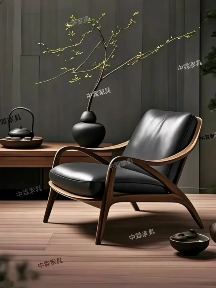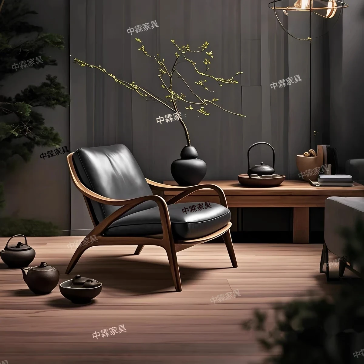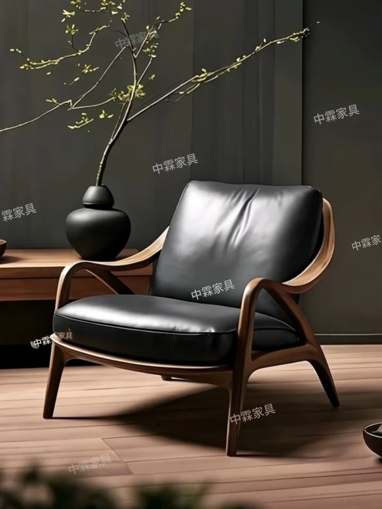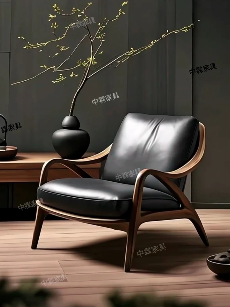 新中式スタイルの北米産ブラックウォールナット無垢材ソファチェア。最高級の牛革を使用したラグジュアリーなリラックスチェア。洗練されたデザインで書斎やリビングにぴったり!