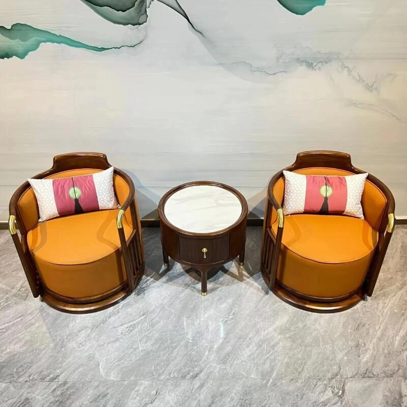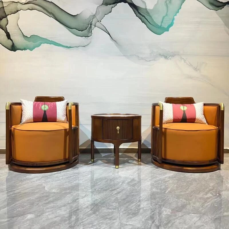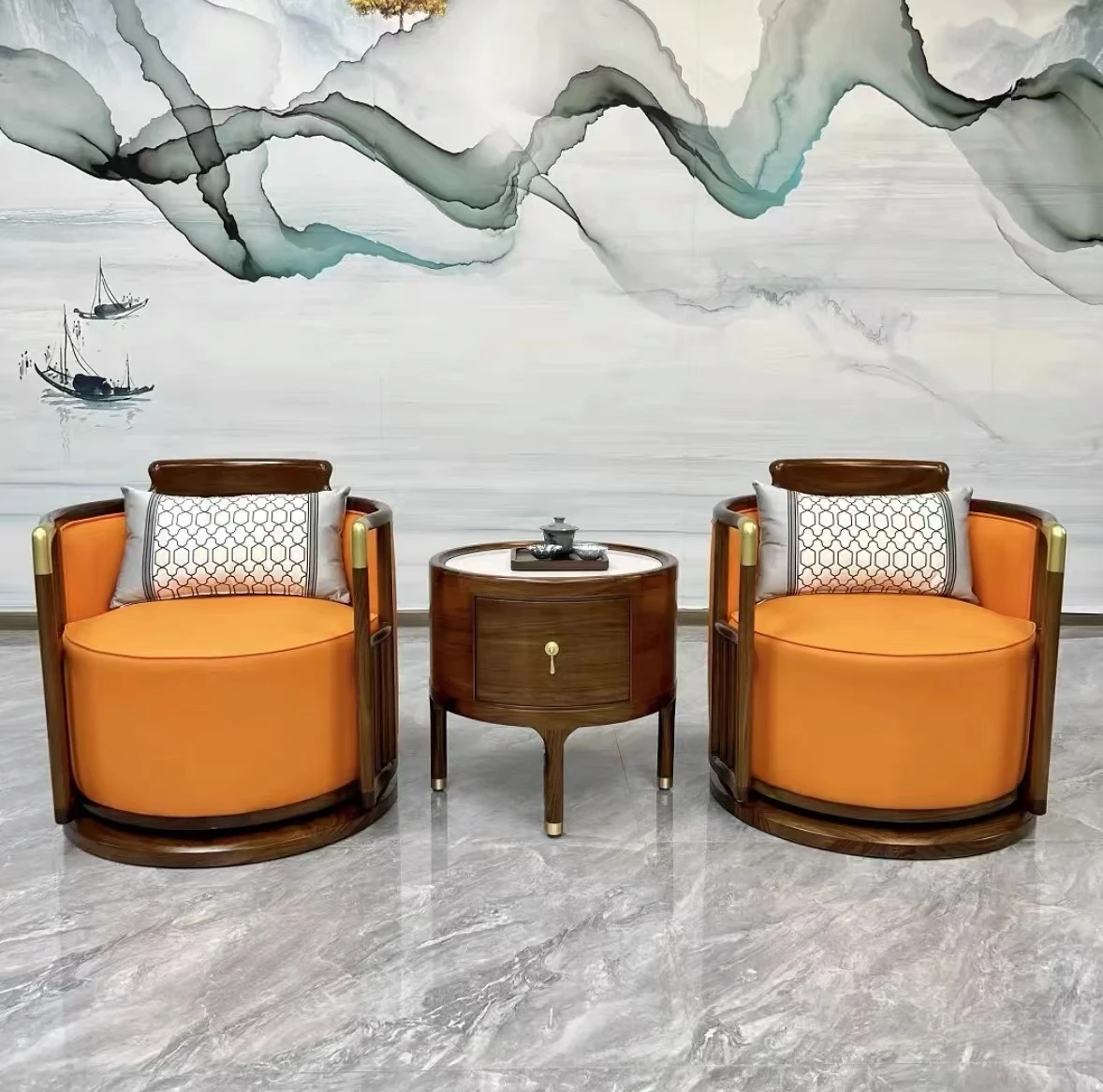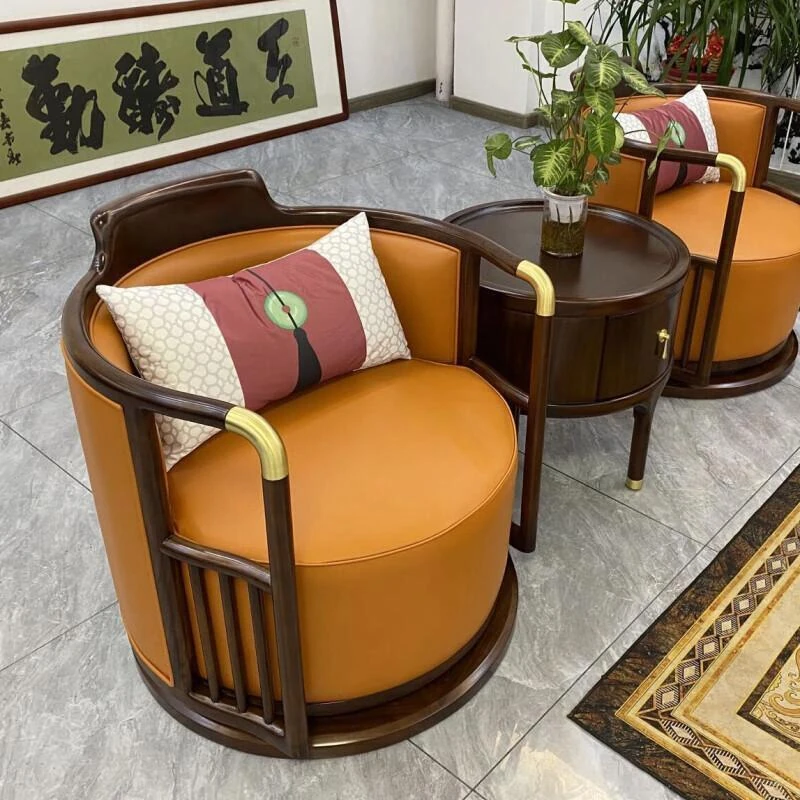 新中式デザインの回転式レザー&ウッド製ソファチェア3点セット - 高級ウッドブラックウッドサークルチェアで、くつろぎのひとときを。シンプルで洗練されたスタイルが、あなたのリビングルームを華やかに演出します。