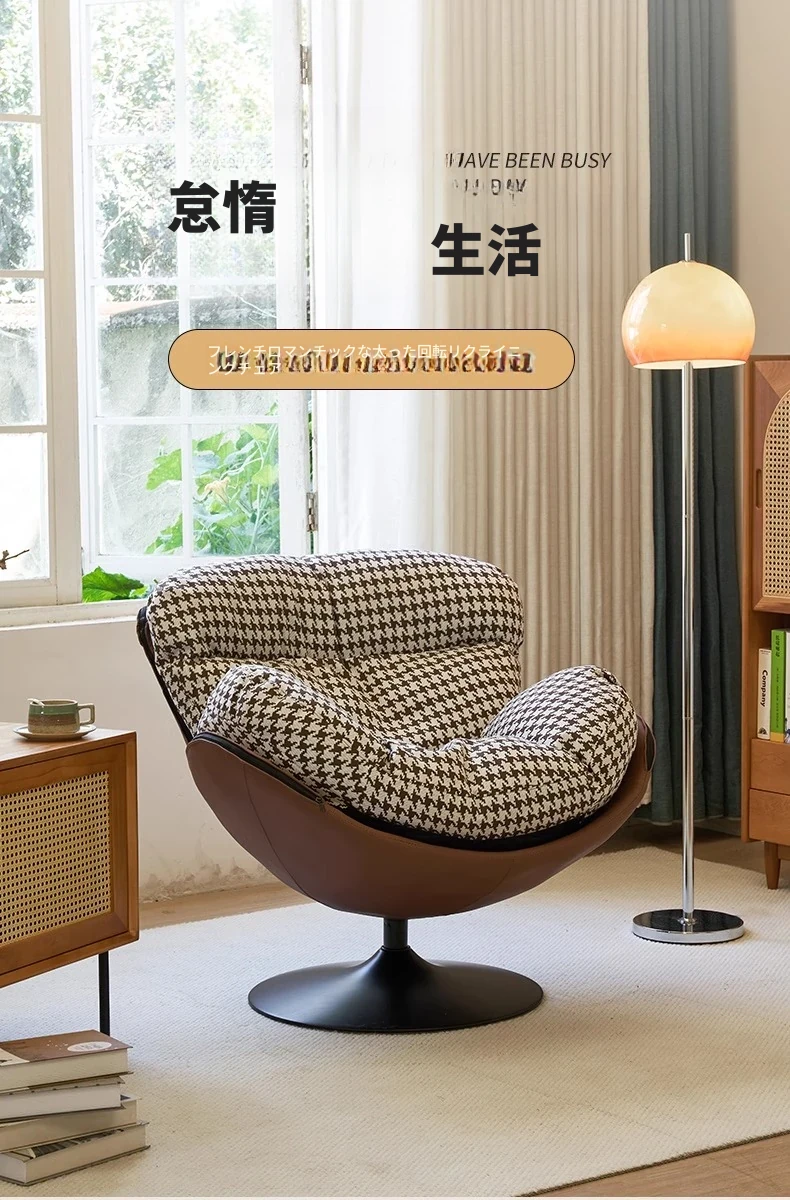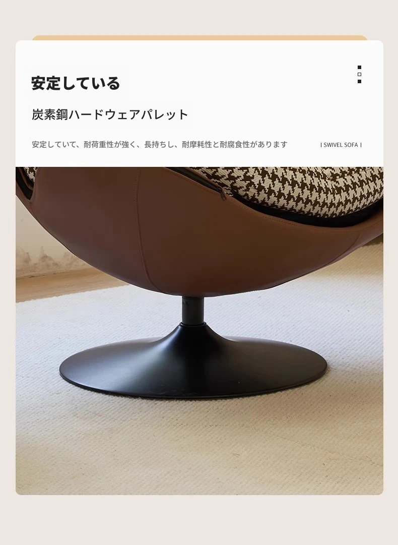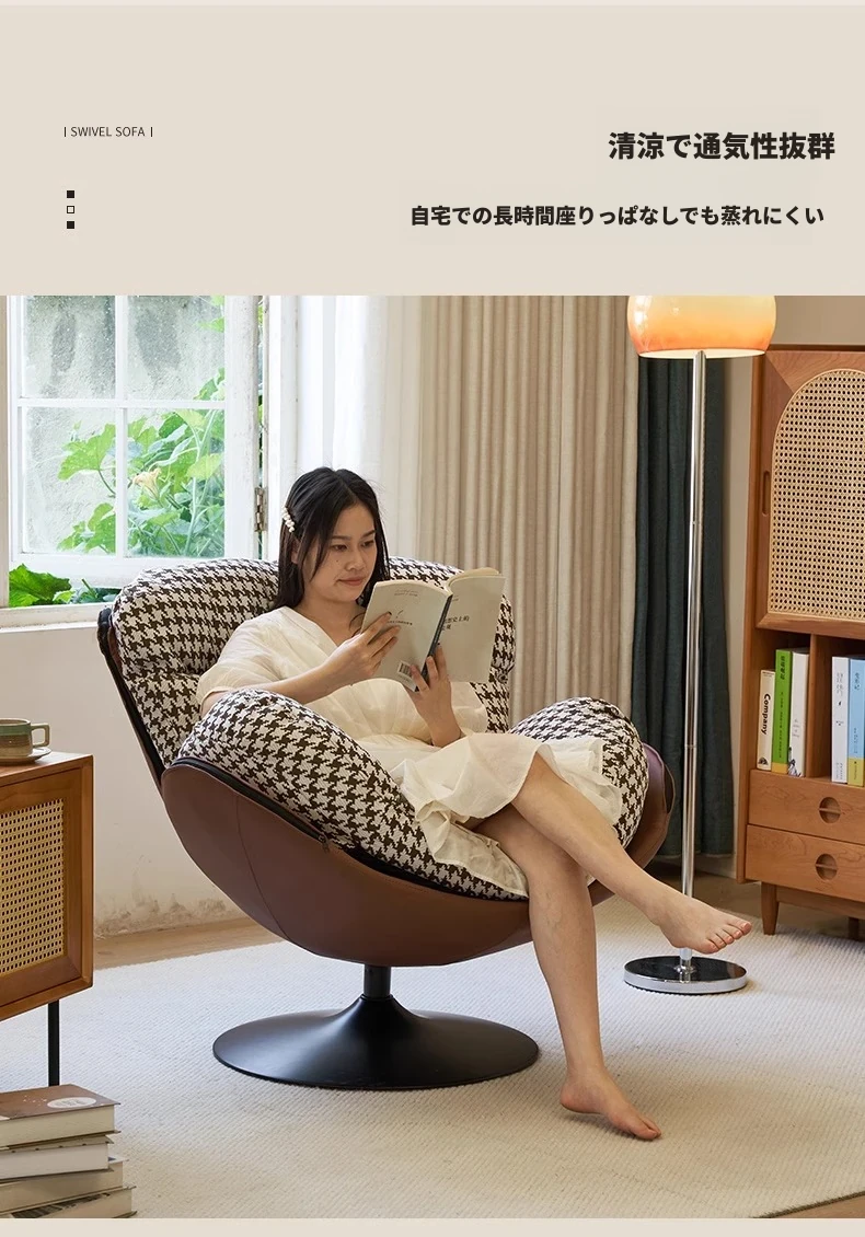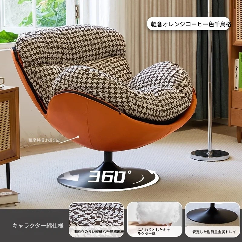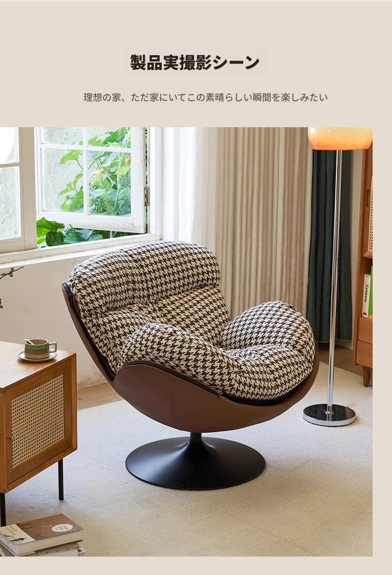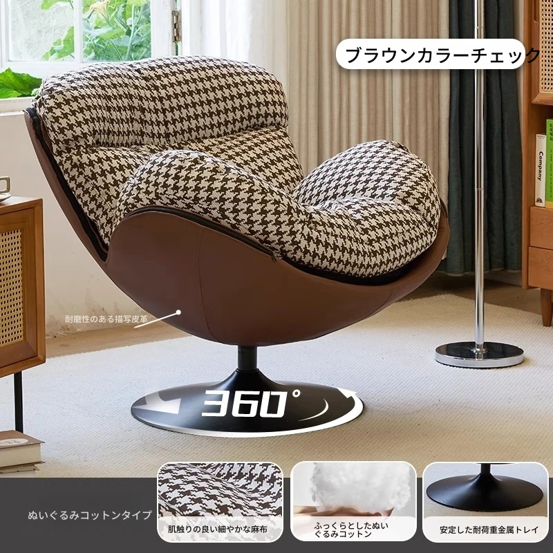 ベイジュモダン一人用エッグシェイプソファ、千鳥格デザインの麻布製、家庭用リラックスソファ、レトロスタイル、360度回転可能で快適なひとときを提供!