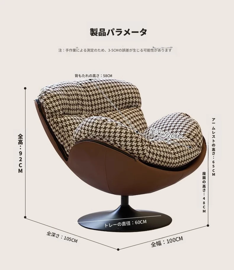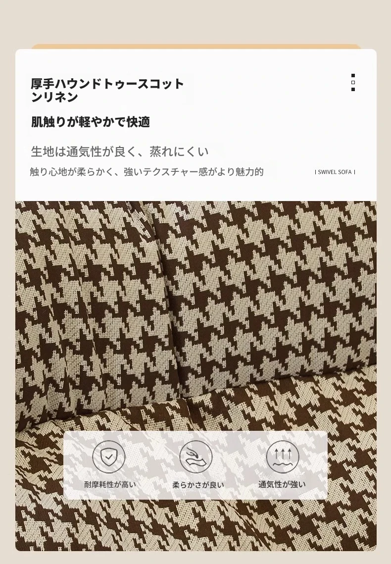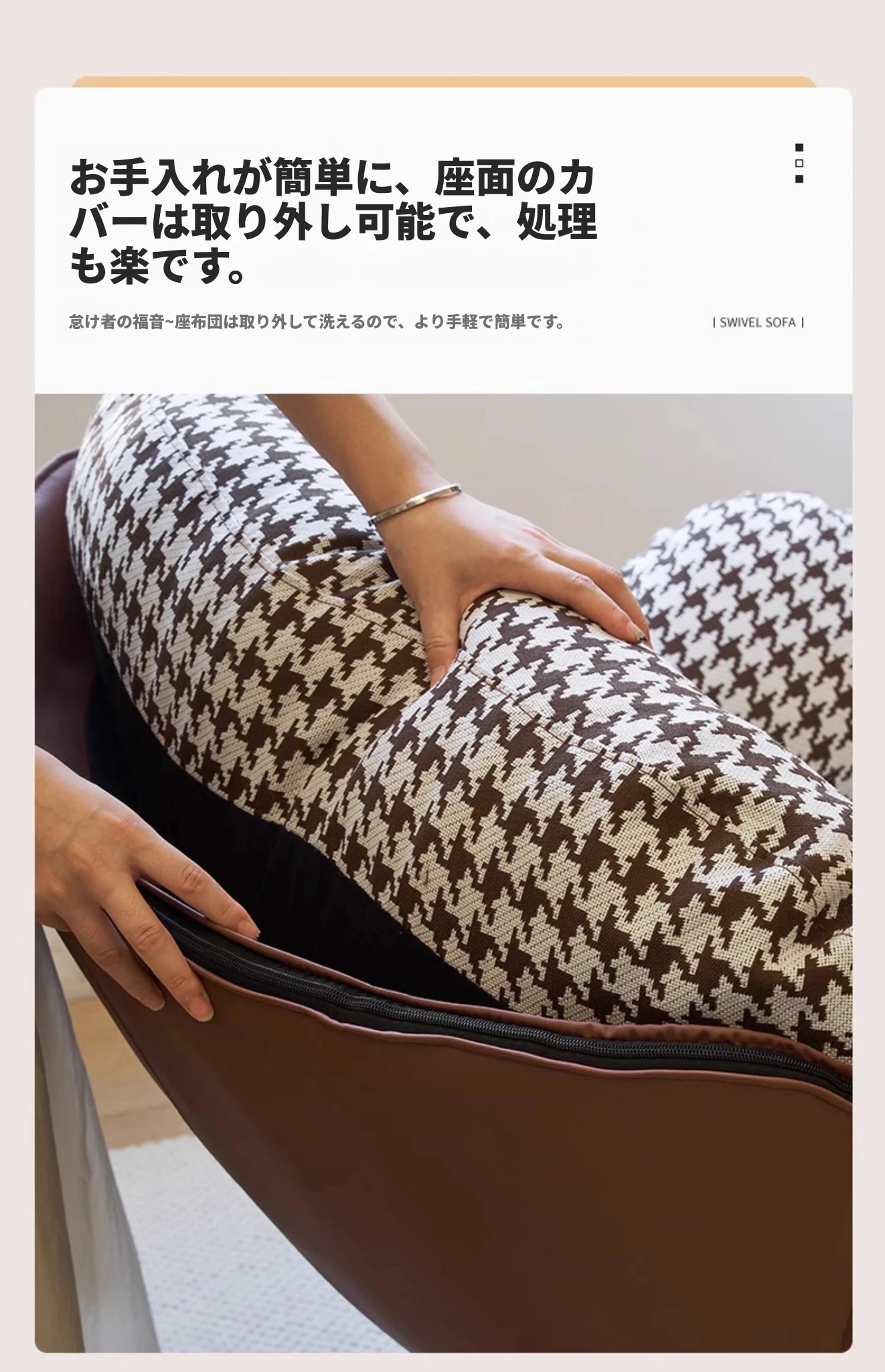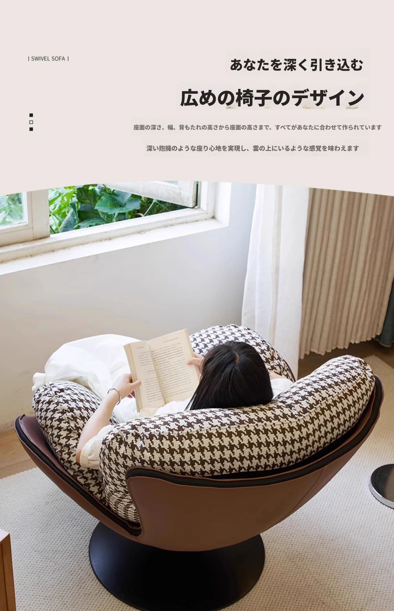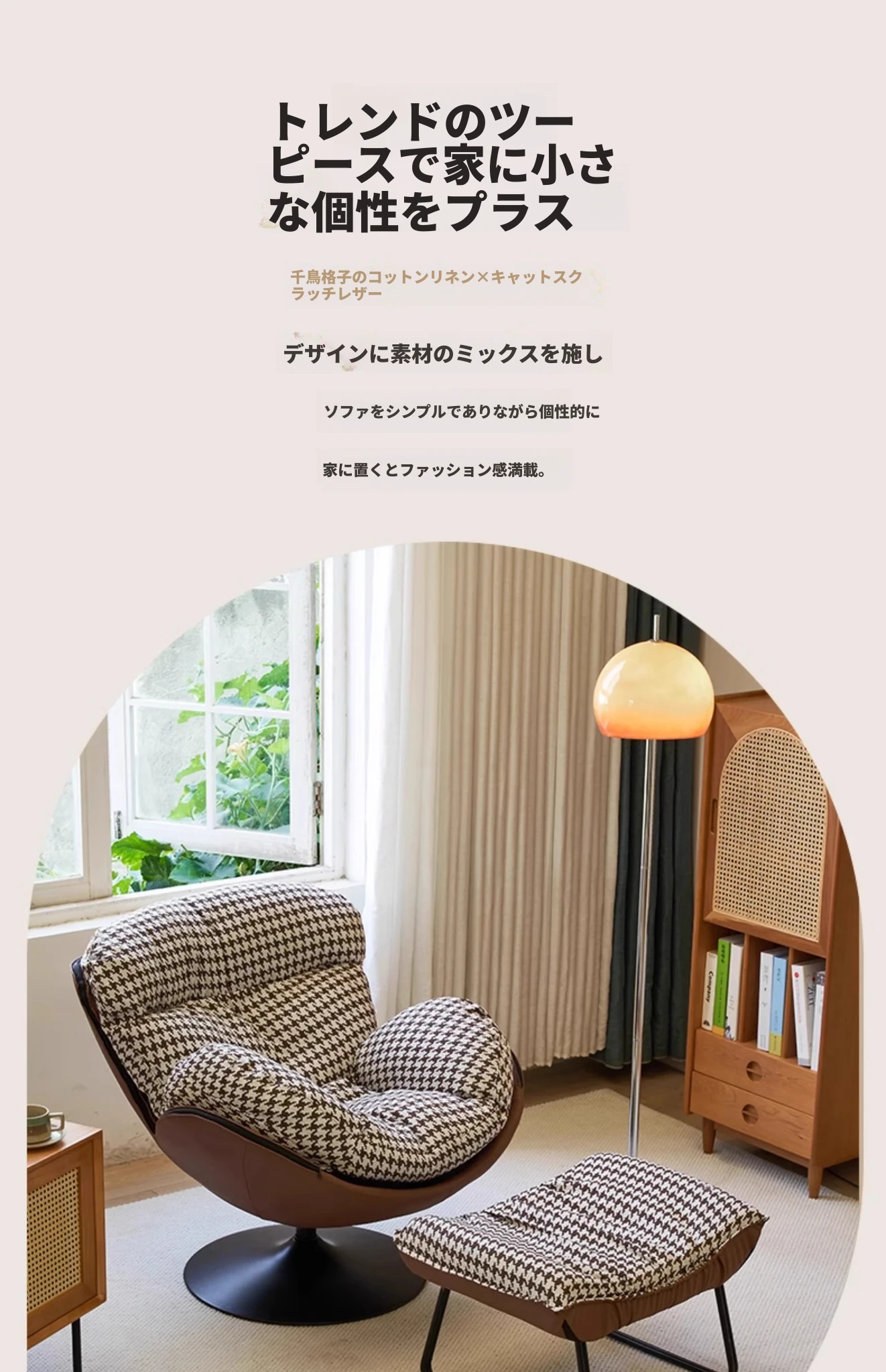 ベイジュモダン一人用エッグシェイプソファ、千鳥格デザインの麻布製、家庭用リラックスソファ、レトロスタイル、360度回転可能で快適なひとときを提供!