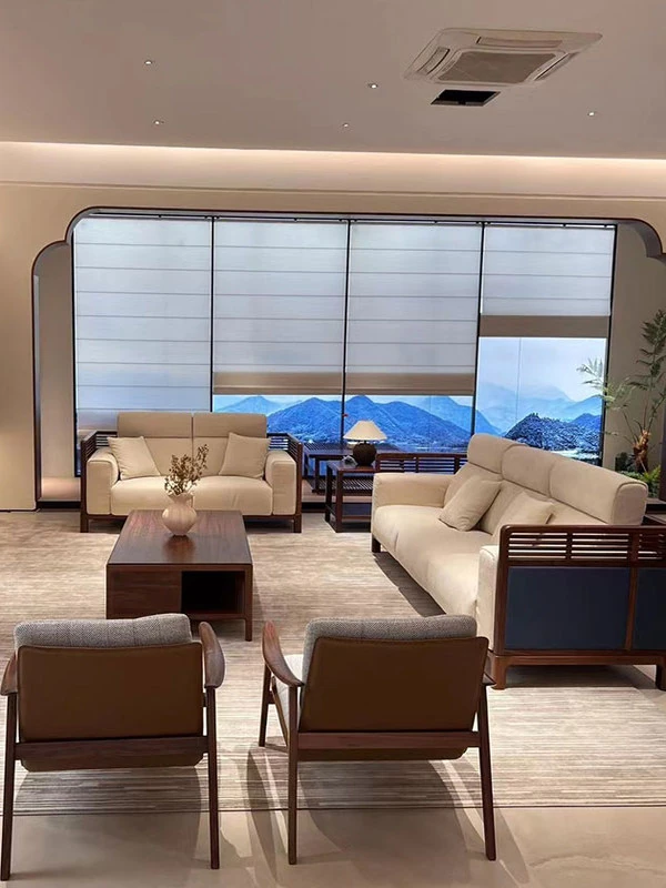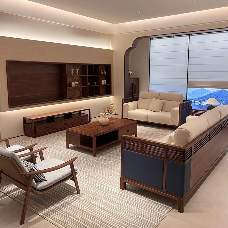 新中式スタイルの天然木とファブリック製ソファセット - モダンでシンプル、ラグジュアリーなイタリアンミニマリズムを取り入れた高級リビングルームに最適な別荘用ソファ。居心地の良さとスタイルを兼ね備えた一品。