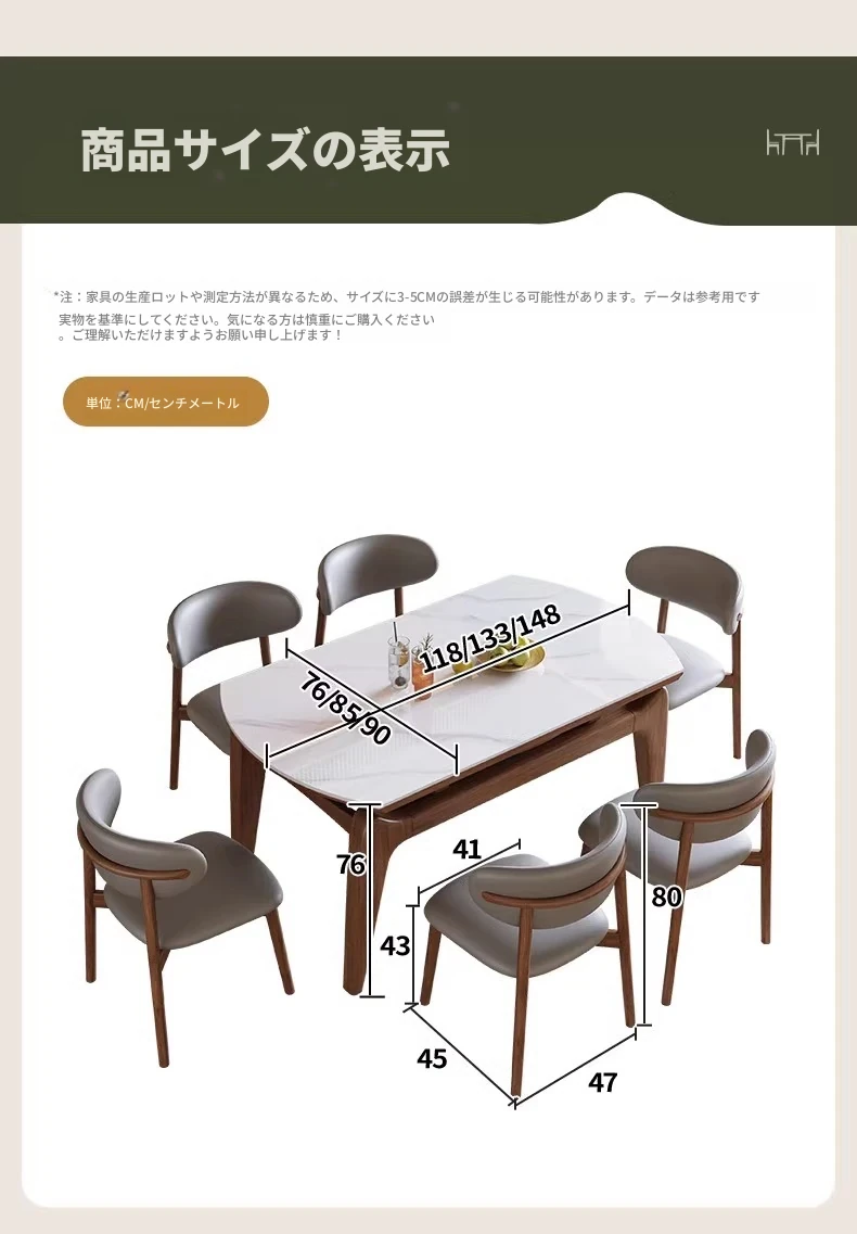 12mm岩石板-1.35m無垢材ダイニングテーブル6脚