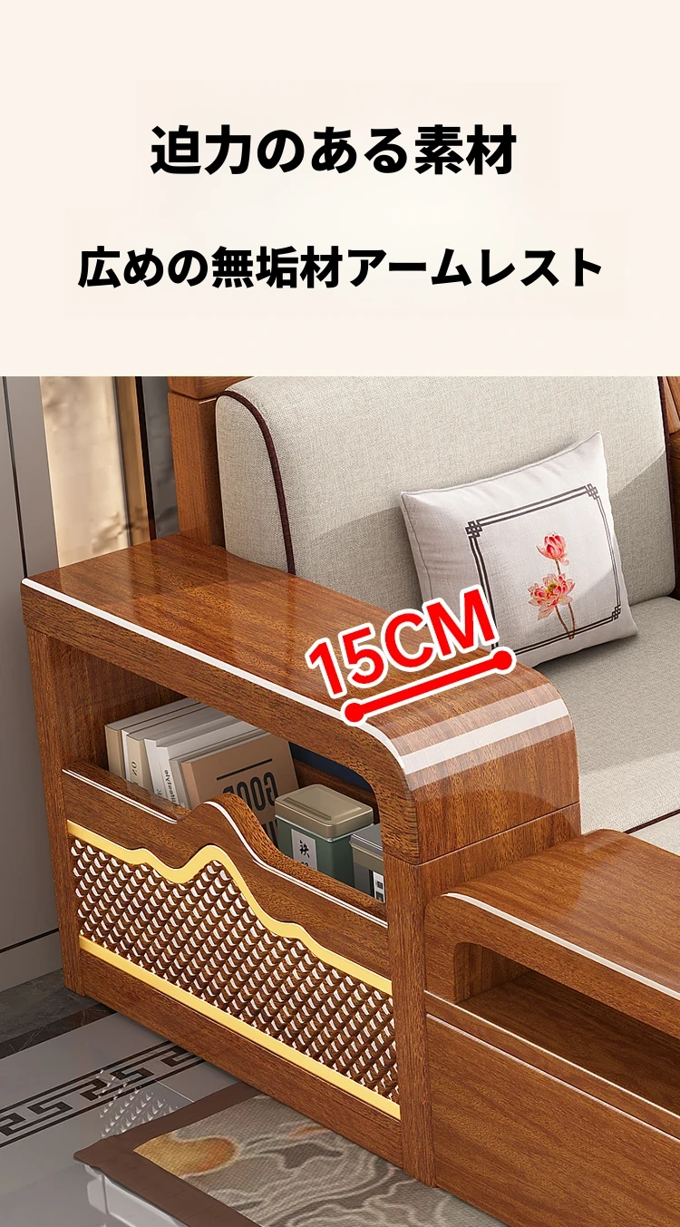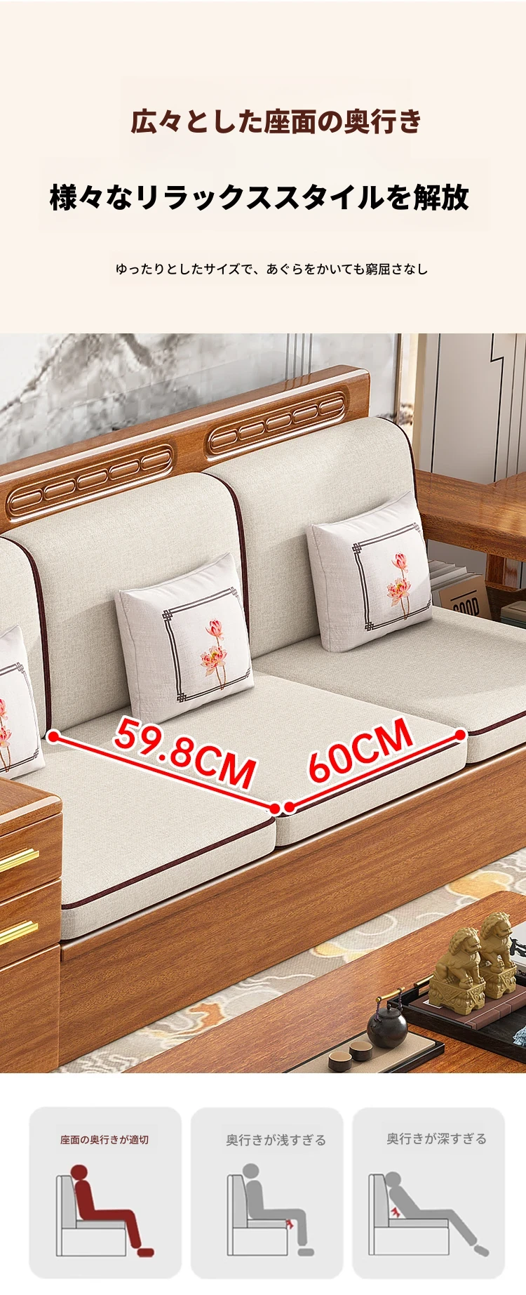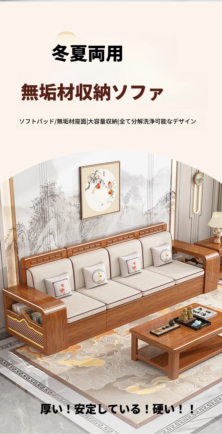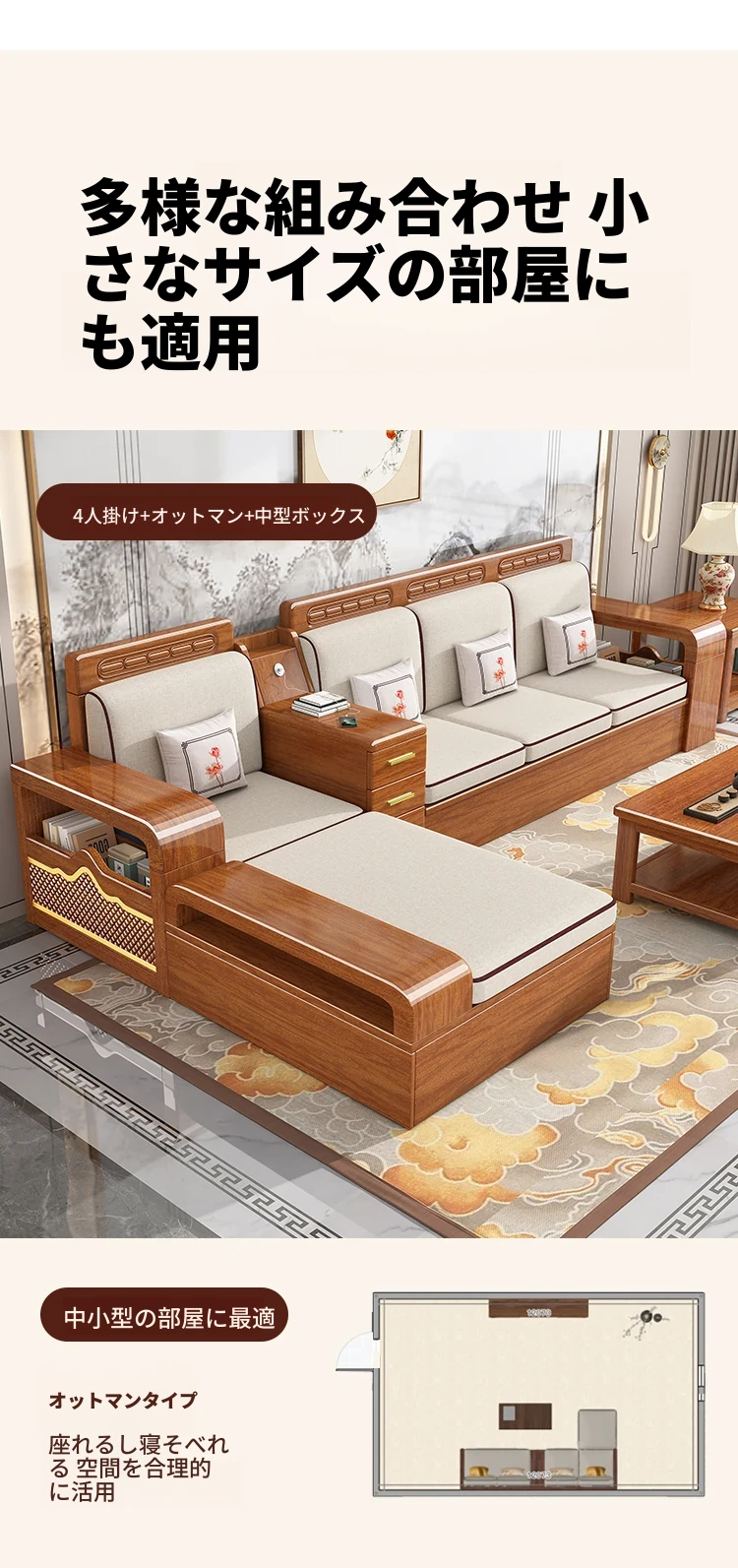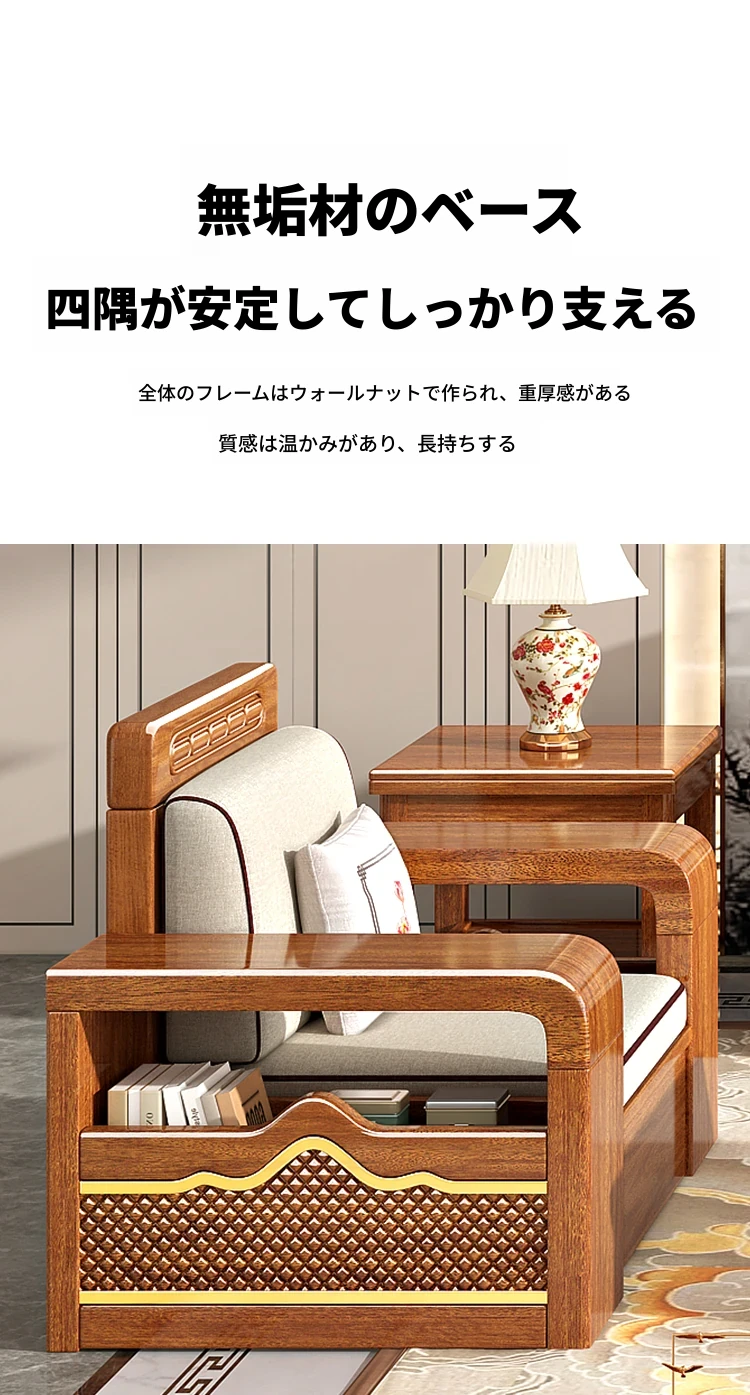 モダンシンプルな無垢材ソファ|ナチュラルなウォールナット色のコンパクト3人掛け・4人掛け組み合わせソファ|小さなリビングにもぴったり!快適な座り心地でおしゃれな空間を演出します。