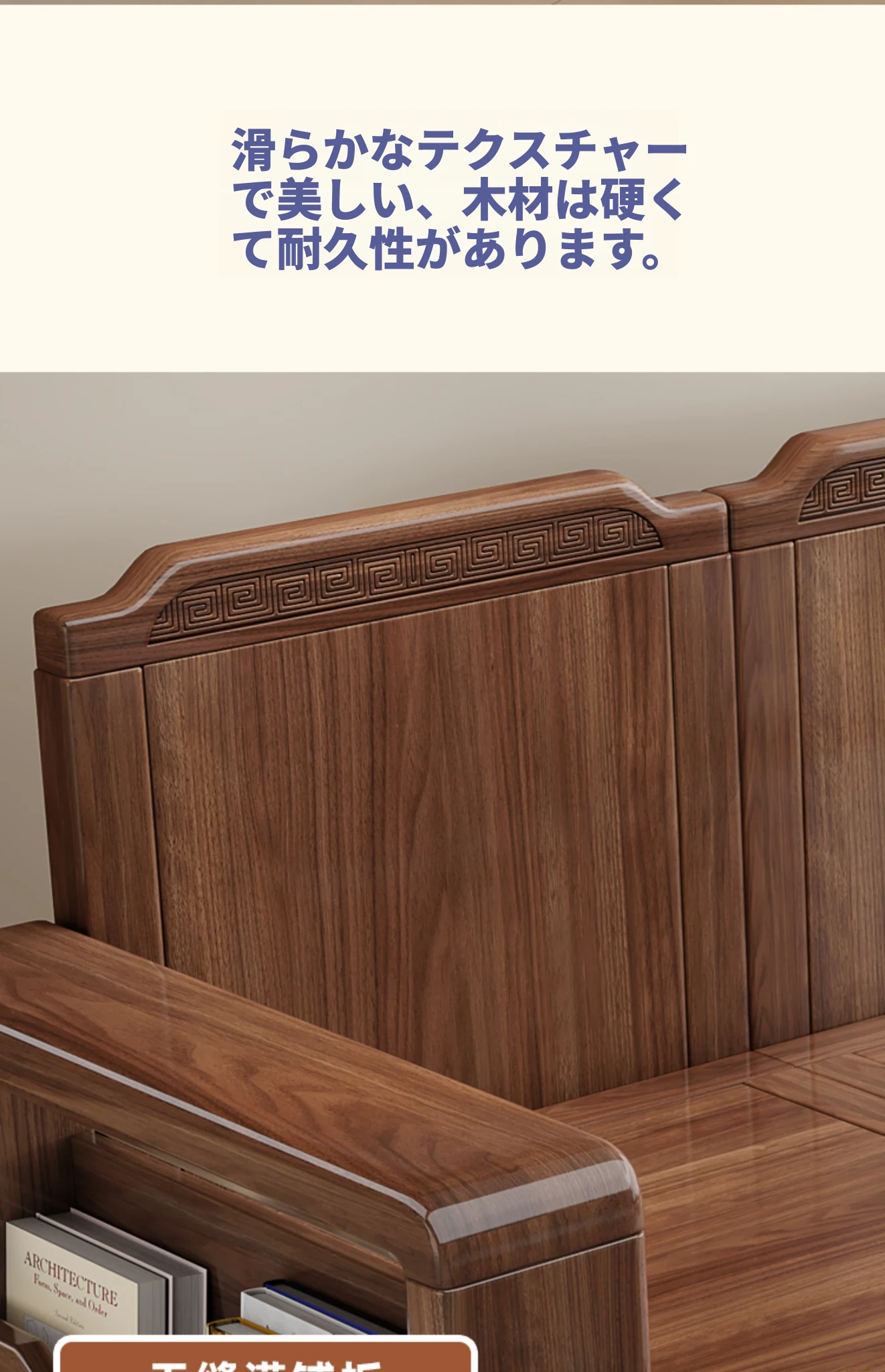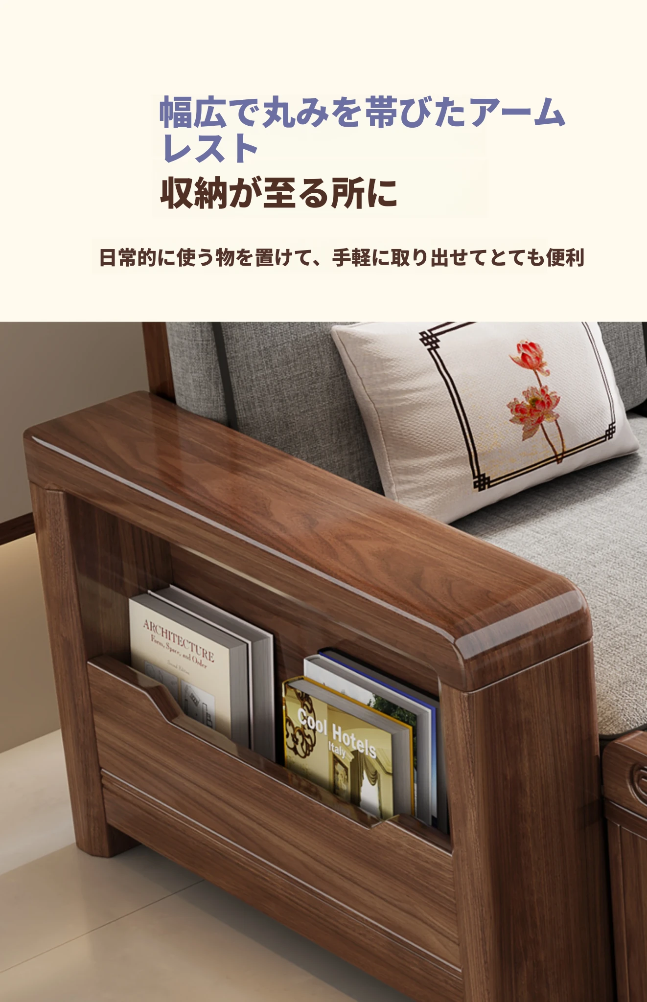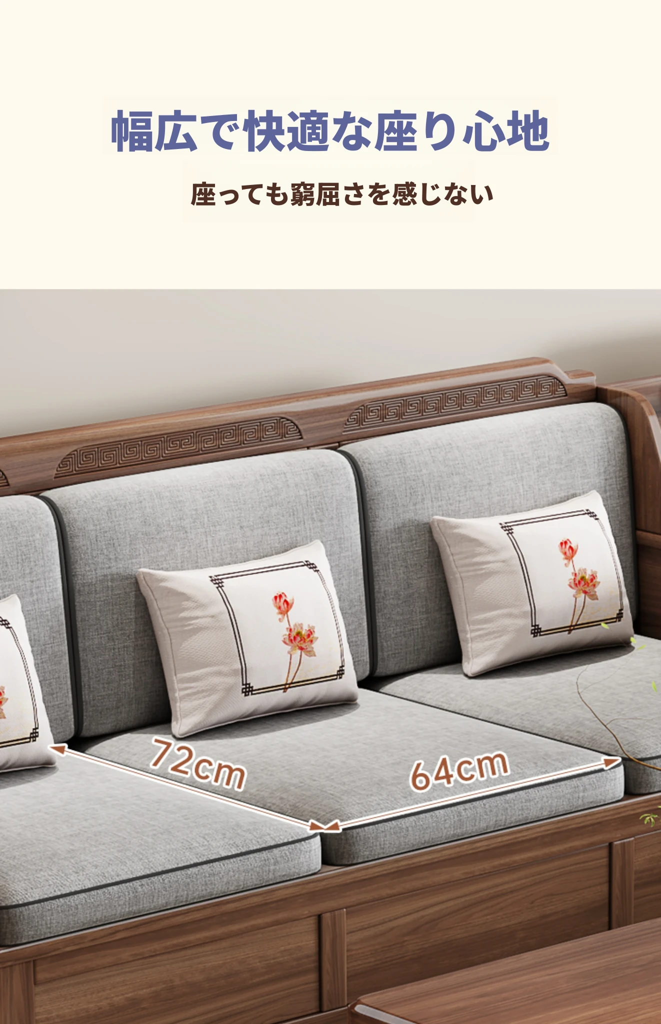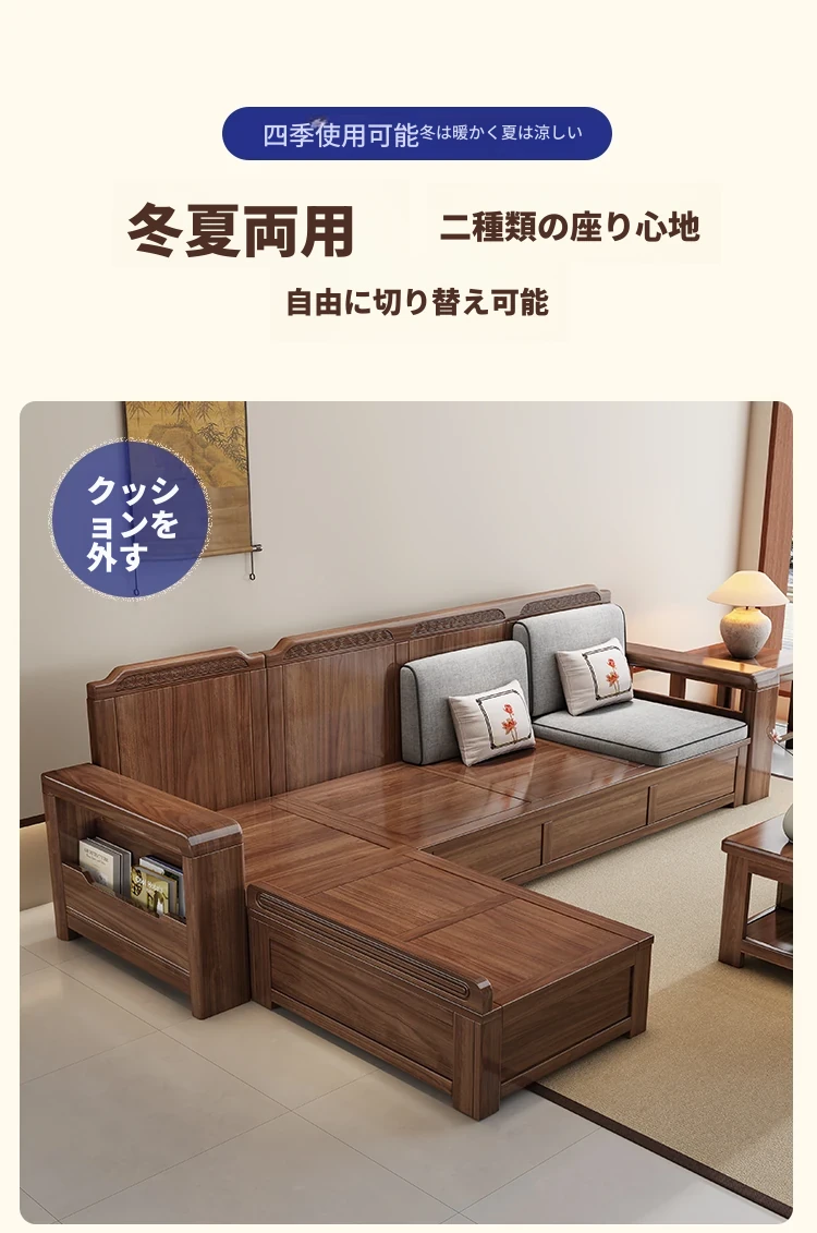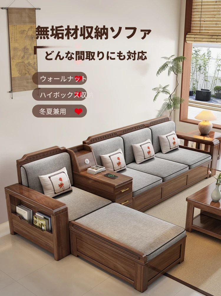 新中式ブラックウォールナット無垢材ソファ|リビングにぴったり!冬夏兼用のストレージ付きデザイン|工場直販でお得に手に入れるチャンス!