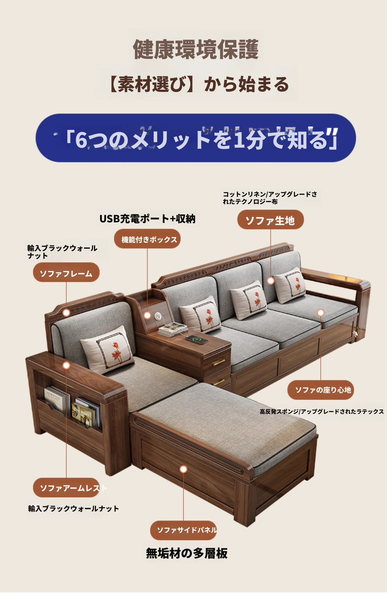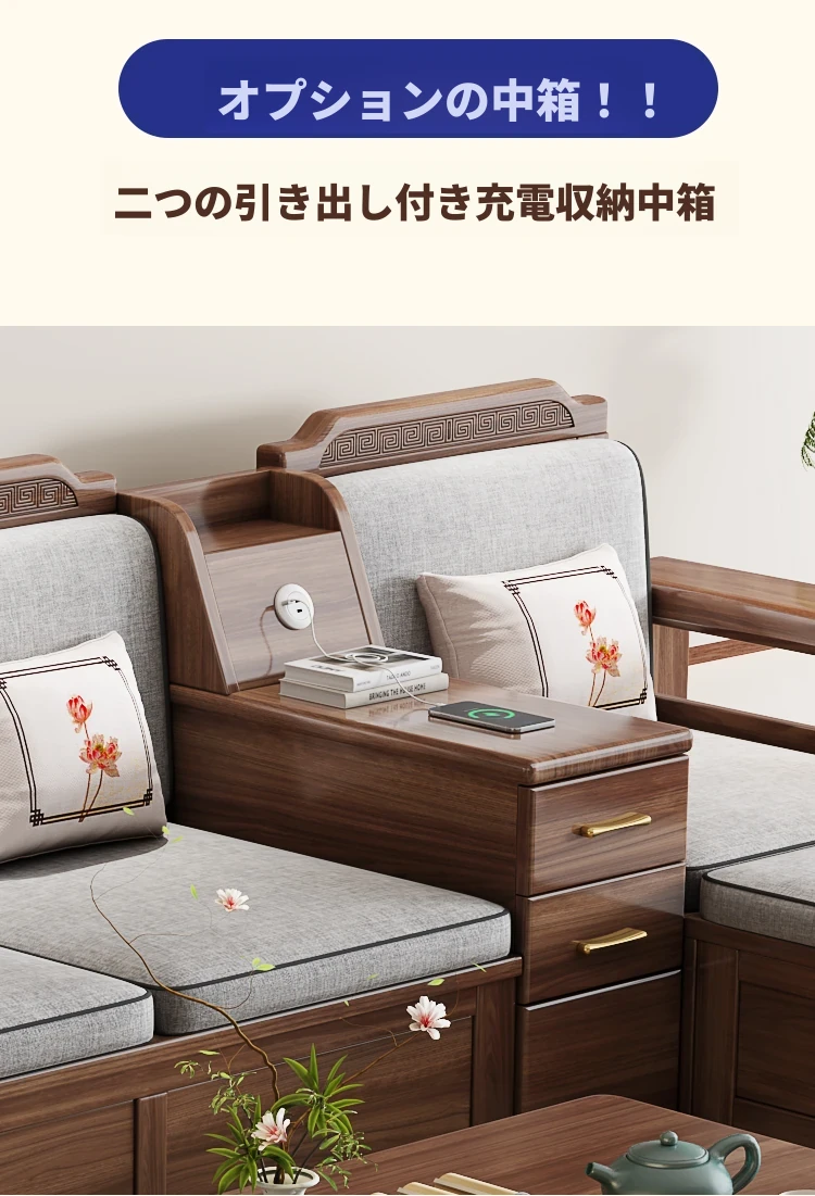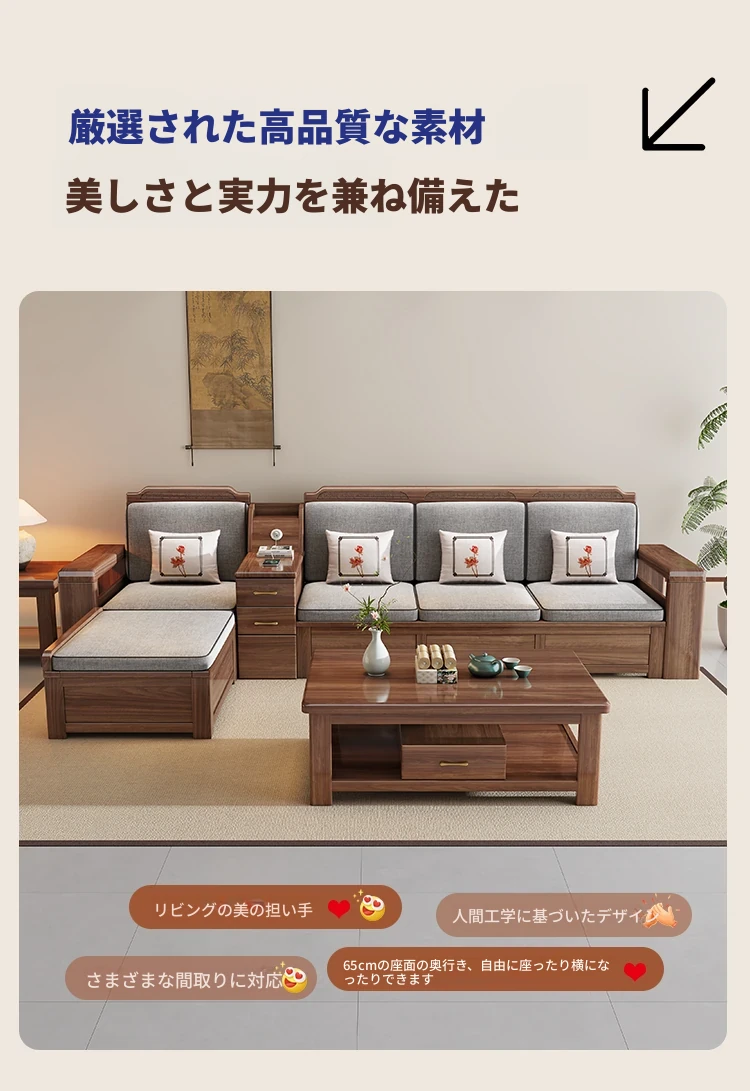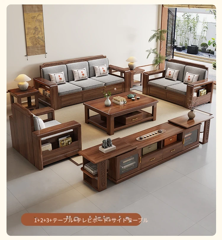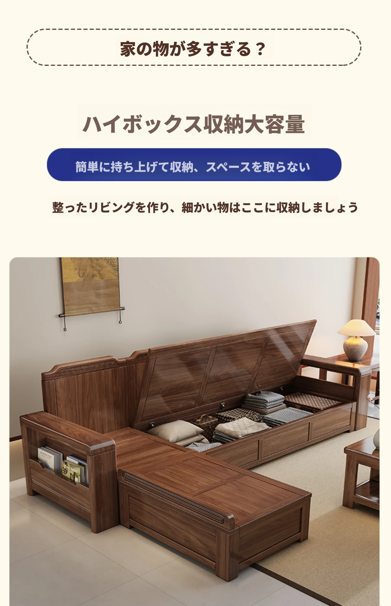 新中式ブラックウォールナット無垢材ソファ|リビングにぴったり!冬夏兼用のストレージ付きデザイン|工場直販でお得に手に入れるチャンス!