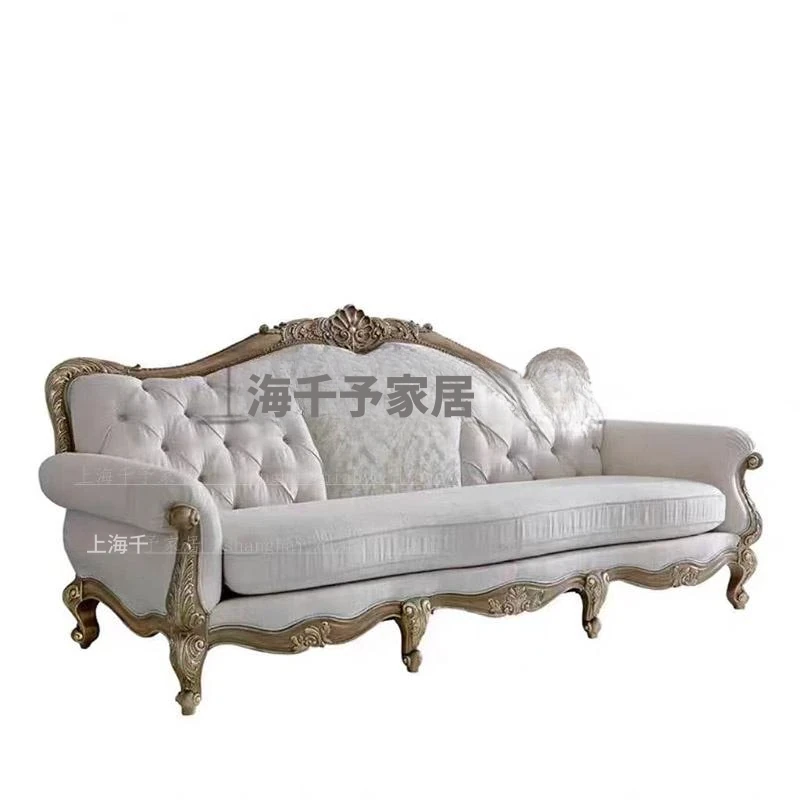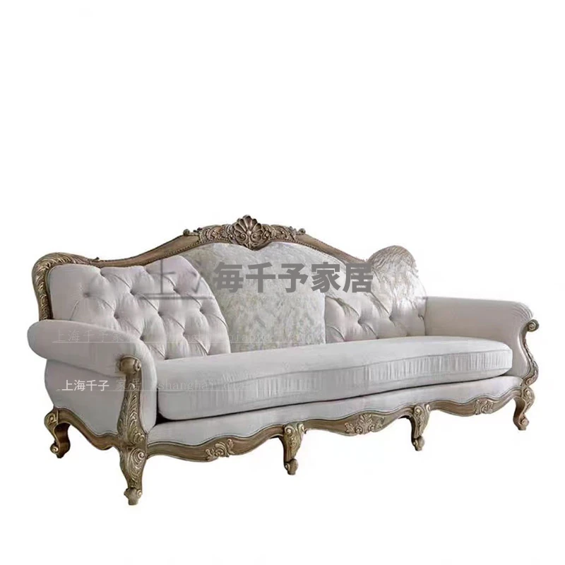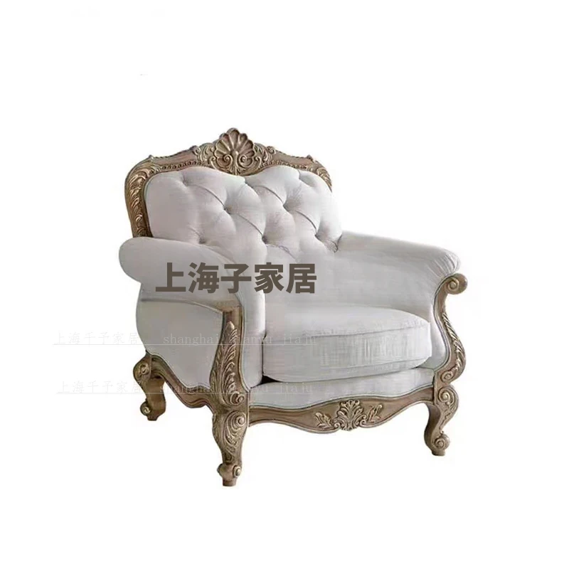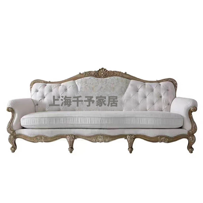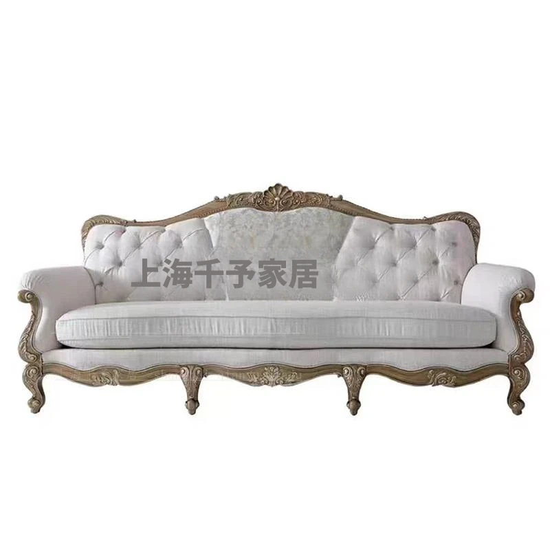 アメリカンカントリー風の無垢材シングルソファ - ヴィンテージ感漂う3人掛けリビングソファ、フレンチアンティークスタイルのファブリックソファで、心地よい空間を演出!