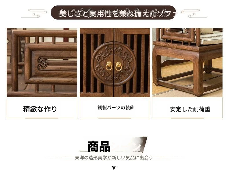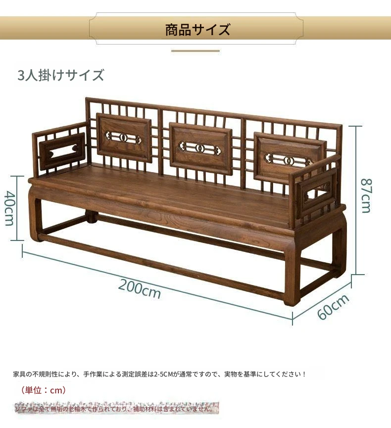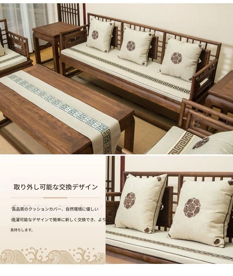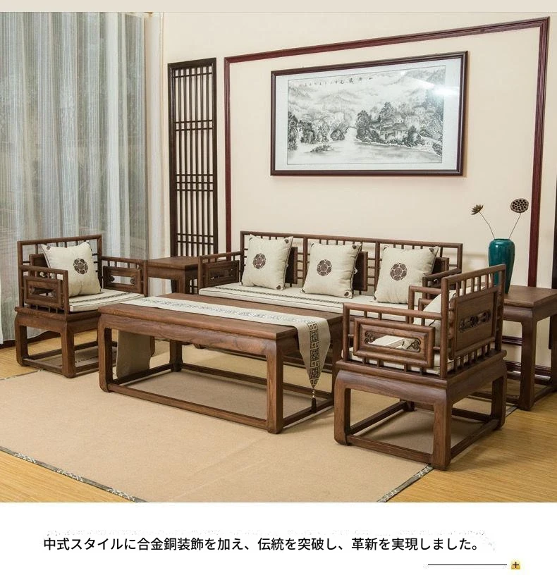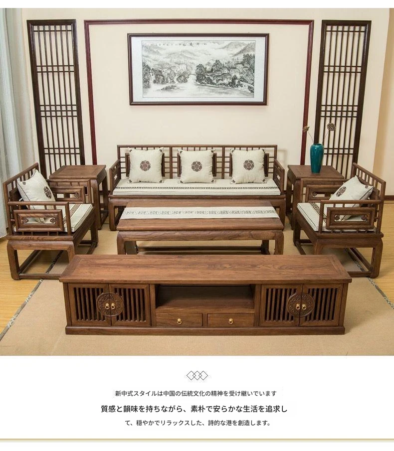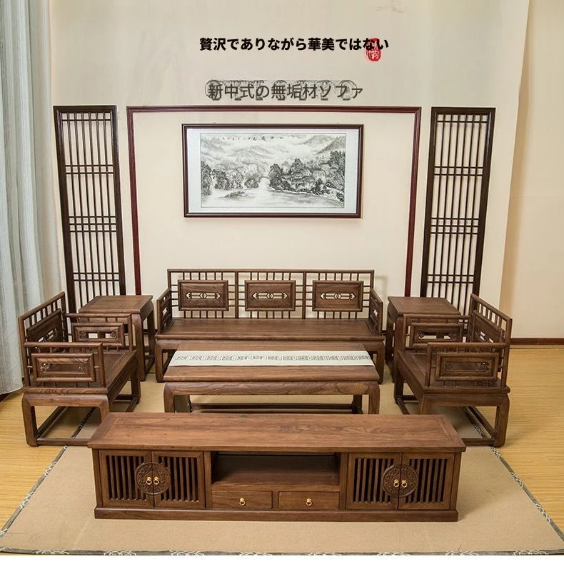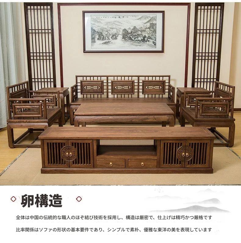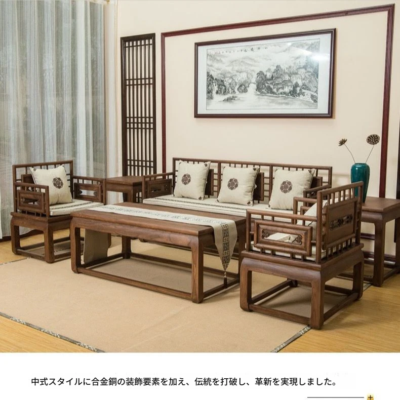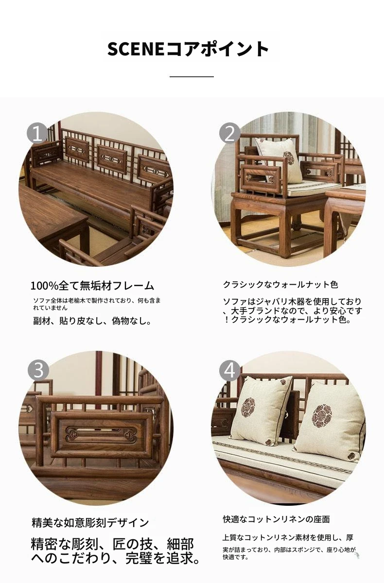 新登場!魅力溢れる新中式実木ソファセット - 老榆木製、家庭にぴったりのスタイリッシュなリビング家具、6人掛けでゆったり快適!おしゃれな空間を演出します。