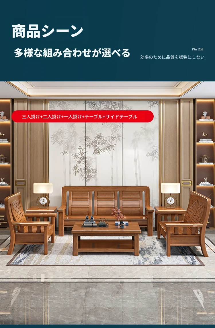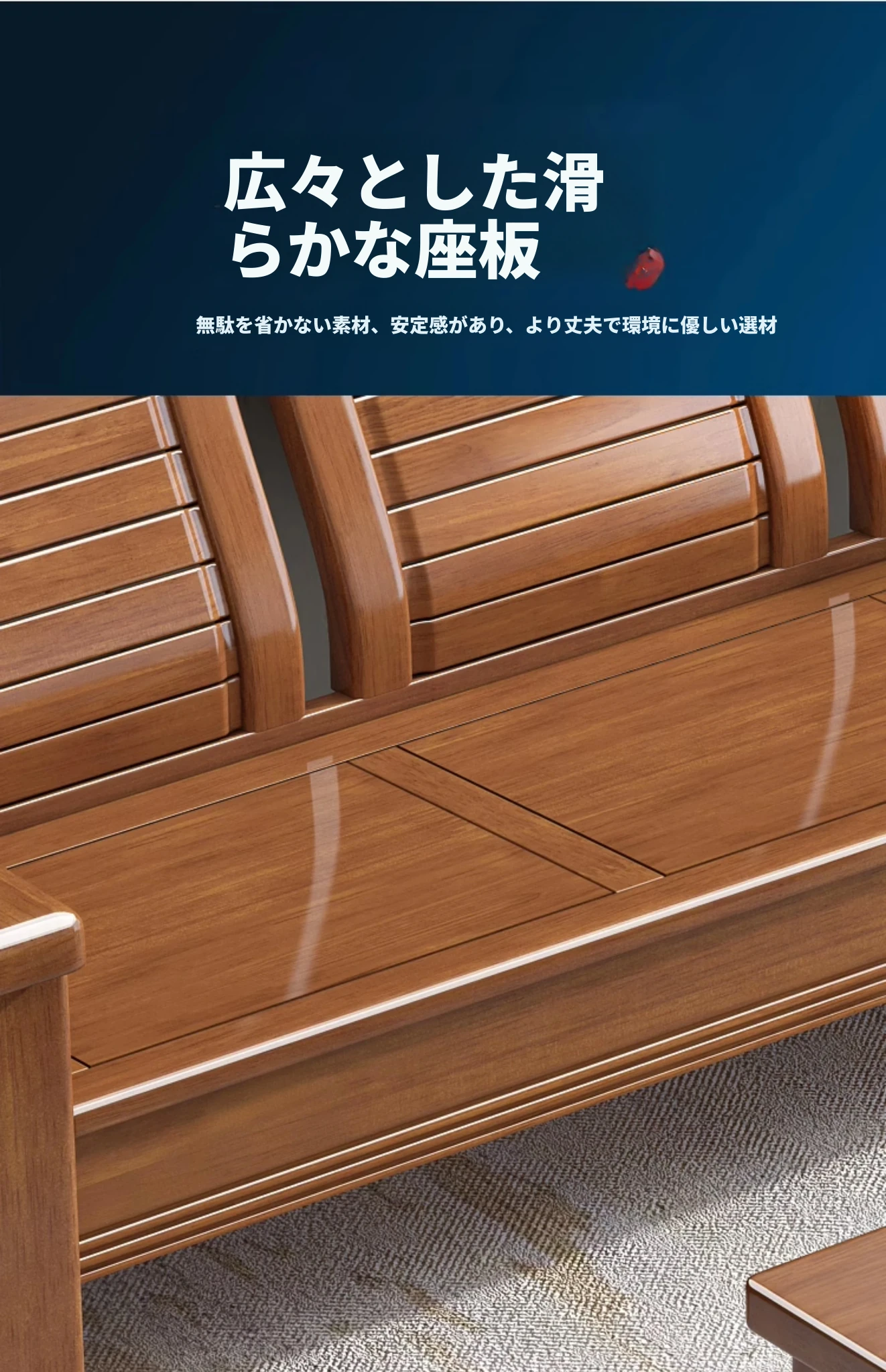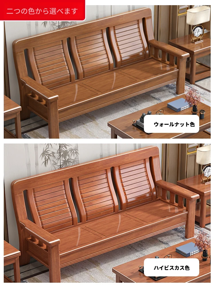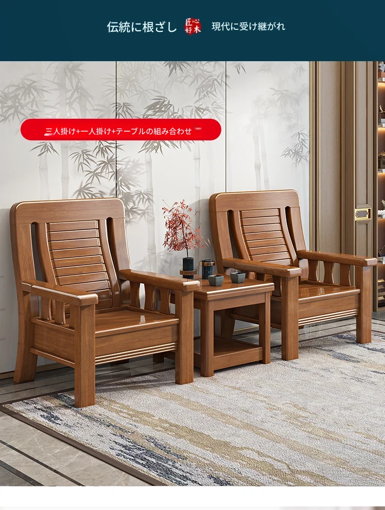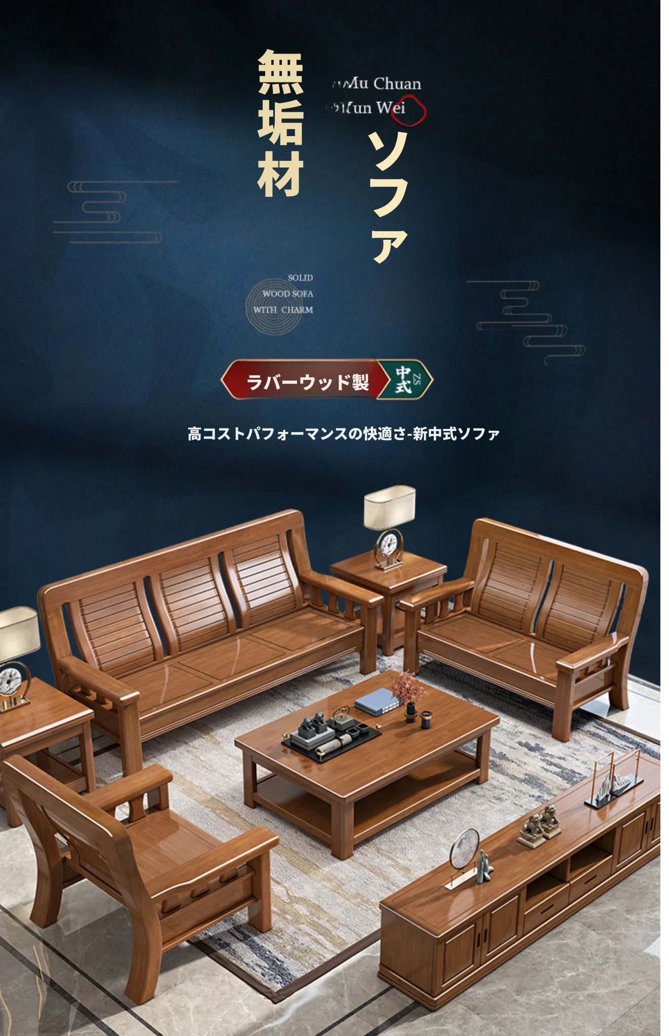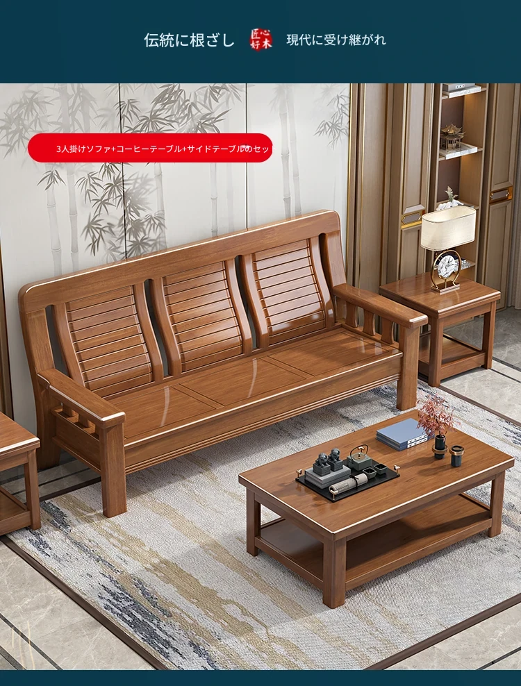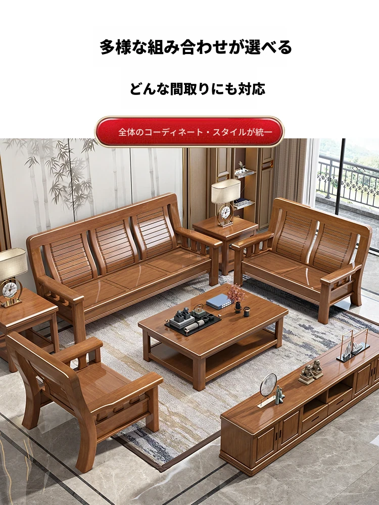 中華風の無垢材ソファ|家族でくつろげるリビング用|オールシーズン対応、春秋にも最適な原木クールチェア付きコンビネーションソファ