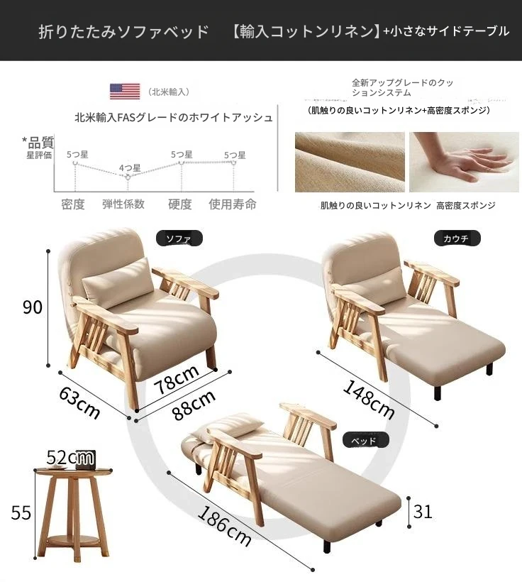 【アップグレード版】折りたたみソファベッド(輸入コットンリネン)+小丸テーブル