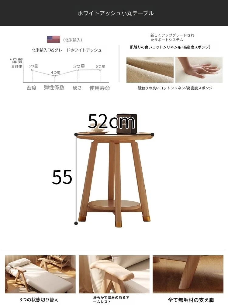 【ダイヤモンド型無垢材】シングルソファベッド(輸入コットンリネン)+小丸テーブル