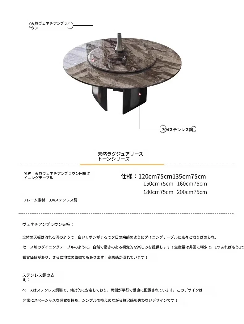 135CM輸入ヴェネツィアブラウン天然ラグジュアリーストーンダイニングテーブル+80CM回転盤