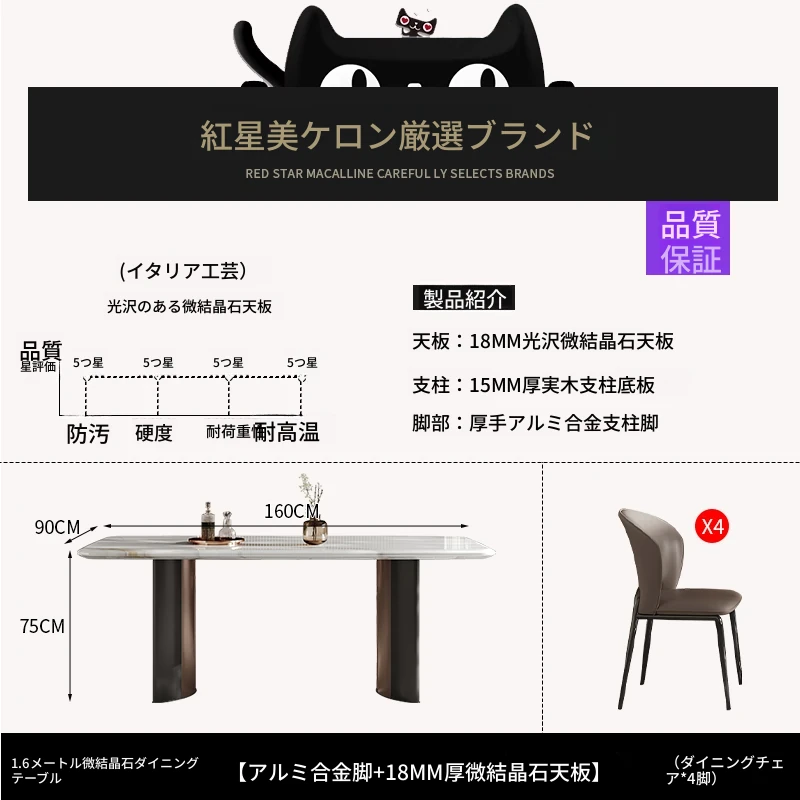 1.6メートル微晶石ダイニングテーブル【アルミ合金テーブル脚+18MM厚微晶石天板】(ダイニングチェア*4脚) 1.6メートル微晶石ダイニングテーブル【アルミ合金テーブル脚+18MM厚微晶石天板】(ダイニングチェア*4脚)