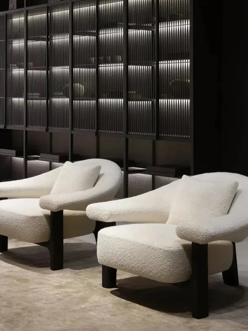 イタリアンラグジュアリーシングルソファーチェア|デザイナーズ不動産ショールーム・ホテル受付用|北欧ミニマリズムのリラックスチェア|洗練されたデザインで心地よいひとときを提供します!