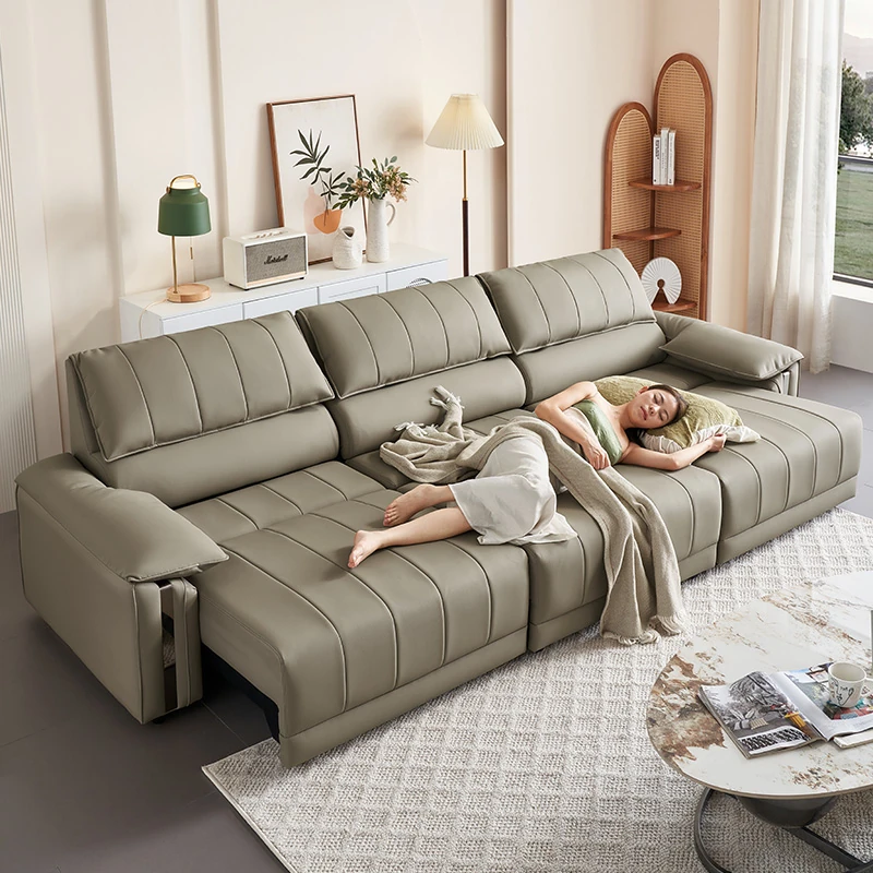 大人気!イタリアンミニマルデザインの電動機能付き本革ソファ。リビングや小さな部屋にも最適!伸縮可能なソファベッドで、快適な空間を実現します。あなたの家にスタイリッシュな魅力をプラス!