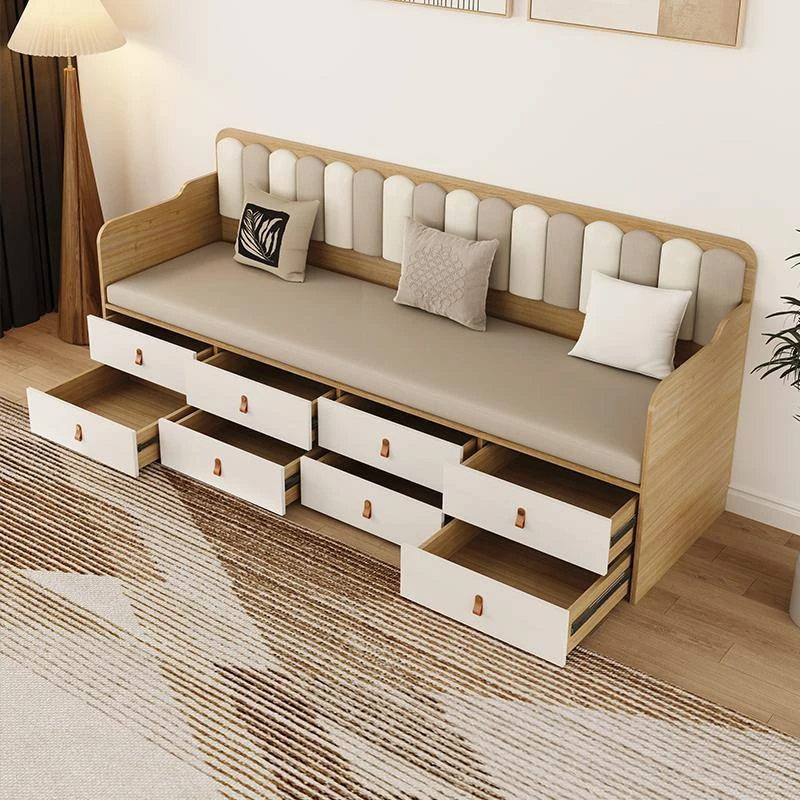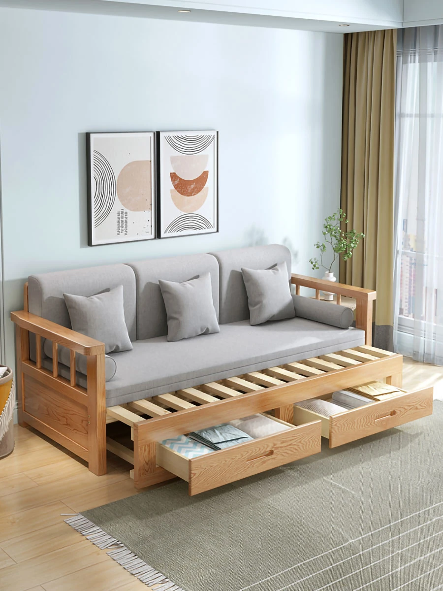 北欧スタイルのオーク製折りたたみソファベッド|小型アパートや賃貸に最適!引き出し収納付きで、シンプルで洗練されたデザイン。快適なリビング空間を実現!