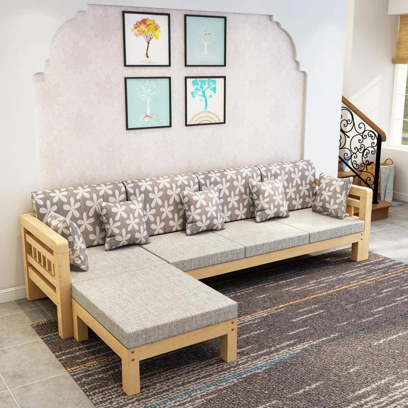 松W8シンプル無垢材ソファ - 小さなリビングにぴったりのコーナー付き三人掛けカウチソファ!温かみのあるデザインで、居心地の良い空間を演出します。高品質の木材を使用し、耐久性も抜群です。