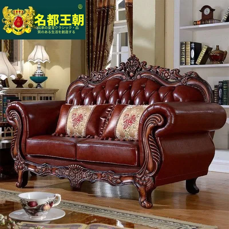 欧風本革ソファー 高級本牛革使用 123型リビングセット 豪華なヴィラスタイル アンティークアメリカンデザインの無垢材家具